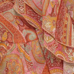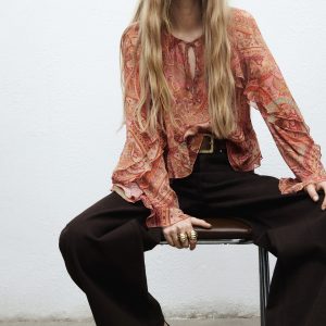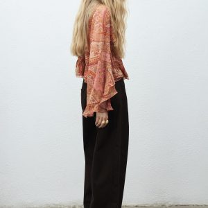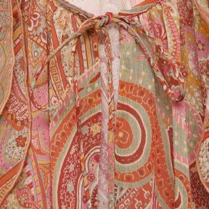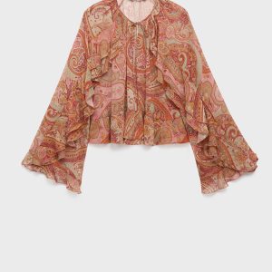 With an oversized design, this garment features a round neck and a paisley print. The long flared sleeves are complemented by ruffles, while the tie closure at the neck gives it a distinctive air
