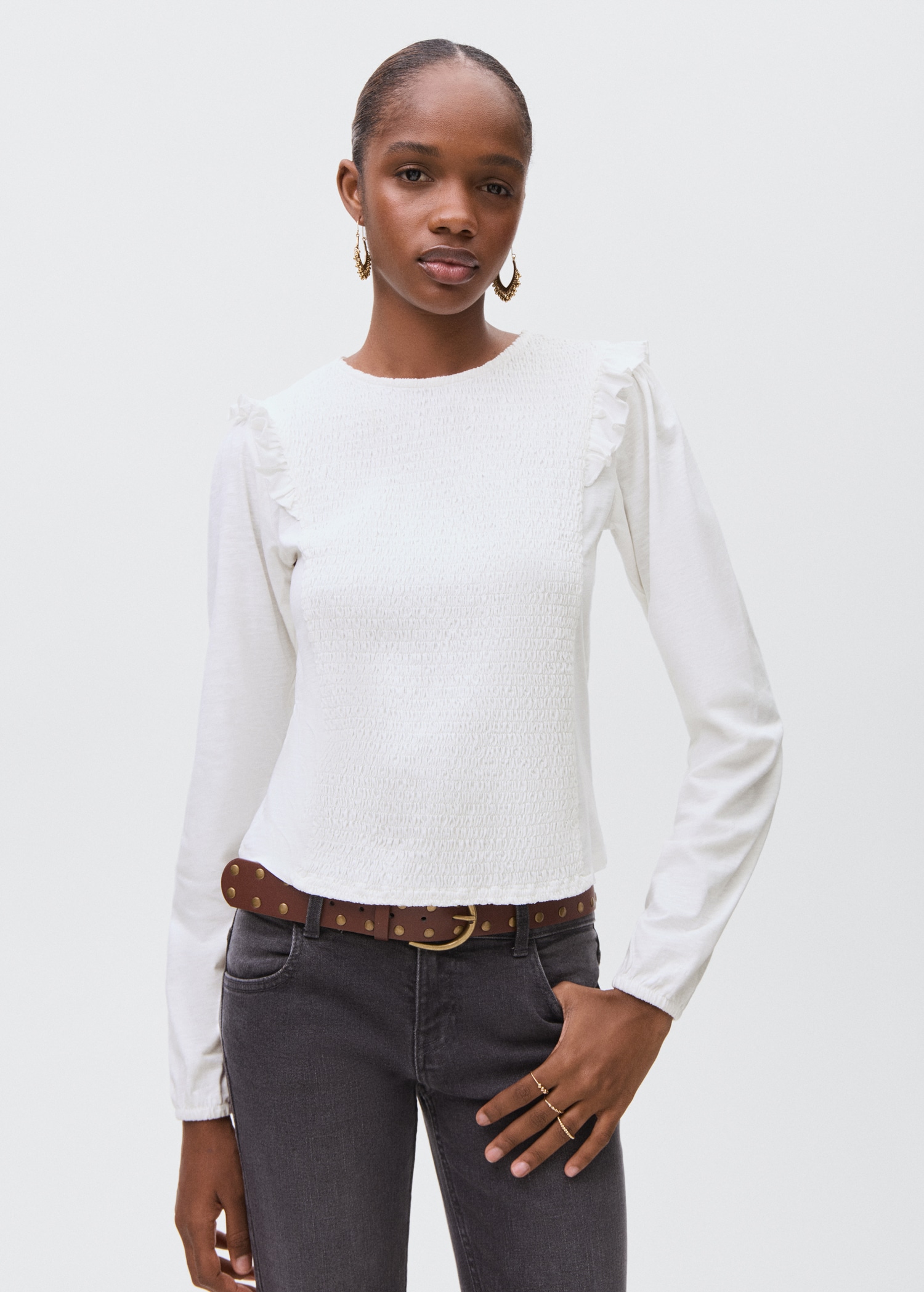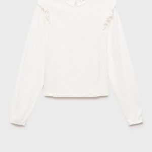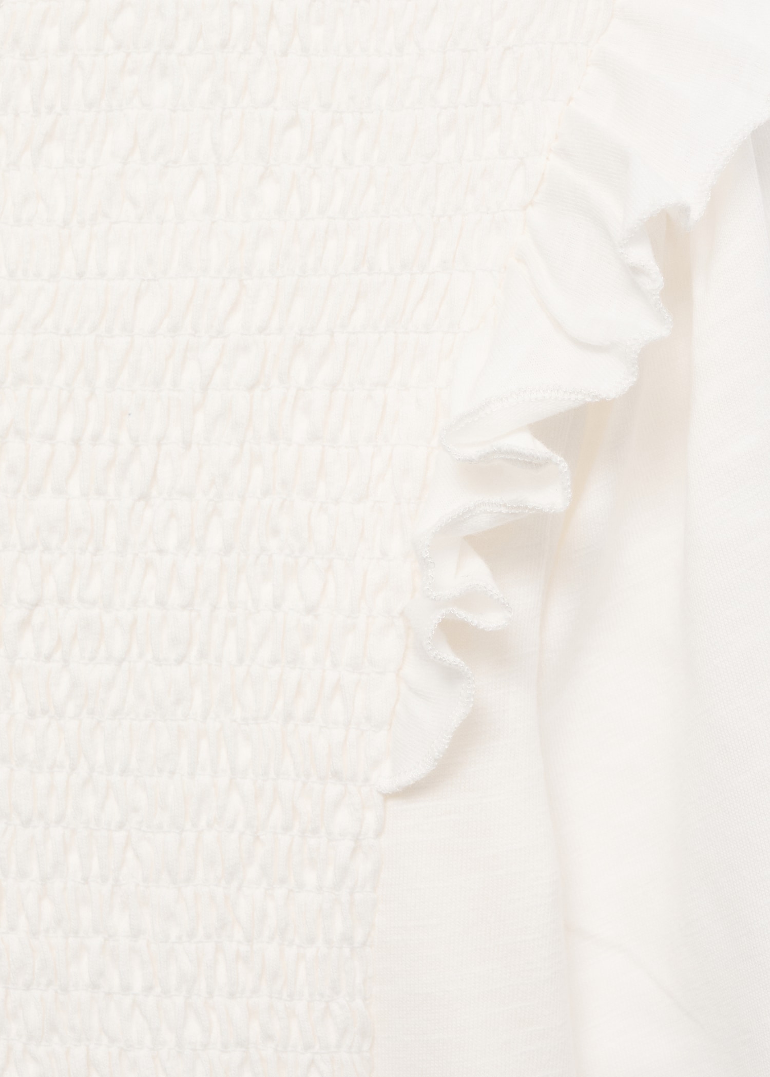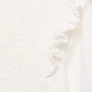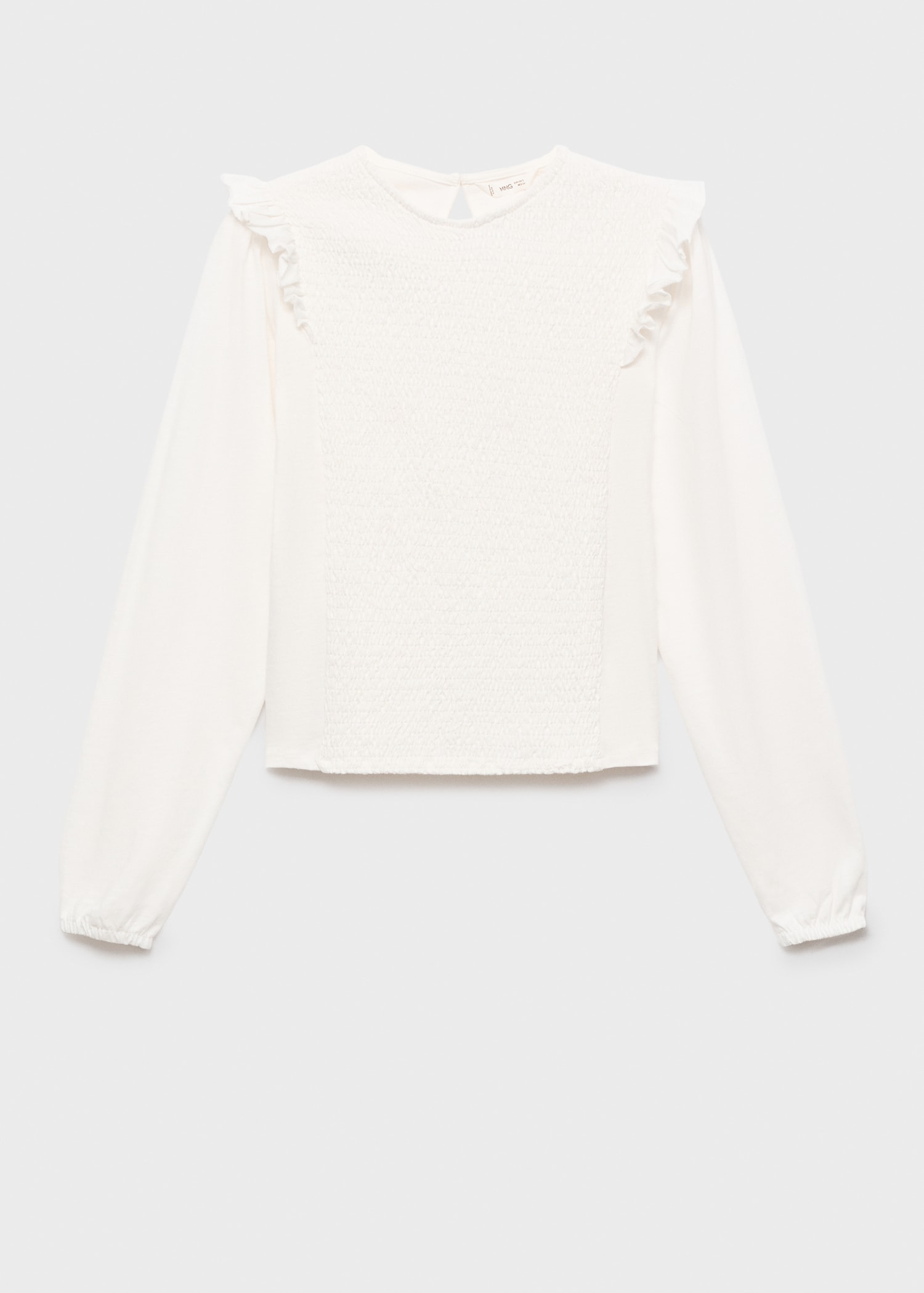 100% cotton fabric. Straight Design. Honeycomb gathered fabric. Crew neck. Long Sleeve. Ruffles on the shoulders. Button closure at the back