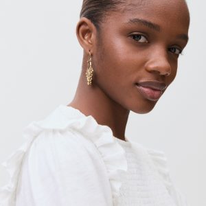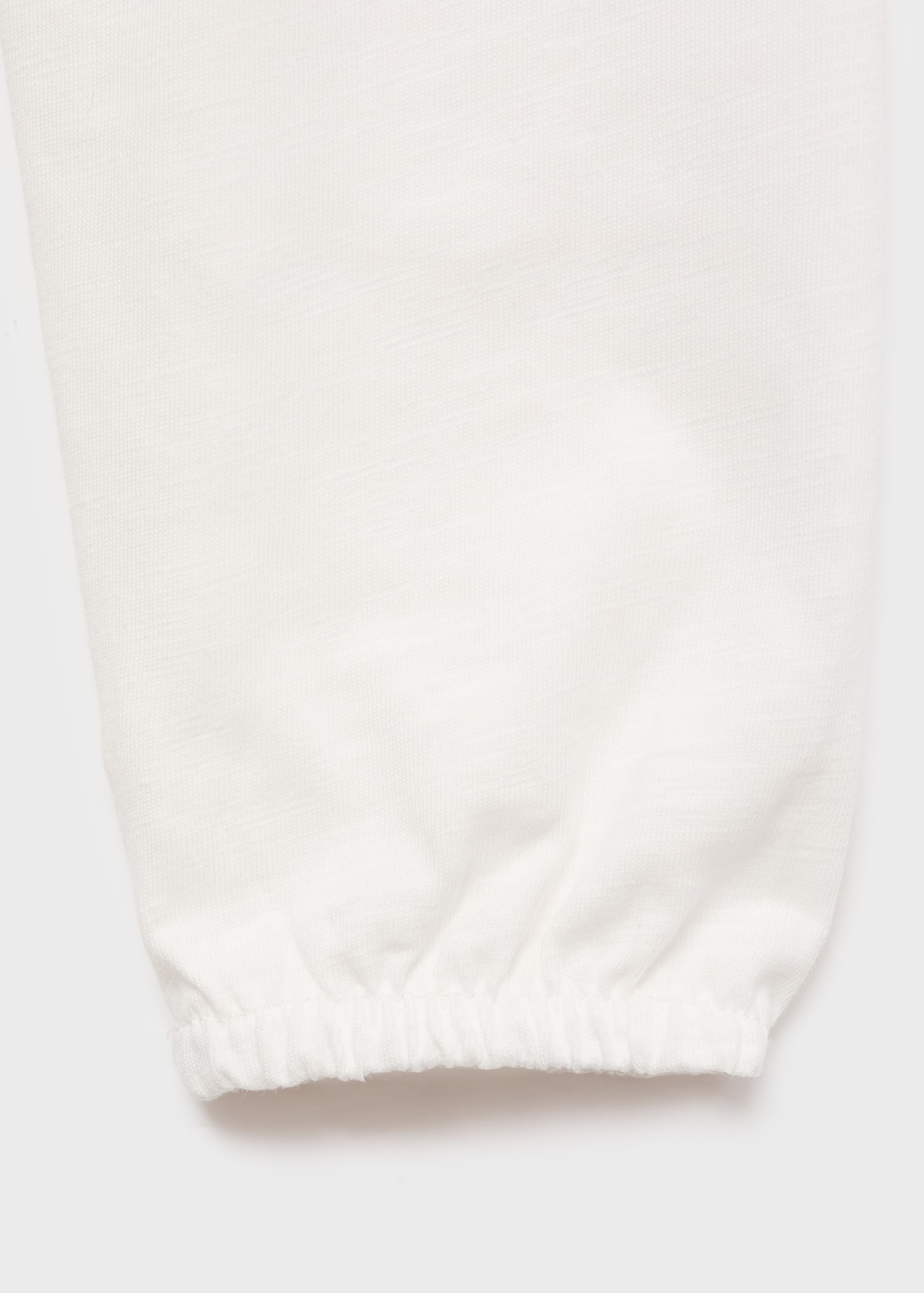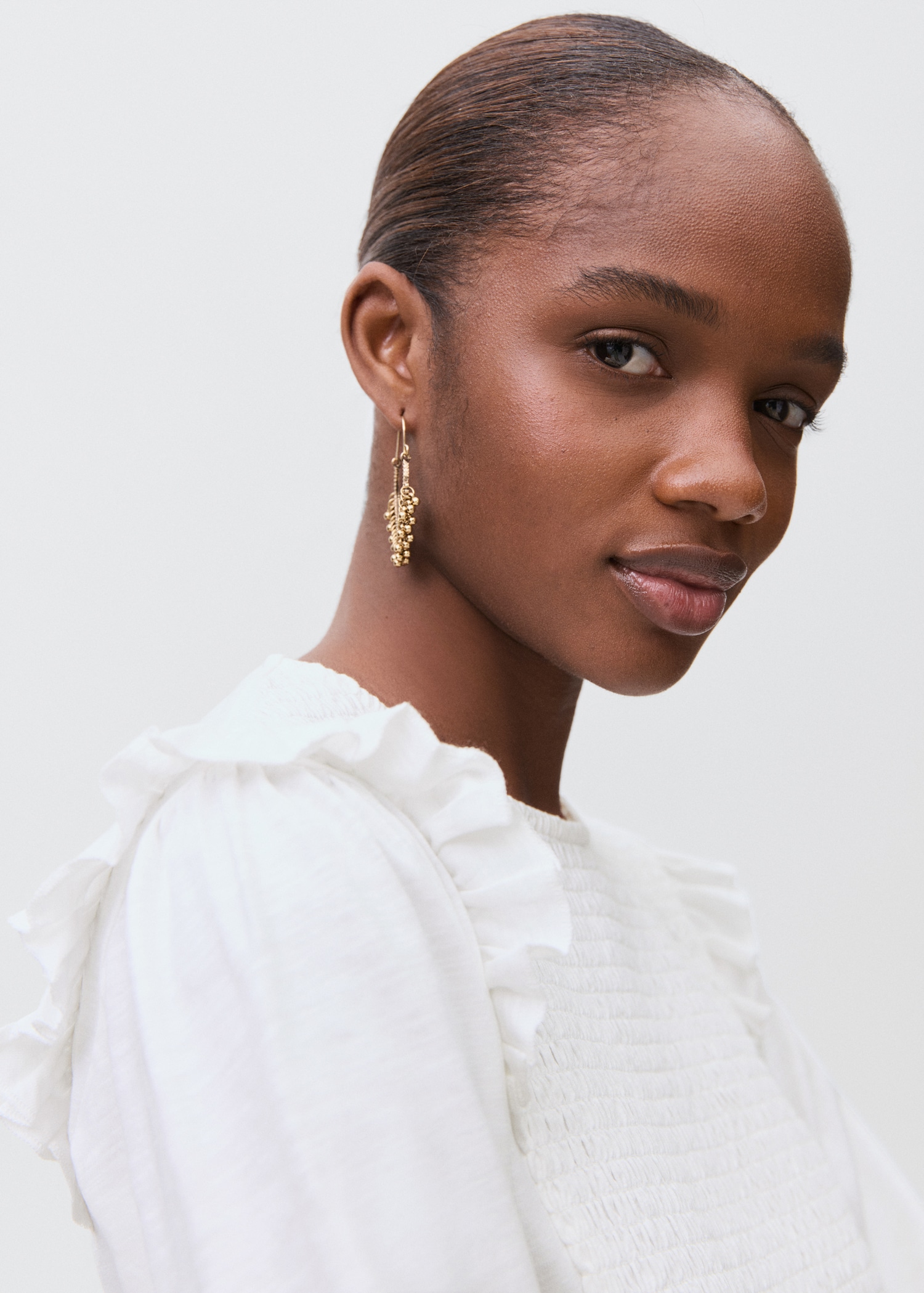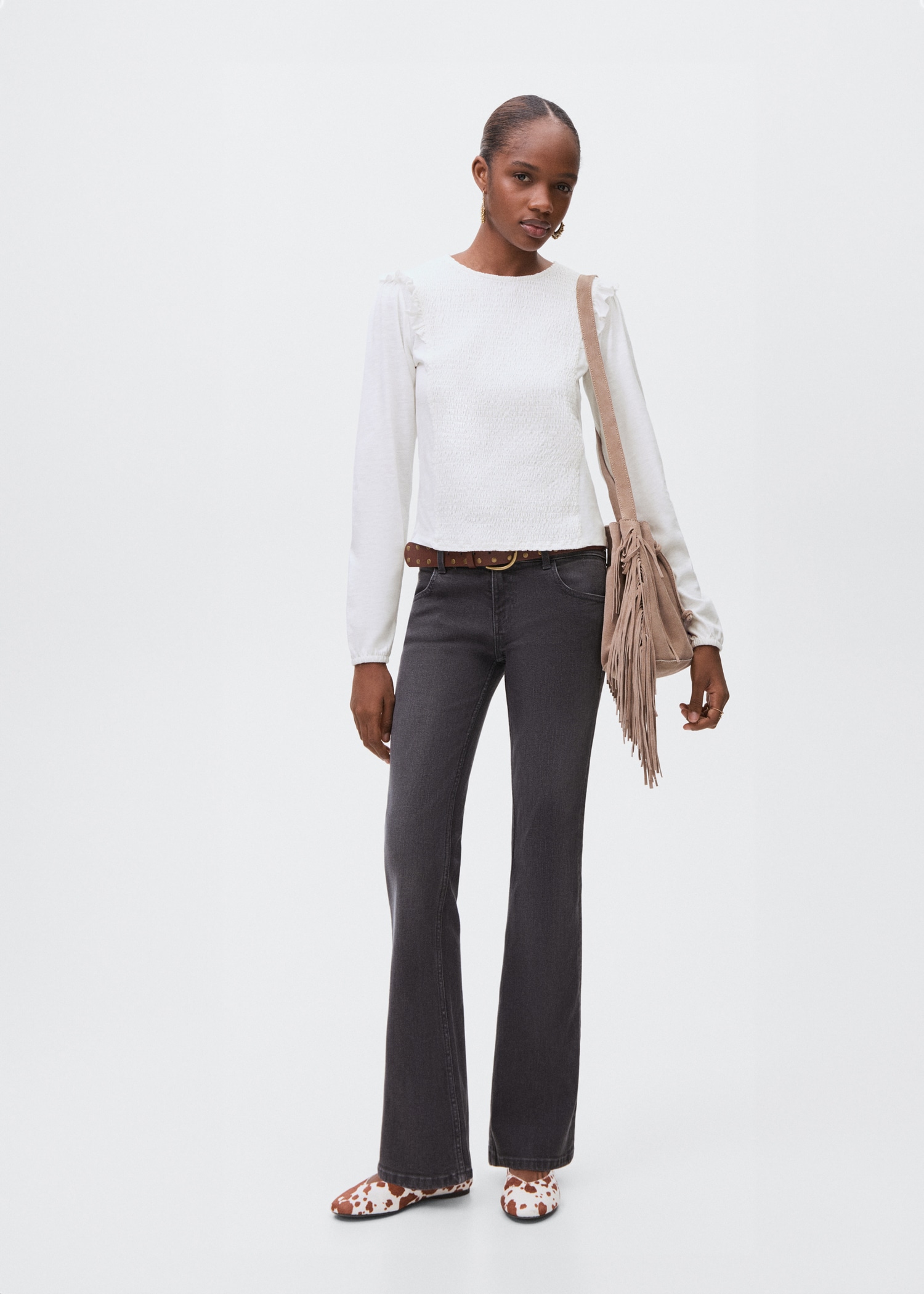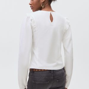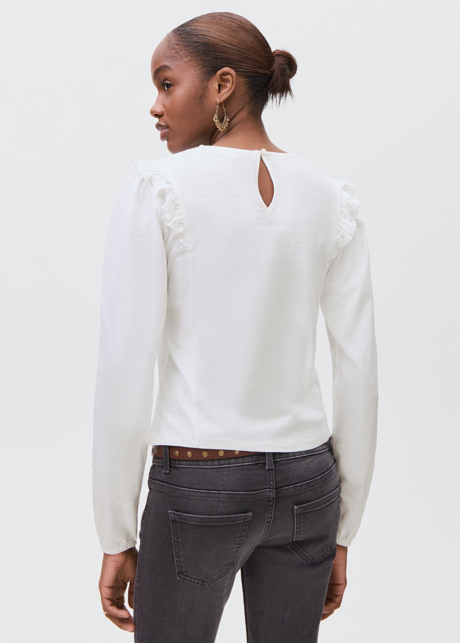 100% cotton fabric. Straight Design. Honeycomb gathered fabric. Crew neck. Long Sleeve. Ruffles on the shoulders. Button closure at the back