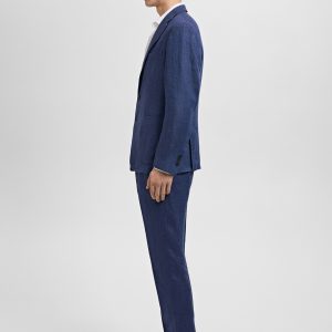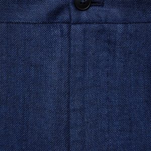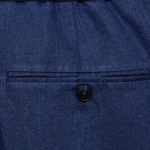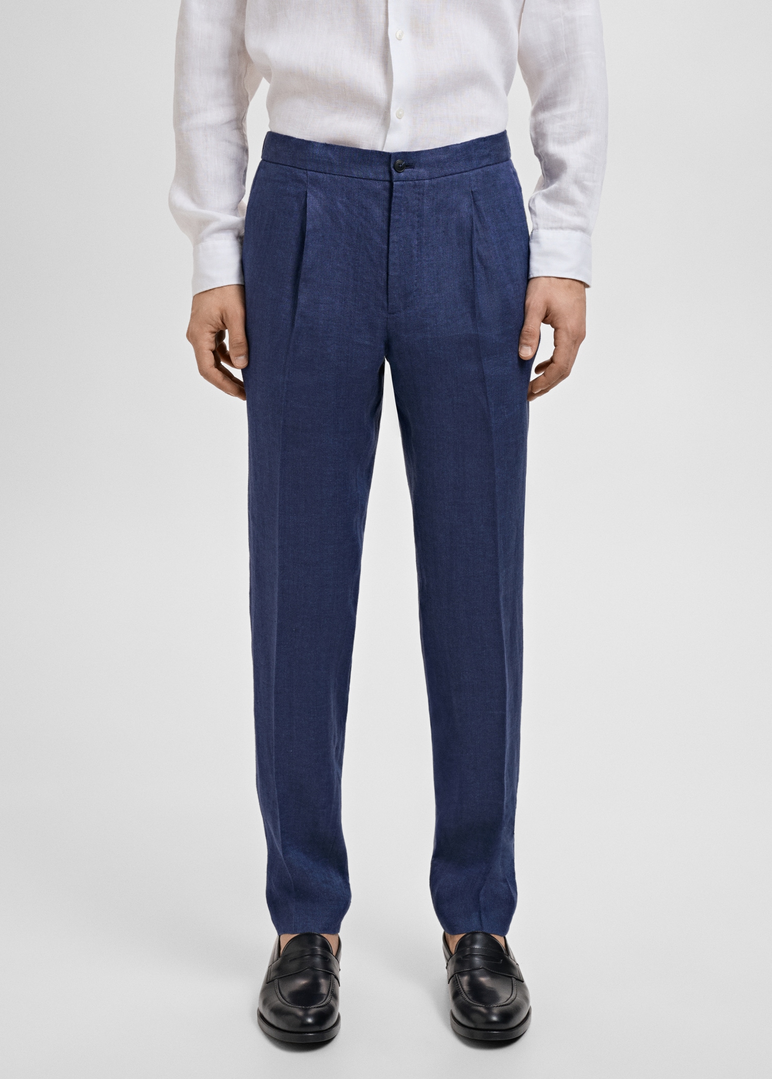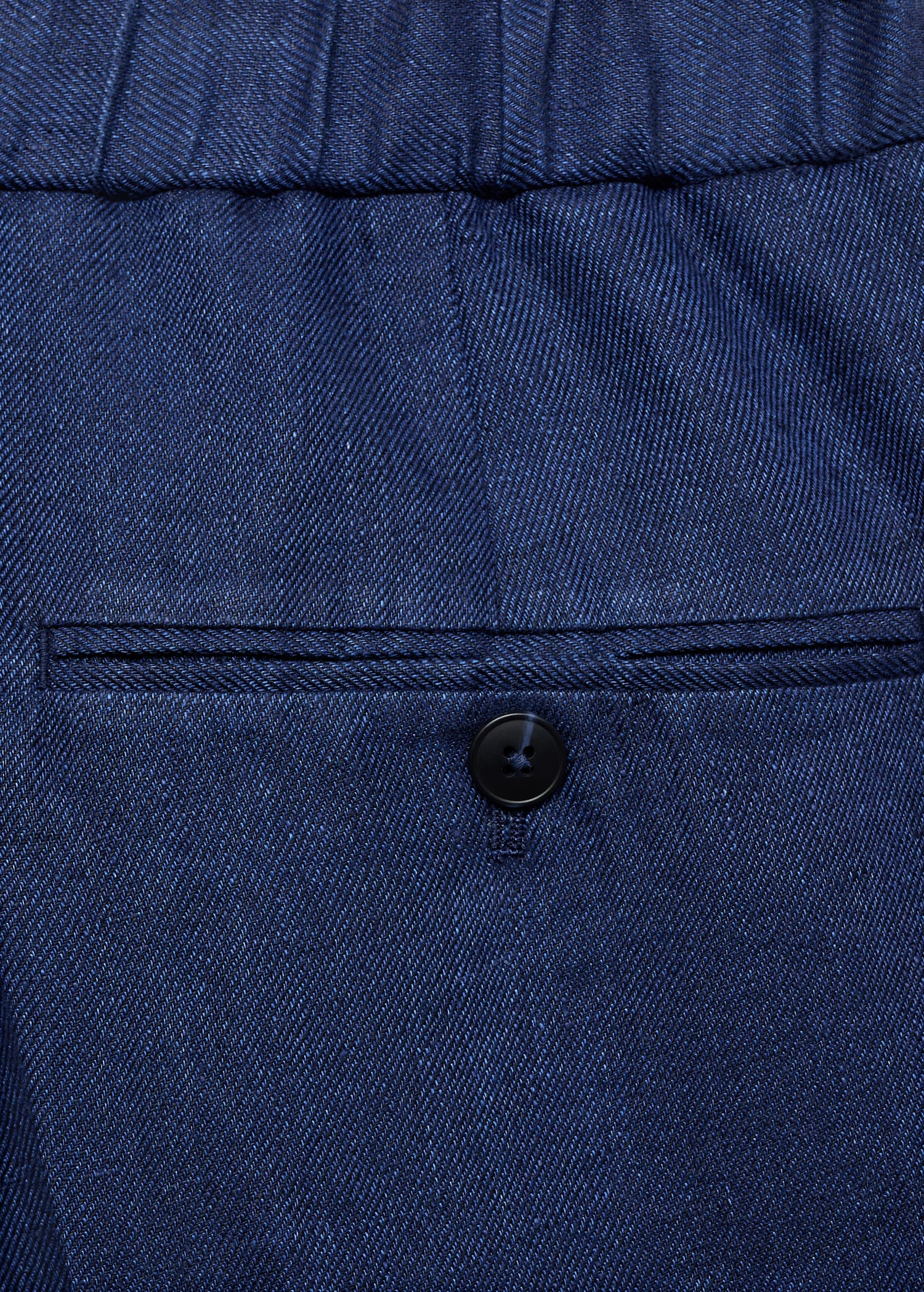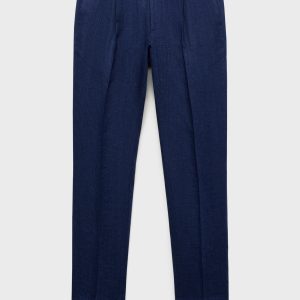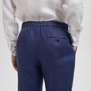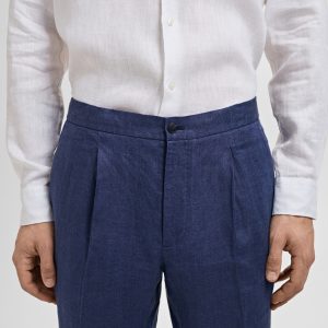 Slim fit. 100% linen fabric. Tailoring collection. Elastic waist at the back. Button and zipper closure. Two side pockets. Front pleat detail. Two welt pockets with button at the back. Promotional product