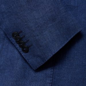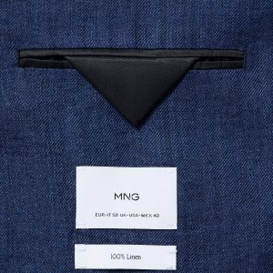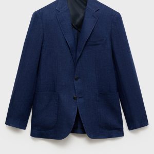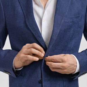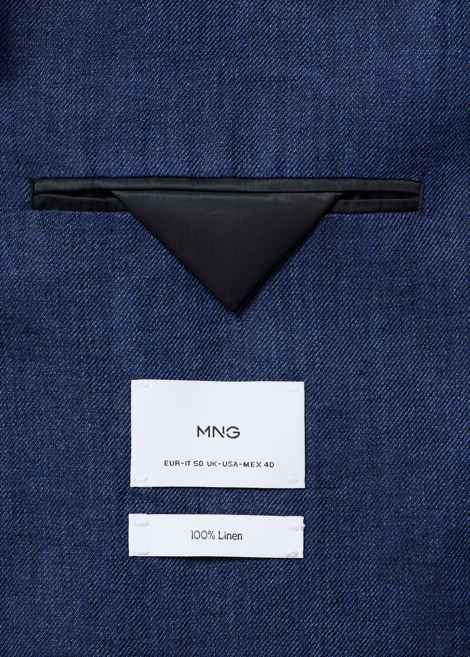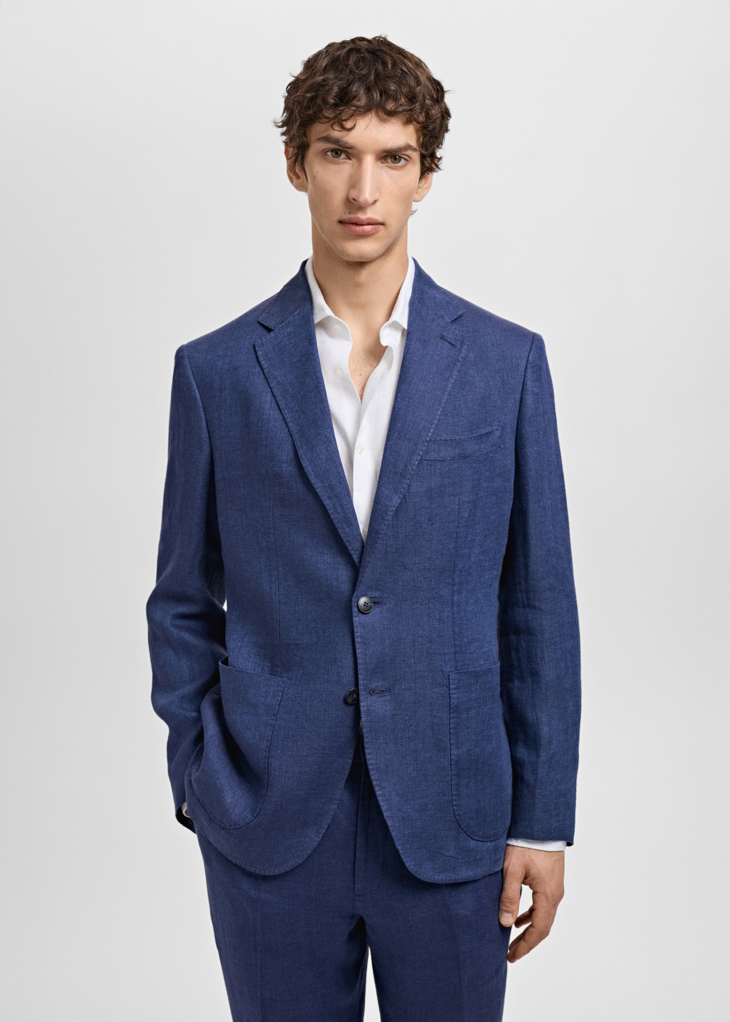 Slim fit. 100% linen fabric. Notch lapels and buttonhole. Chest welt pocket. Button closure. Two side patch pockets. Buttoned cuff straps. Promotional product