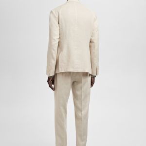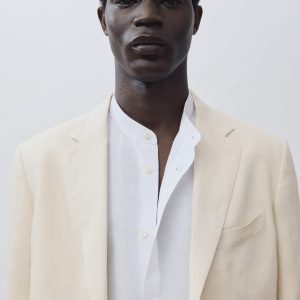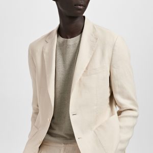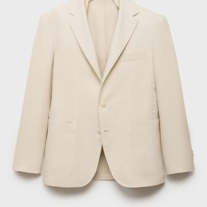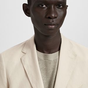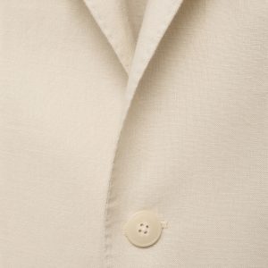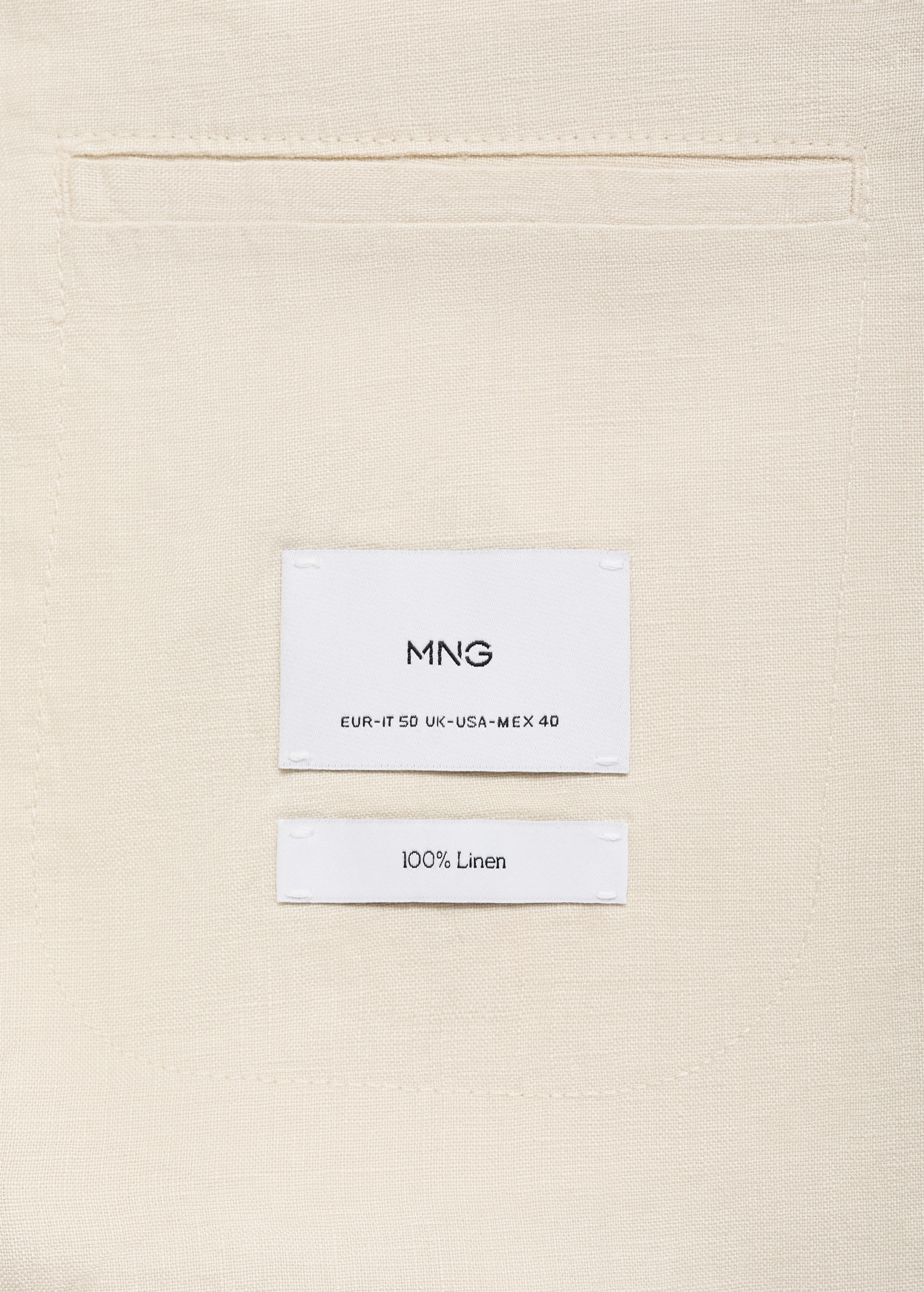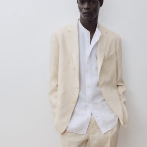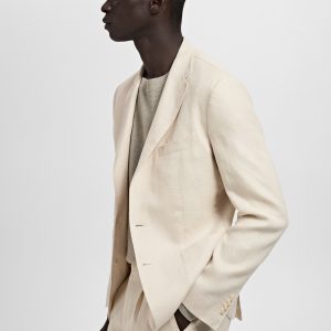 Slim fit. 100% linen fabric. Tailoring collection. Notch lapels and buttonhole. Chest welt pocket. Button closure. Two side patch pockets. Buttoned cuff straps