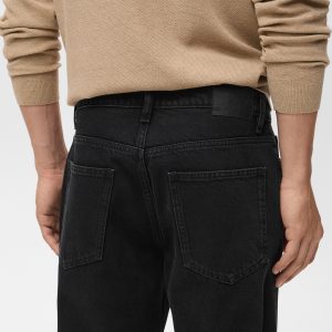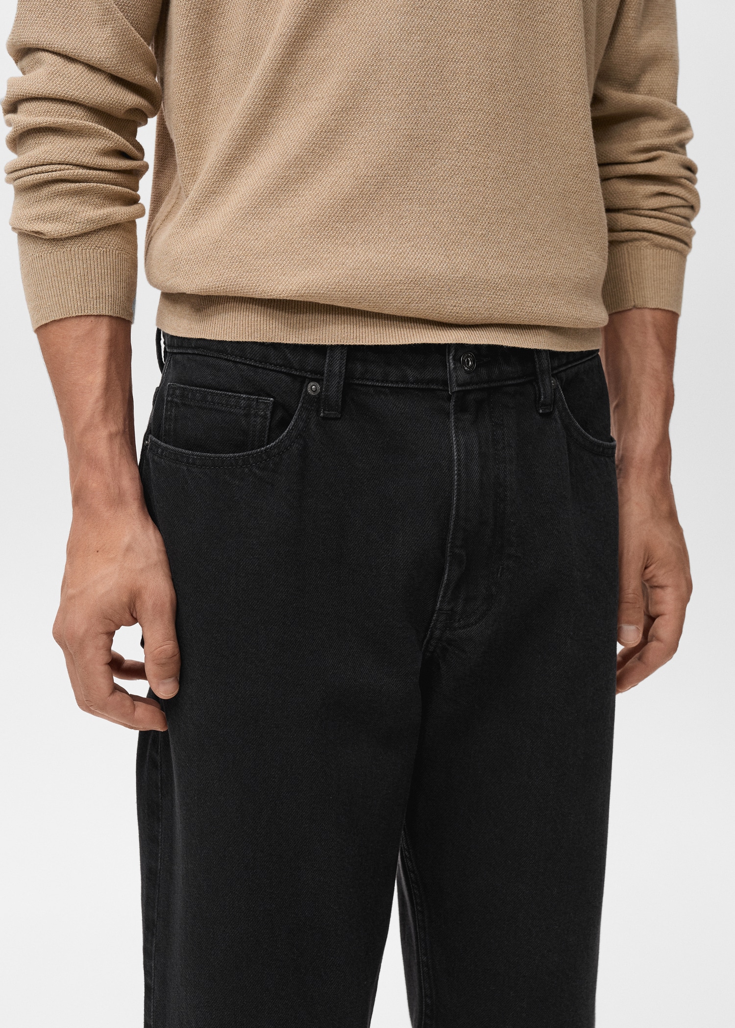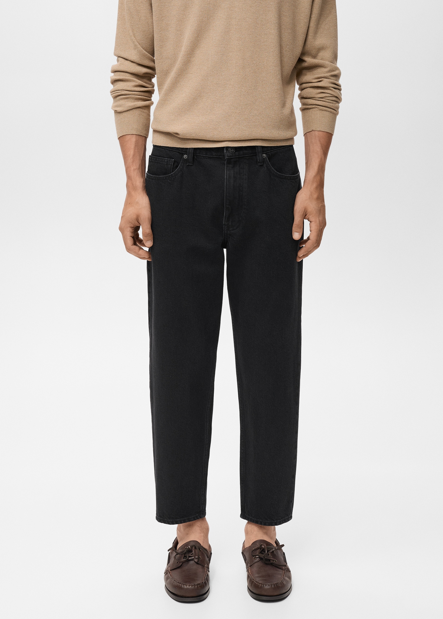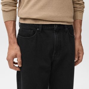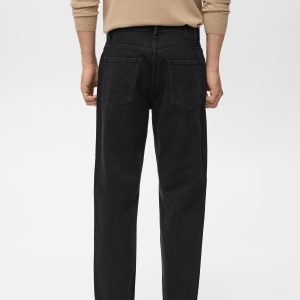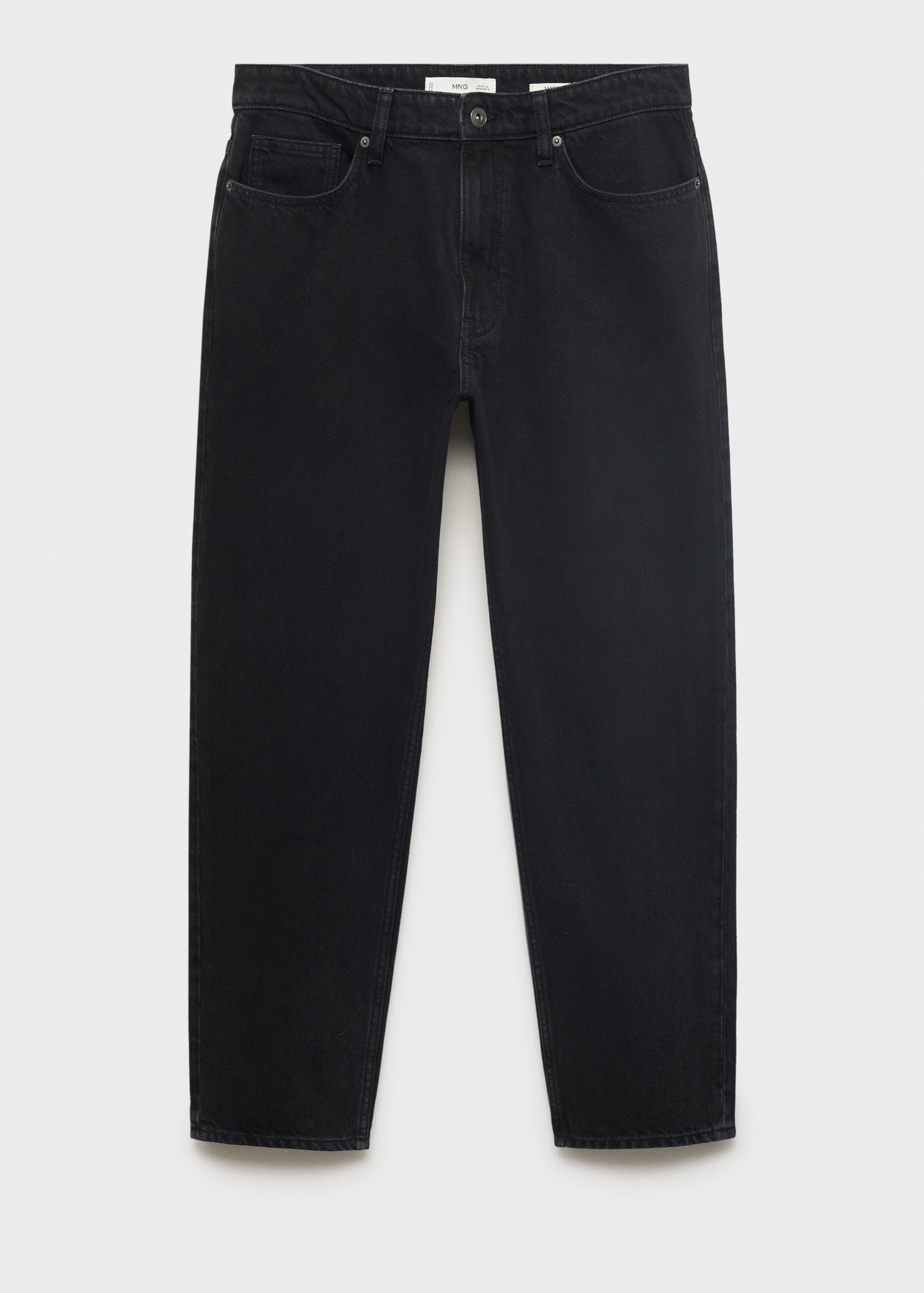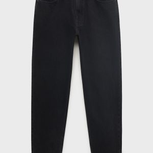 100% cotton fabric. Tapered fit: wide cut at the top that narrows from the knee to the ankle. Low cropped. Light faded wash. Cotton denim fabric. Front zipper and button closure. Belt loops. Coin pocket. Two front pockets. Two patch pockets at the back