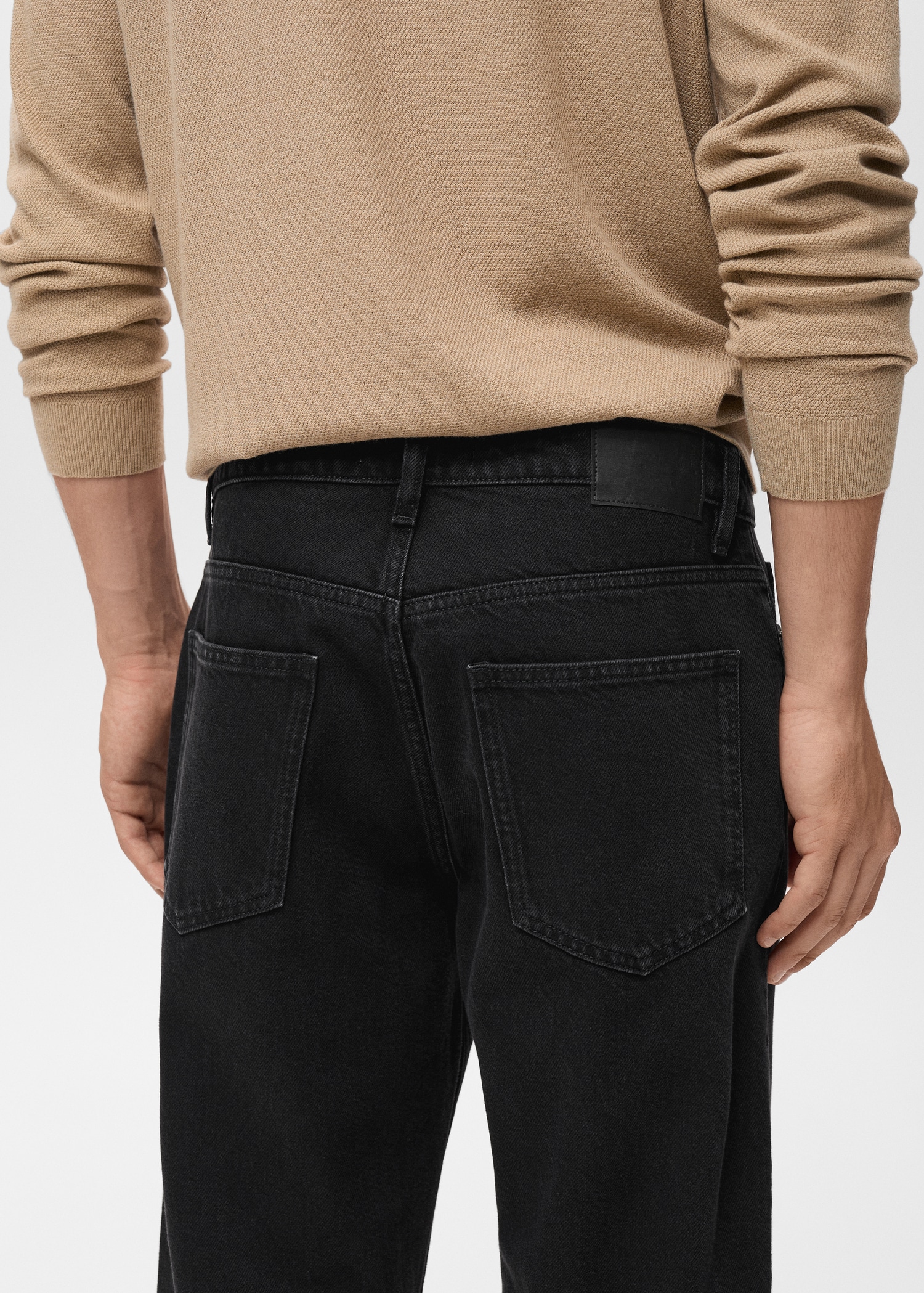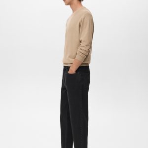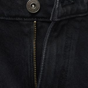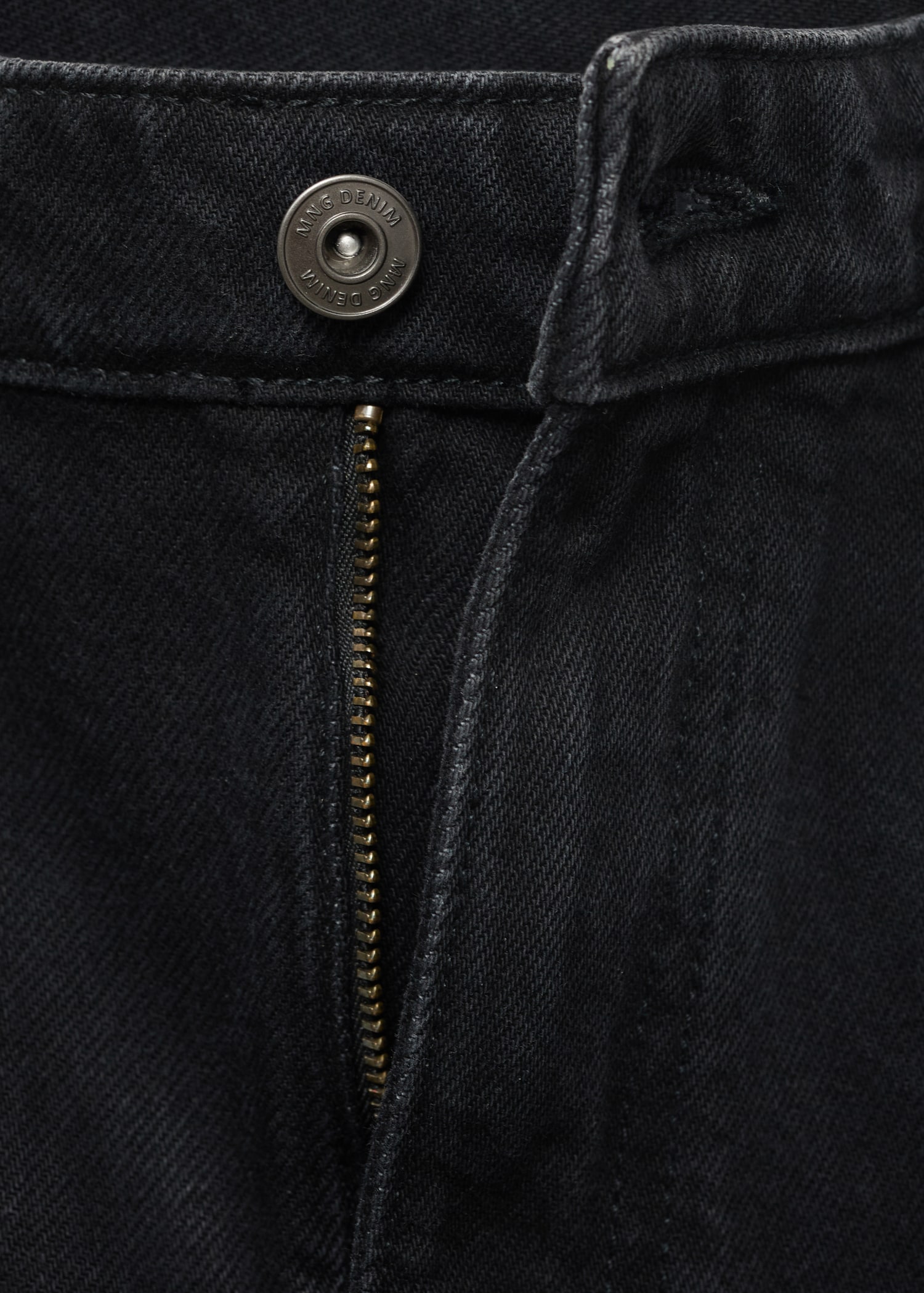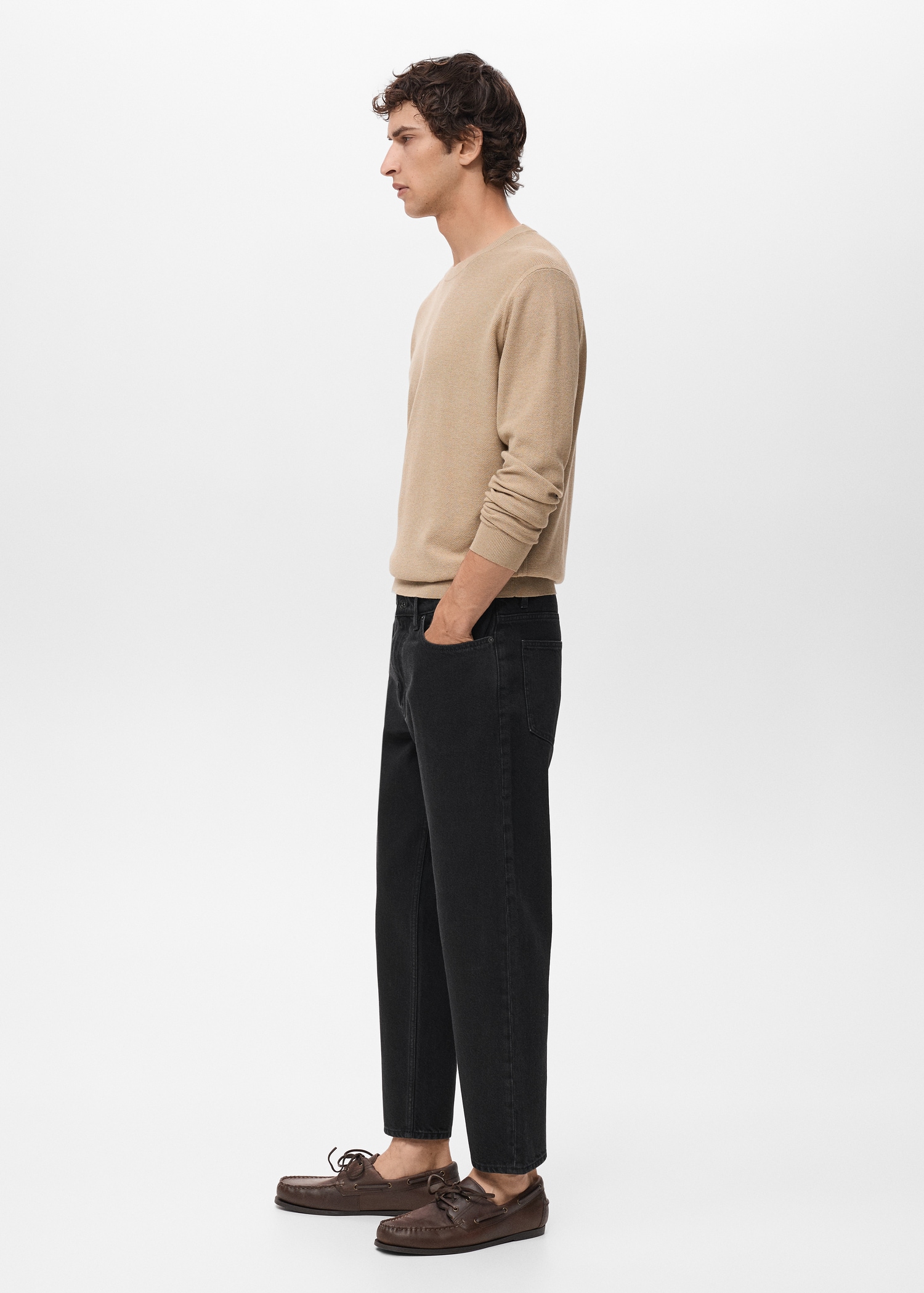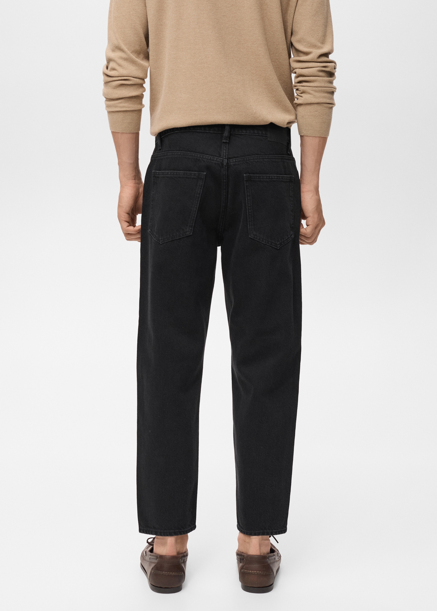 100% cotton fabric. Tapered fit: wide cut at the top that narrows from the knee to the ankle. Low cropped. Light faded wash. Cotton denim fabric. Front zipper and button closure. Belt loops. Coin pocket. Two front pockets. Two patch pockets at the back