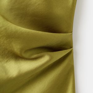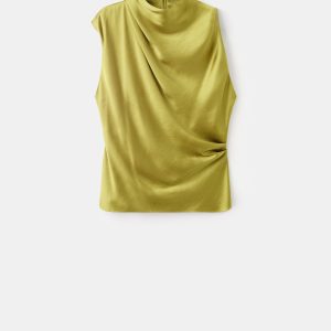Crafted from satin fabric, this garment features a straight design with an elegant draped neckline. The asymmetrical sleeves and ruched detail on the shoulder add a distinctive touch. Zip fastening at the back. Comes with matching trousers