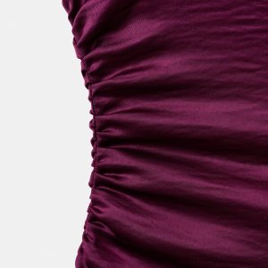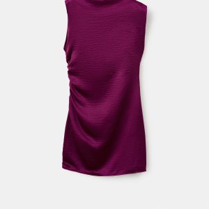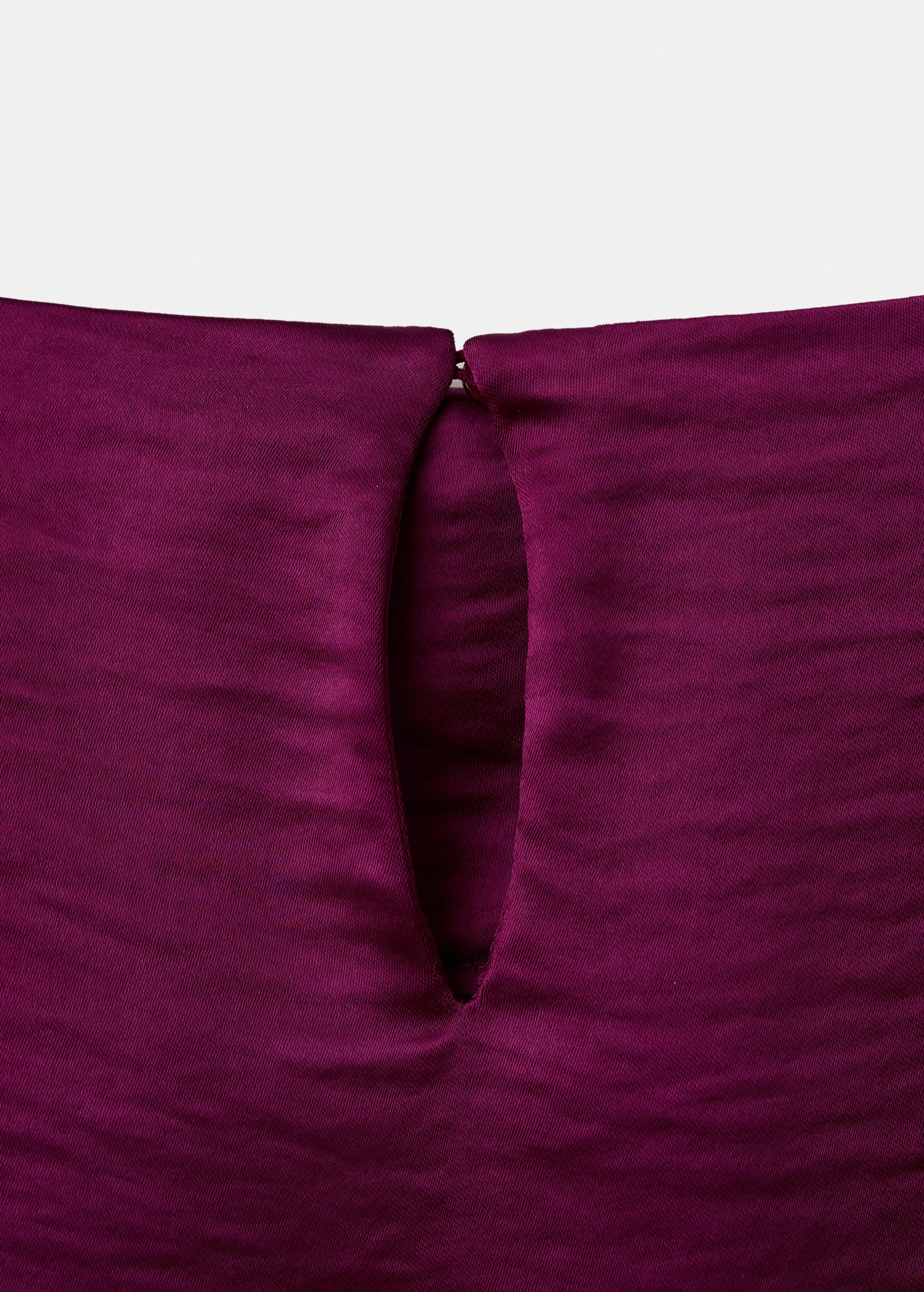 Satin weave. Wrinkled effect. Short design. Fitted design. Crew neck. Asymmetrical sleeves. Side ruffles. Button closing on the neck. Available Plus. This garment is part of our party and event collection, designed to elevate your looks for special occasions.
