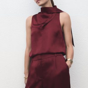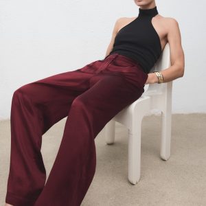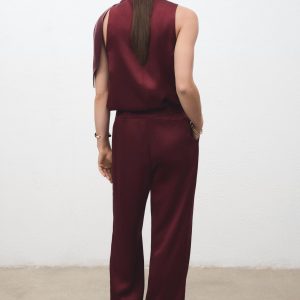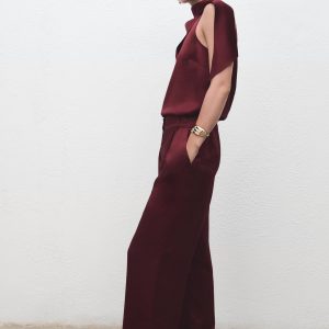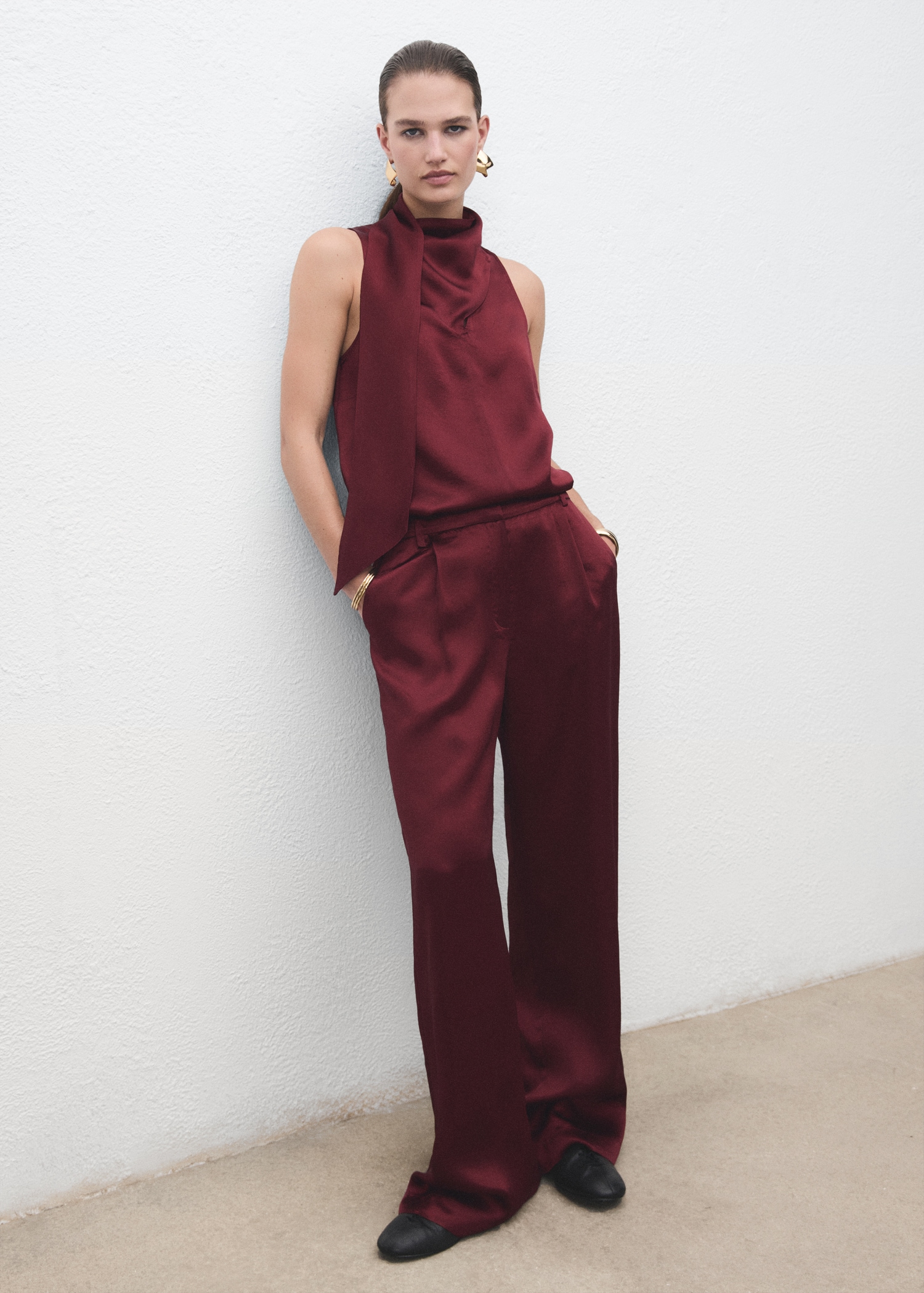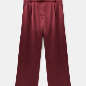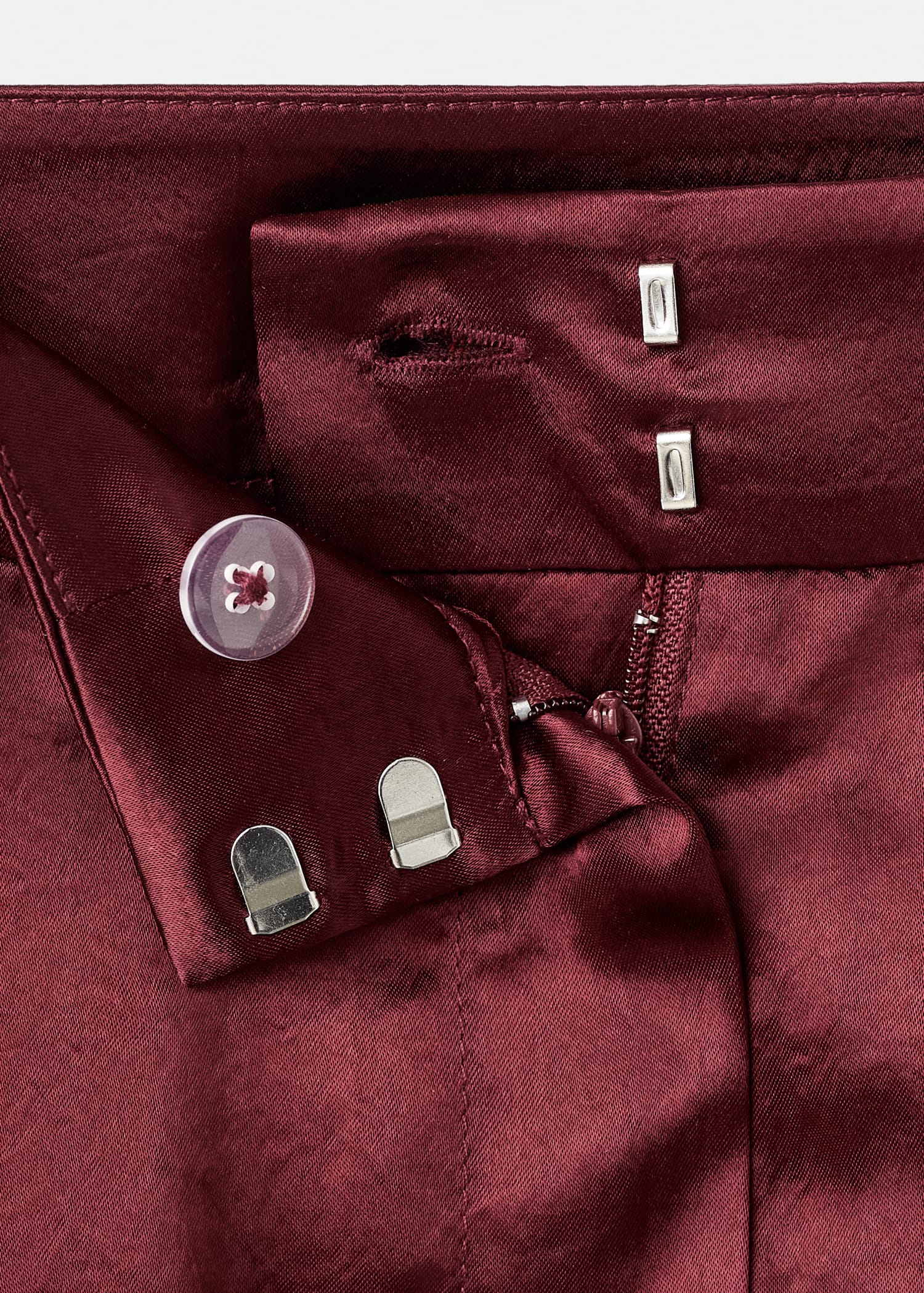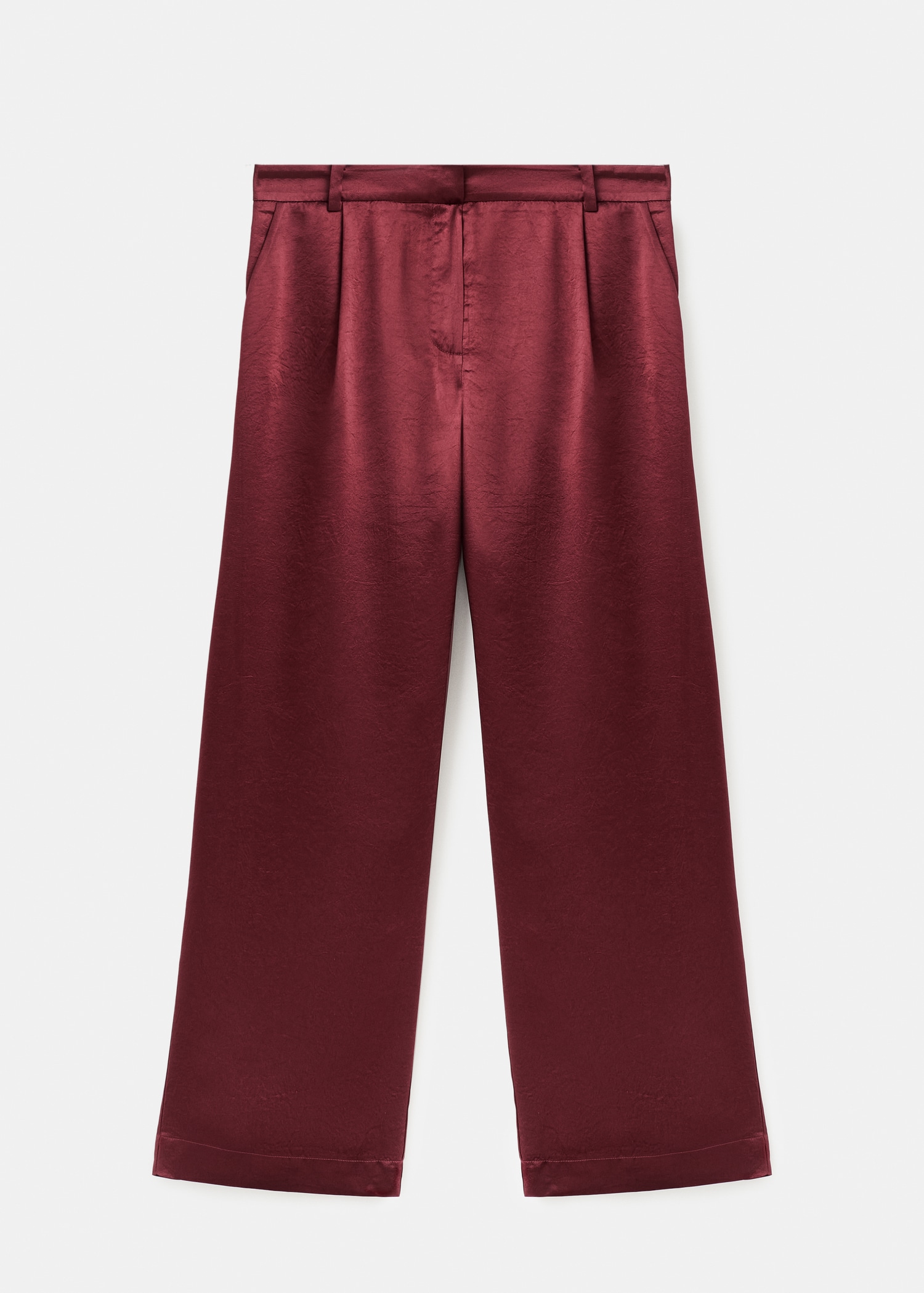 Satin weave. Long design. Wide leg design. Mid-rise. Belt loops. Front pleat detail. Two side pockets. Concealed button, hook and zip fastening. Inner lining. Total look