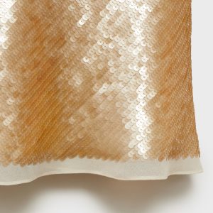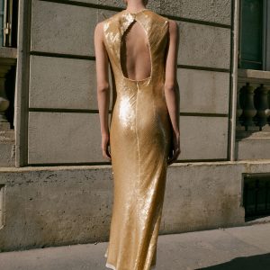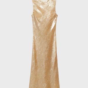 This dress is a statement of glamor and sophistication, covered in golden sequins that capture the light with every movement. The open back adds a touch of sensuality and modernity, creating a perfect balance between elegance and boldness. This piece is ideal for those who wish to stand out at special events with a style that radiates luxury. Sequin fabric. Straight design. Long design. Round Neck. Sleeveless. Wide straps. Back zipper closure. Items from the CAPSULE collection can be exchanged or returned within 14 days from the date of shipment. Capsule: a collection of limited-edition garments, made with the best fabrics and the greatest care in patternmaking, to achieve the best finishes. This exclusive collection is designed for the most special events and occasions
