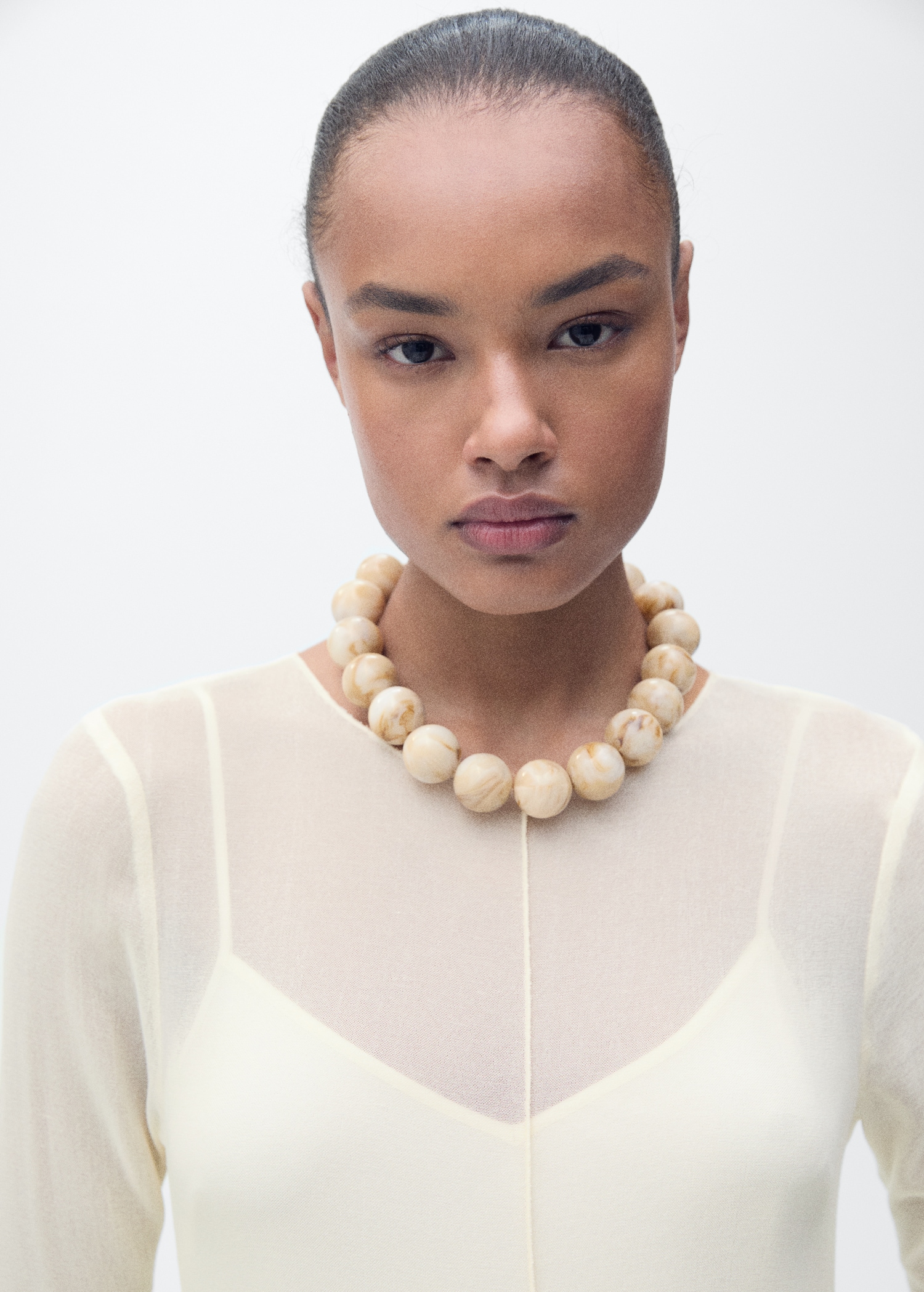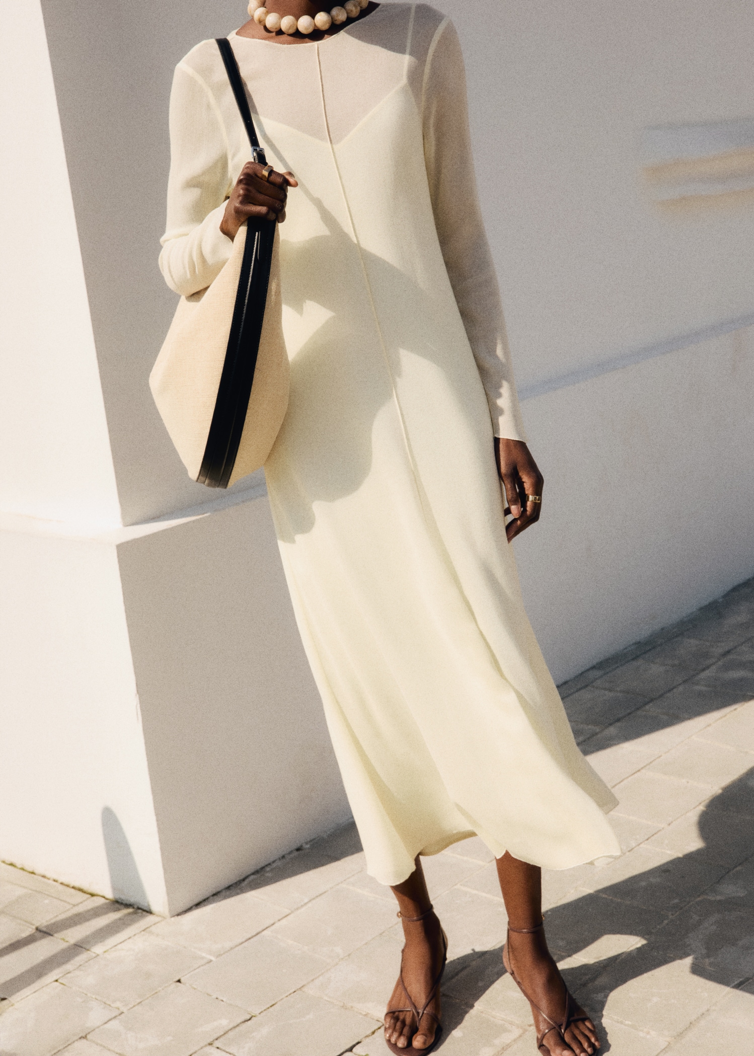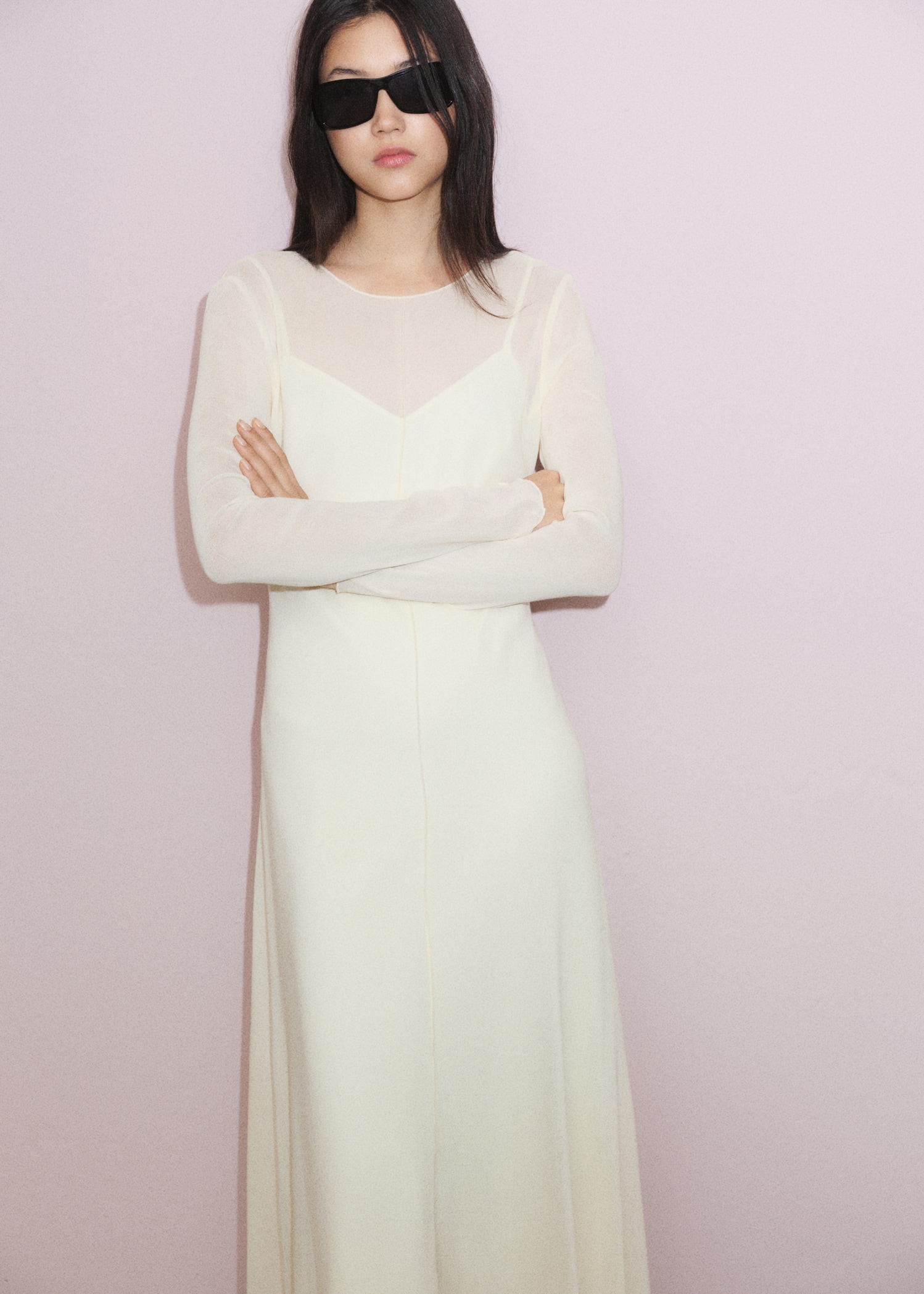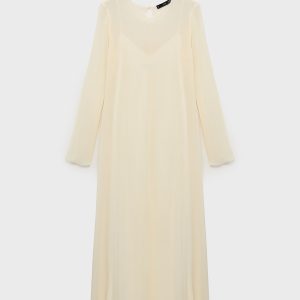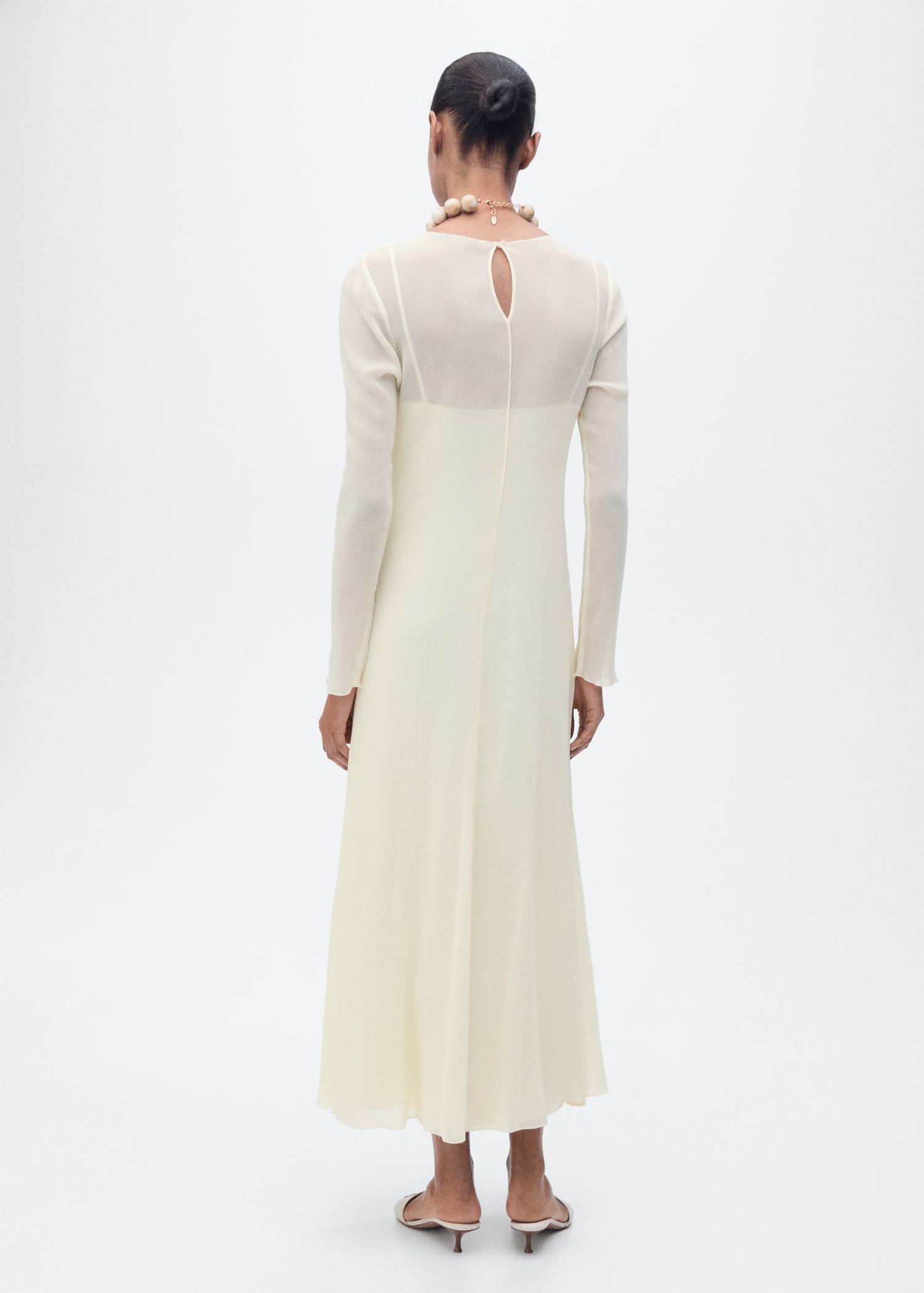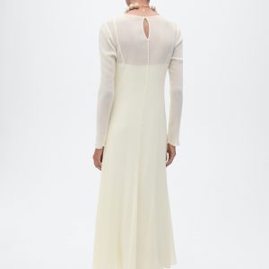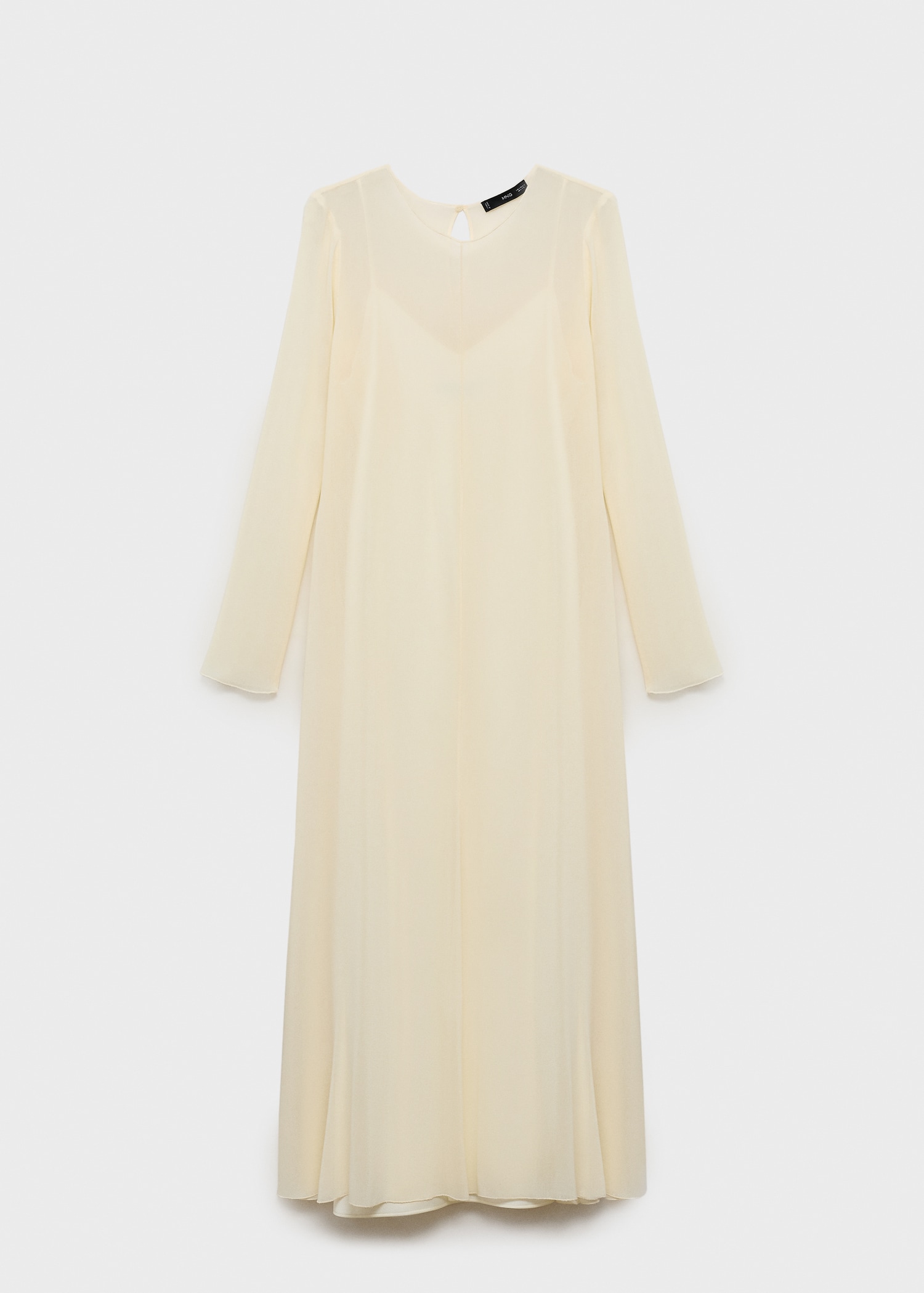 Semi-transparent design. Combined design. Long design. Straight Design. Crew neck. Long Sleeve. Button closure at the back. Inner lining. This garment is part of our event collection, designed to make you the perfect guest at any party, wedding, or ceremony.