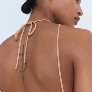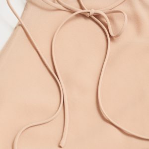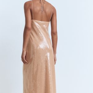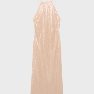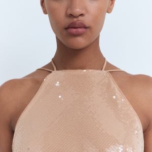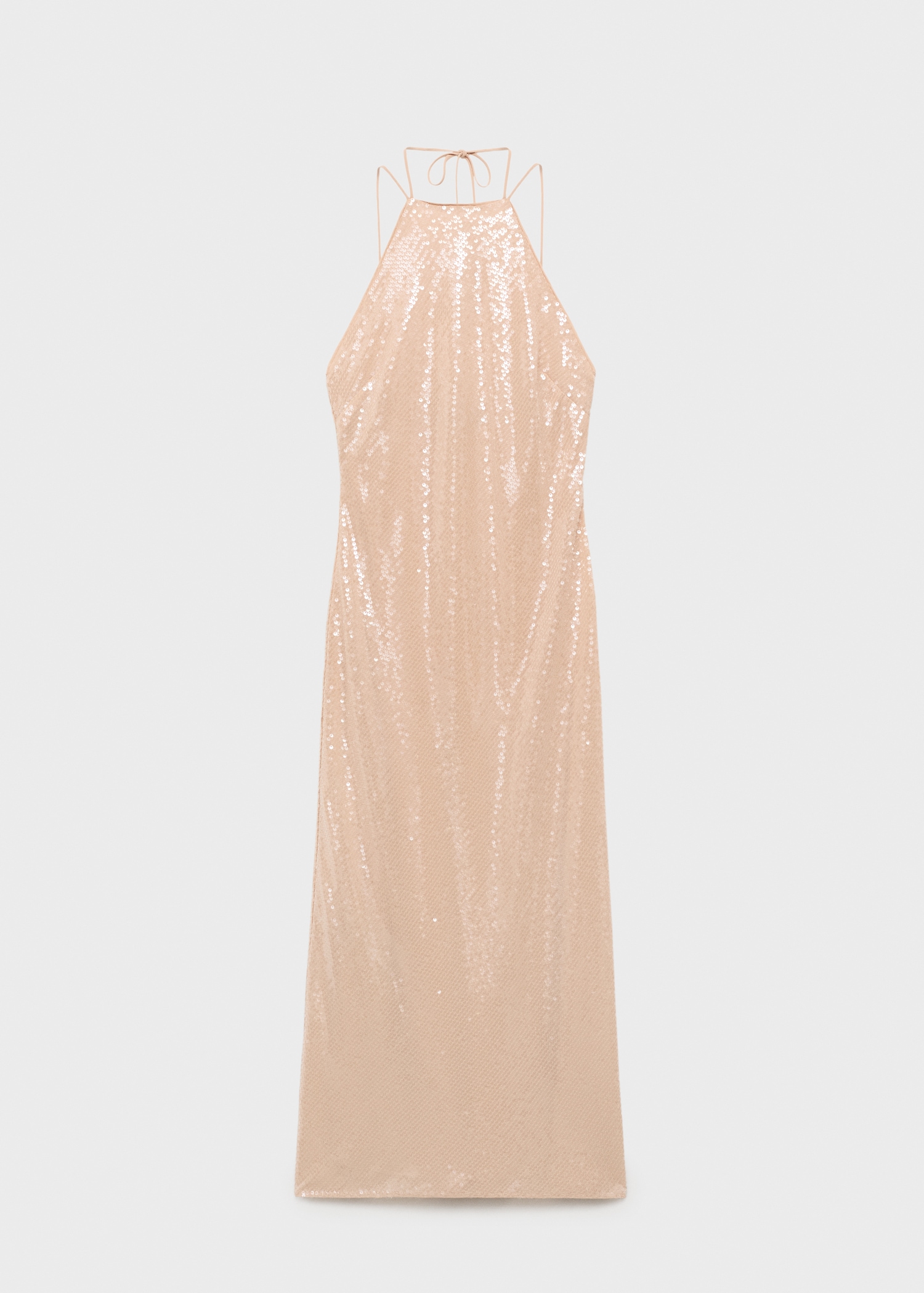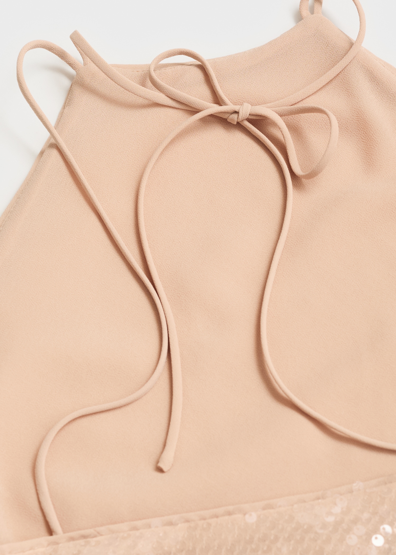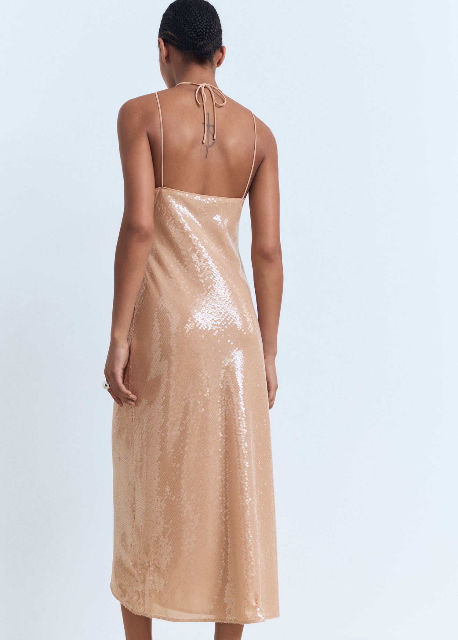 Sequin fabric. Midi design. Straight Design. Halter neck. Sleeveless. Thin straps. Backless. Bow fastening on the neck. Inner lining