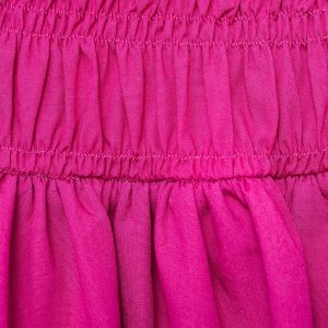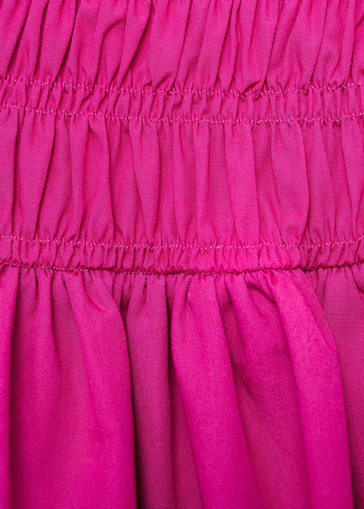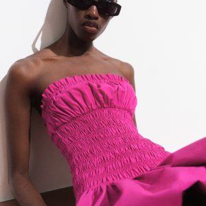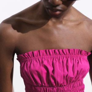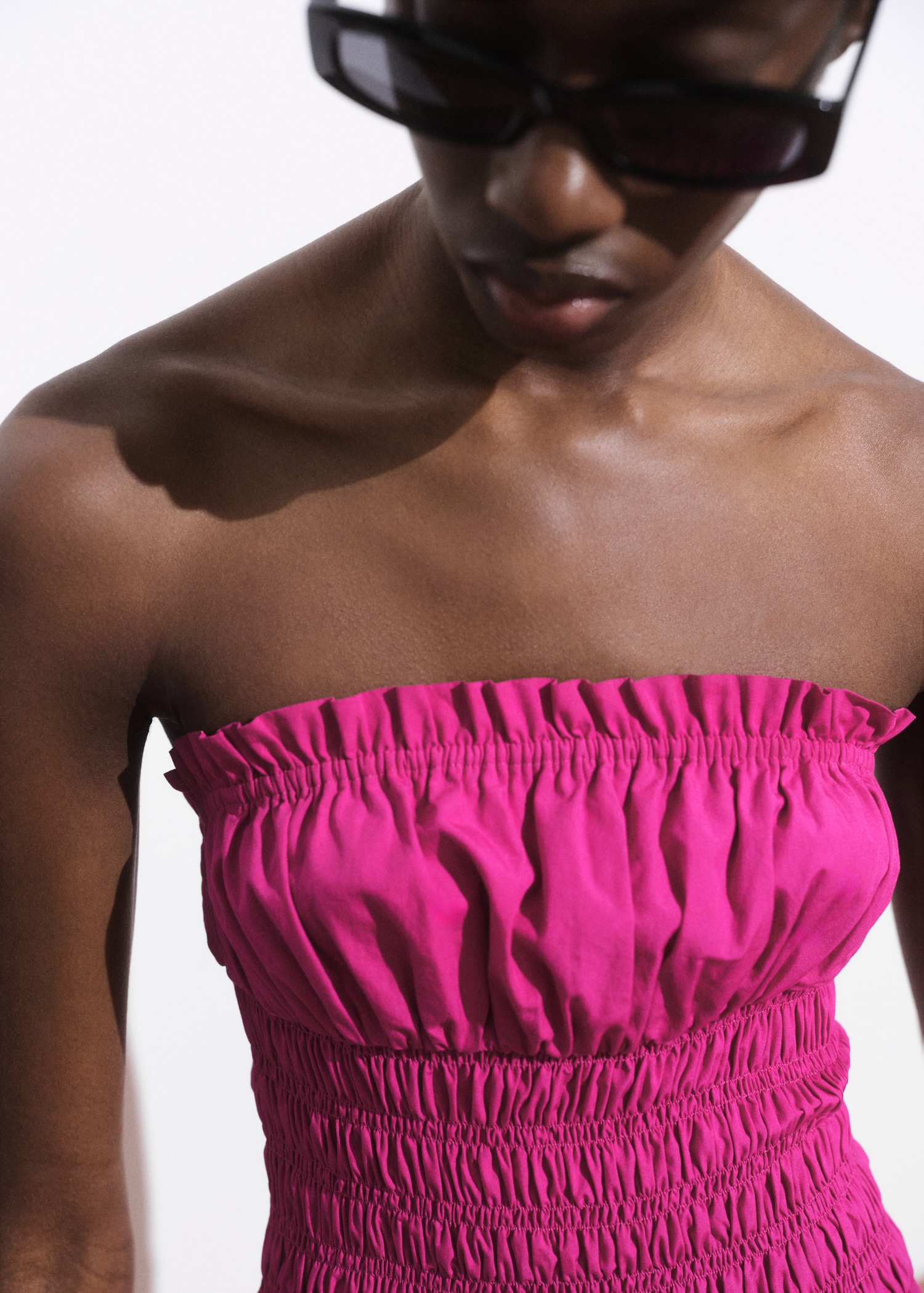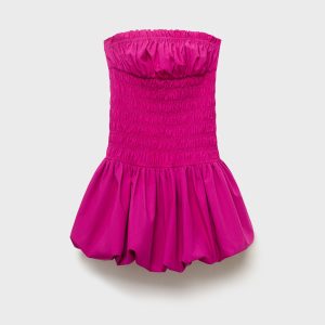 Cotton blend fabric. Bubble hem. Short design. Fitted design. Strapless. Sleeveless. Ruched bodice. No closure. 100% cotton lining