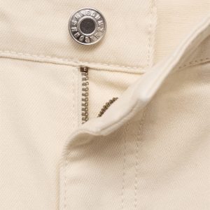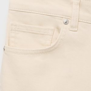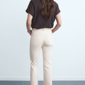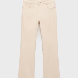 Cotton denim fabric. Stretch fabric. Crop design. Flare design. Mid-rise. Belt loops. Five pockets. Frayed hem. Zip and button closure. Inside length 65 cm. High-rise. Front zipper and button closure. Comfort fabric with elasticity