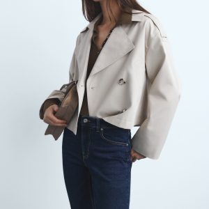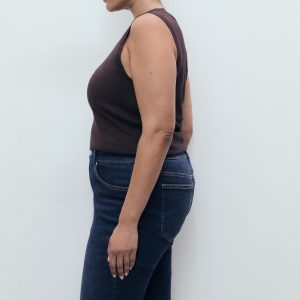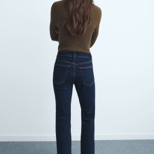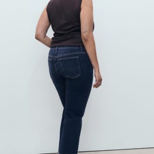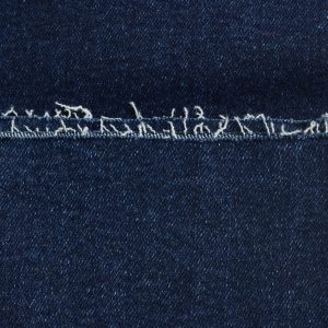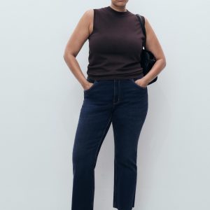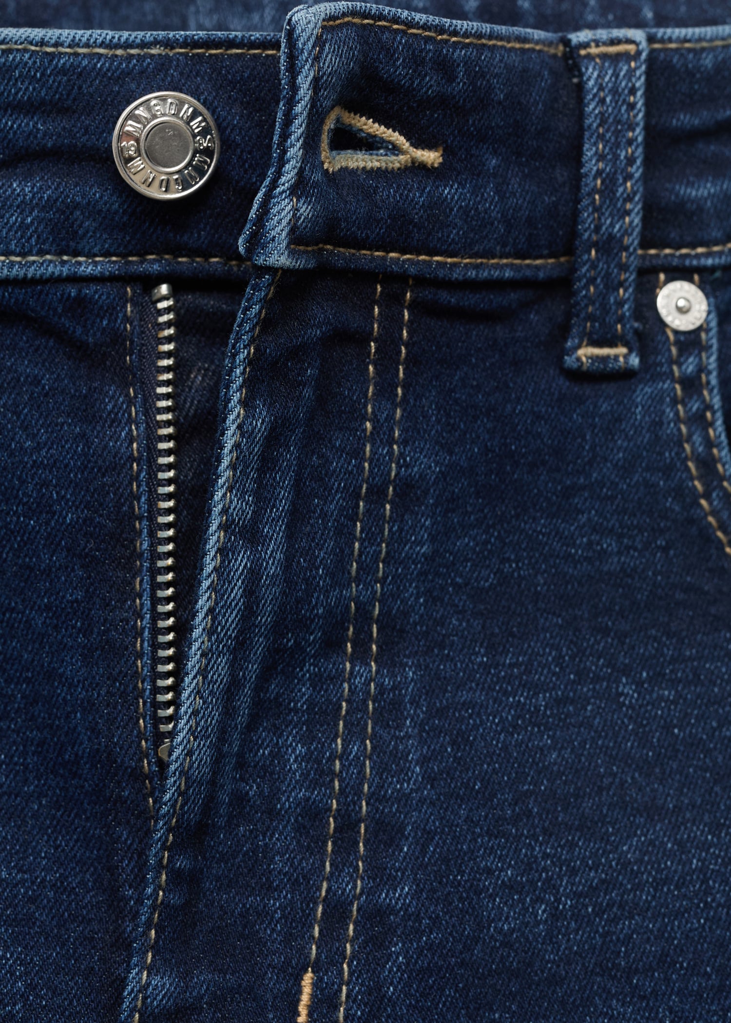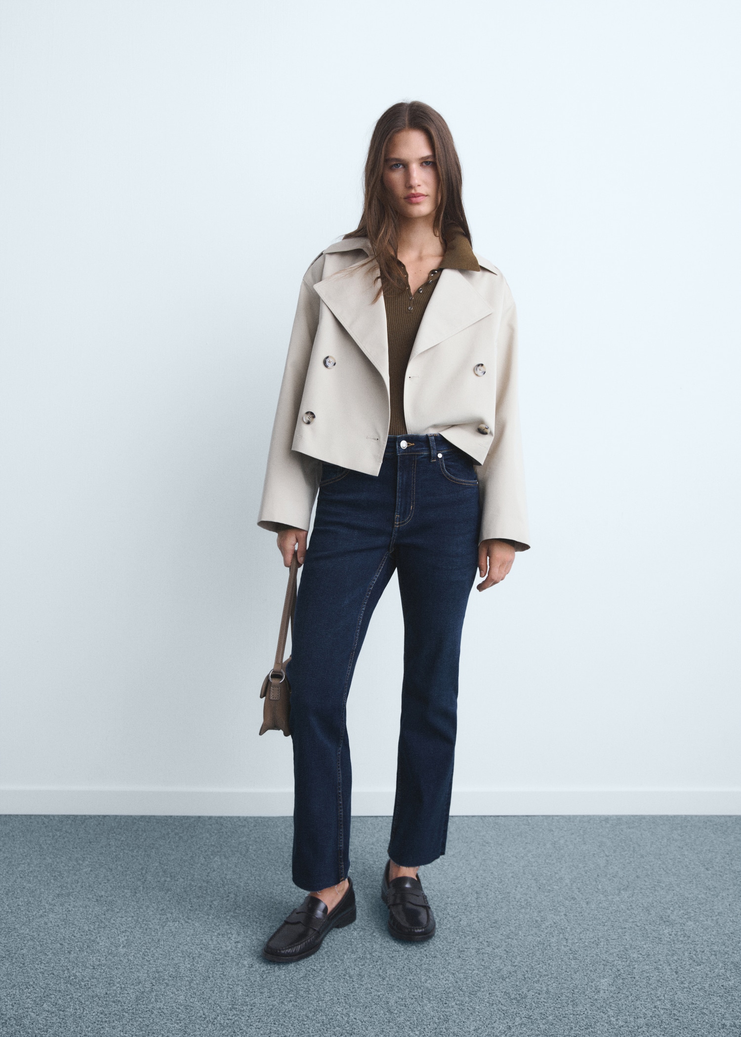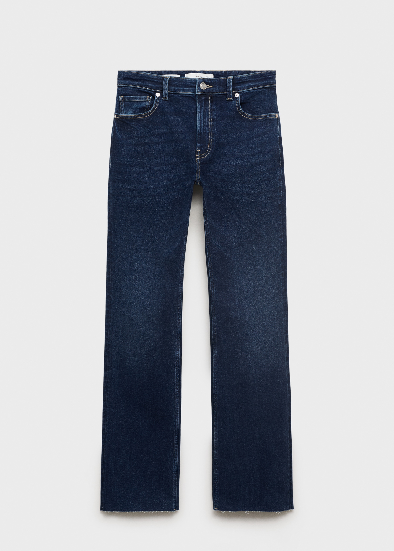 Cotton denim fabric. Stretch fabric. Crop design. Flare design. Mid-rise. Belt loops. Five pockets. Frayed hem. Zip and button closure. Inside length 65 cm. Available Plus. Comfort fabric with elasticity