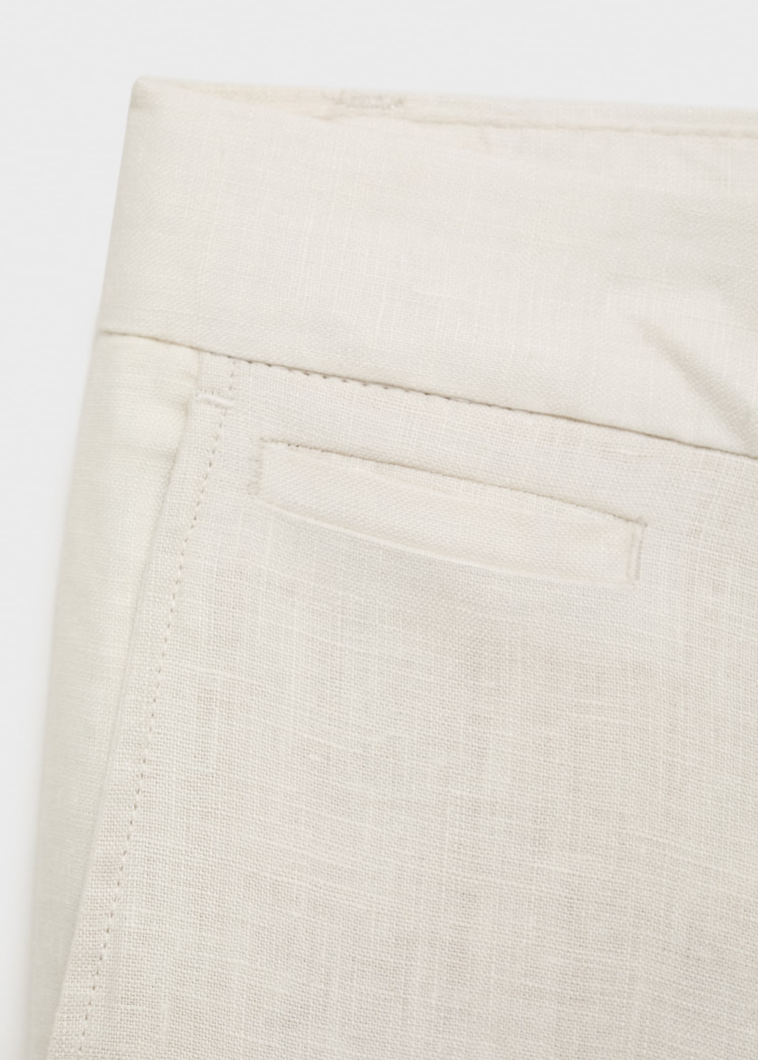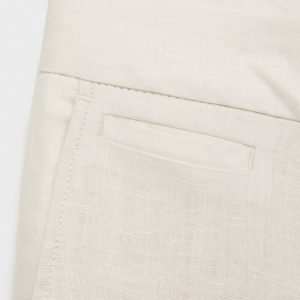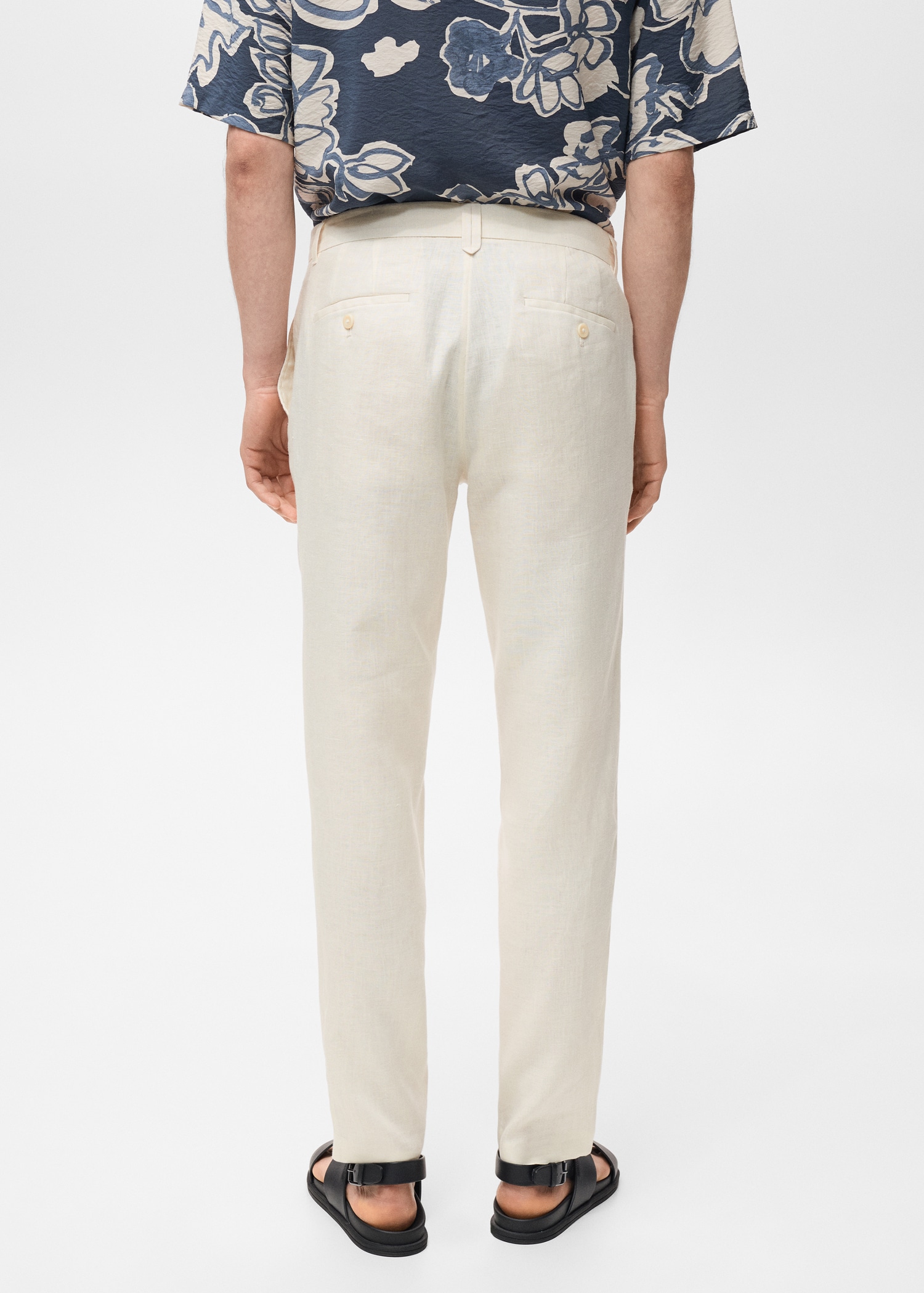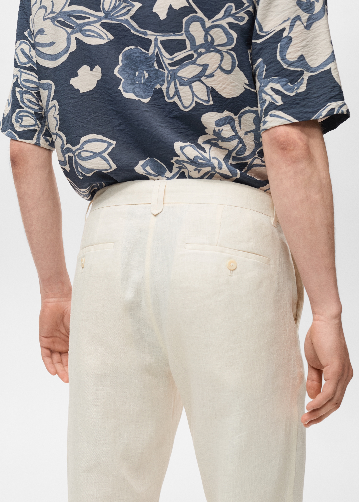 100% linen fabric. Slim Silhouette. Belt loops. Double button and zip closure. Two side pockets. Coin pocket. Two welt pockets with button at the back. The blue color is an online exclusive. Slim fit. Front closure with double-breasted buttons and zipper. Coin pocket at hip height. Two front pockets. Two welt pockets with button at the back
