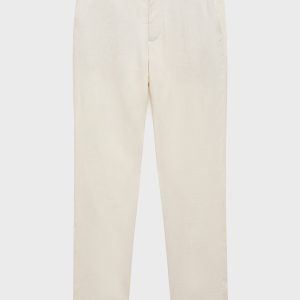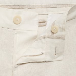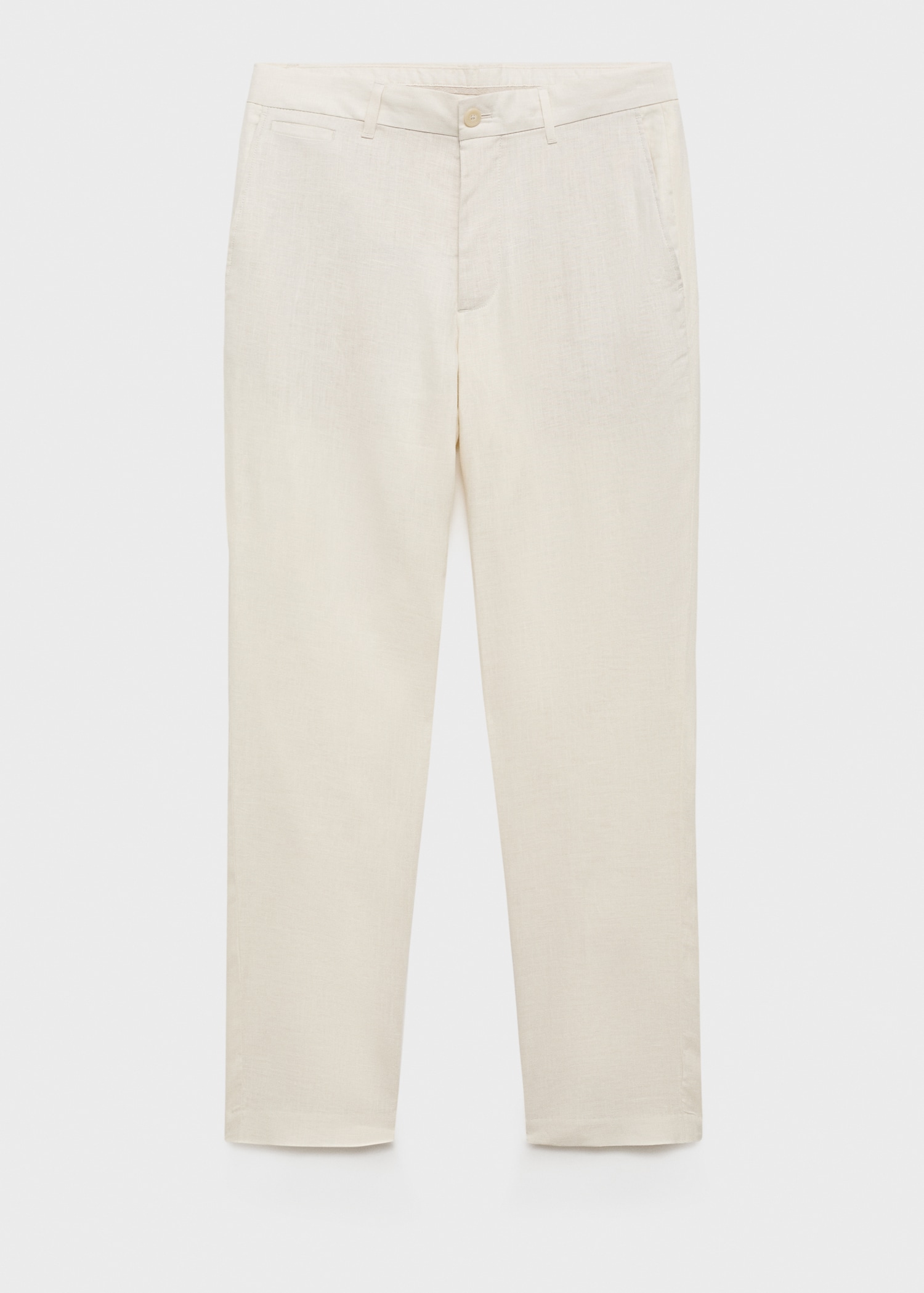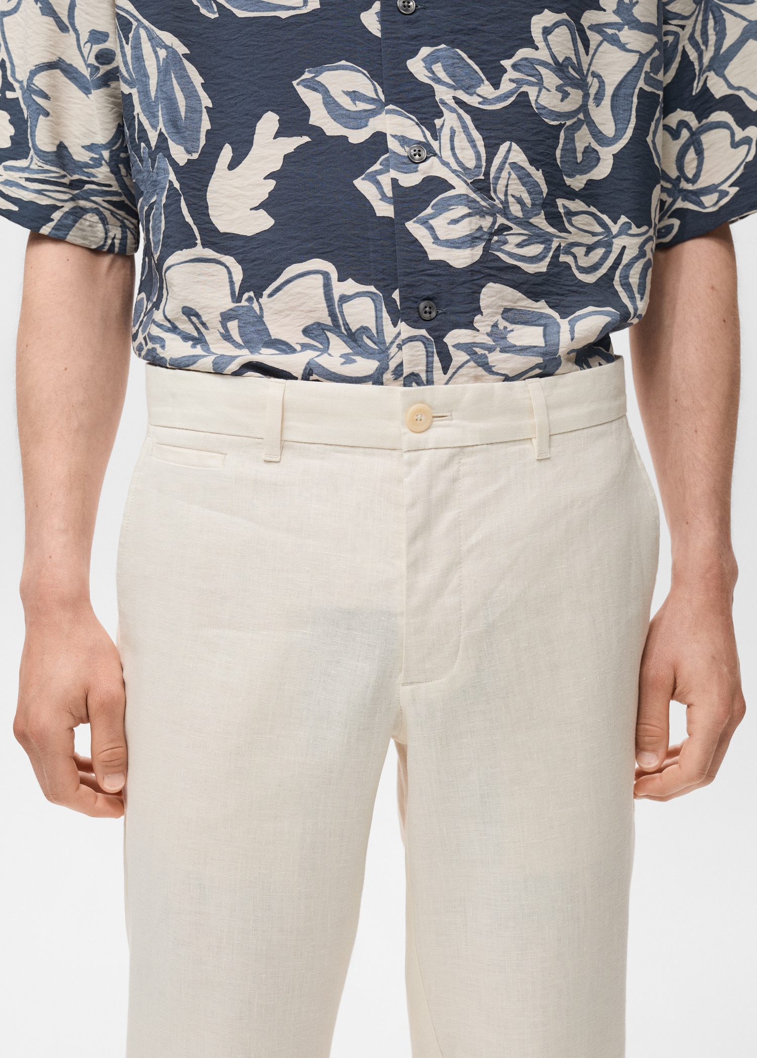 100% linen fabric. Slim Silhouette. Belt loops. Double button and zip closure. Two side pockets. Coin pocket. Two welt pockets with button at the back. The blue color is an online exclusive. Slim fit. Front closure with double-breasted buttons and zipper. Coin pocket at hip height. Two front pockets. Two welt pockets with button at the back