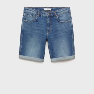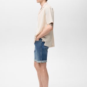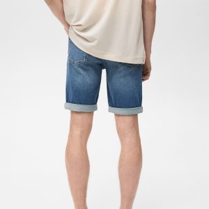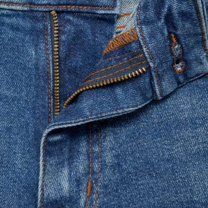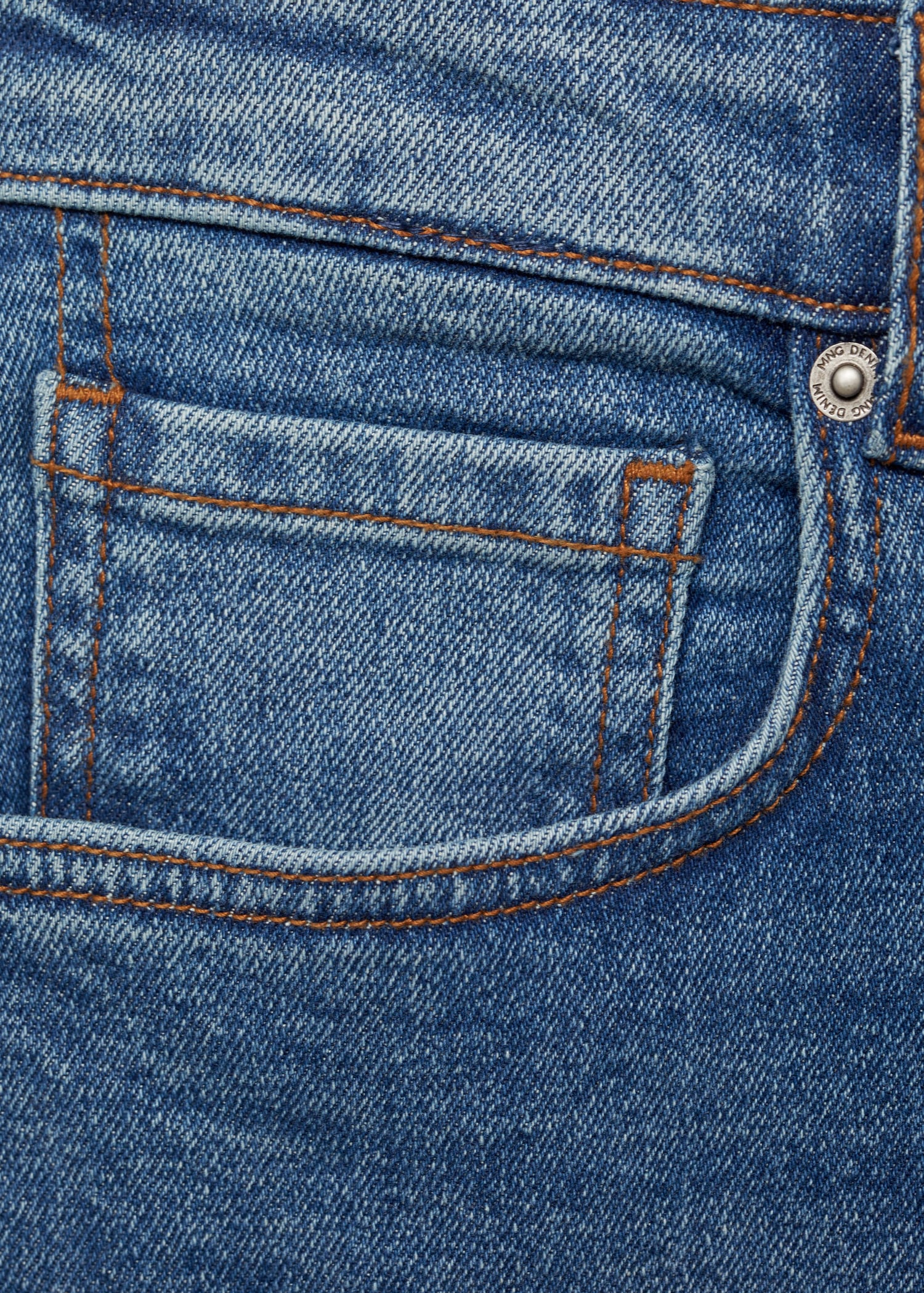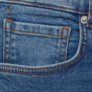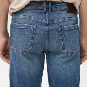 Slim fit. Cotton denim fabric. Belt loops. Zip and button closure. Two side pockets. Coin pocket. Two patch pockets at the back