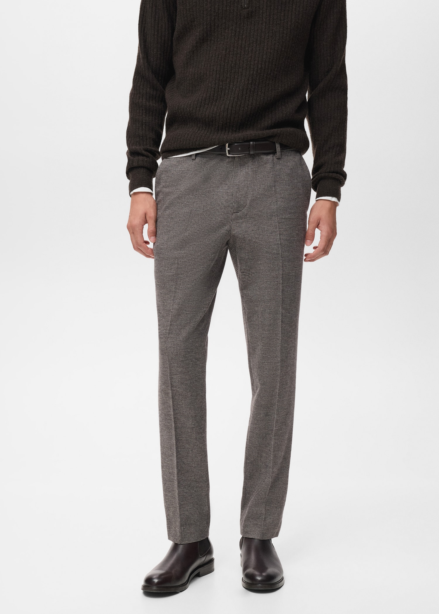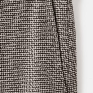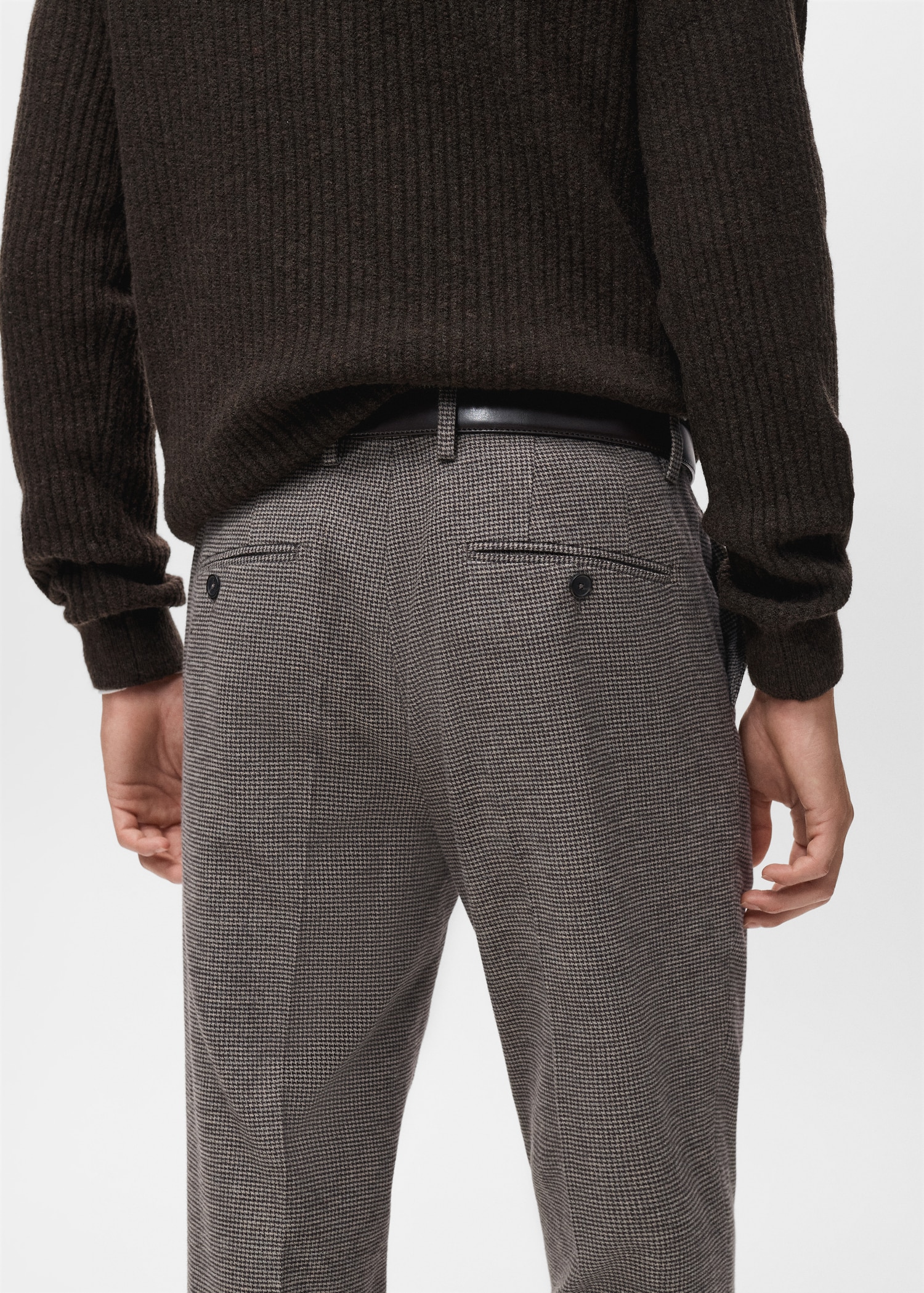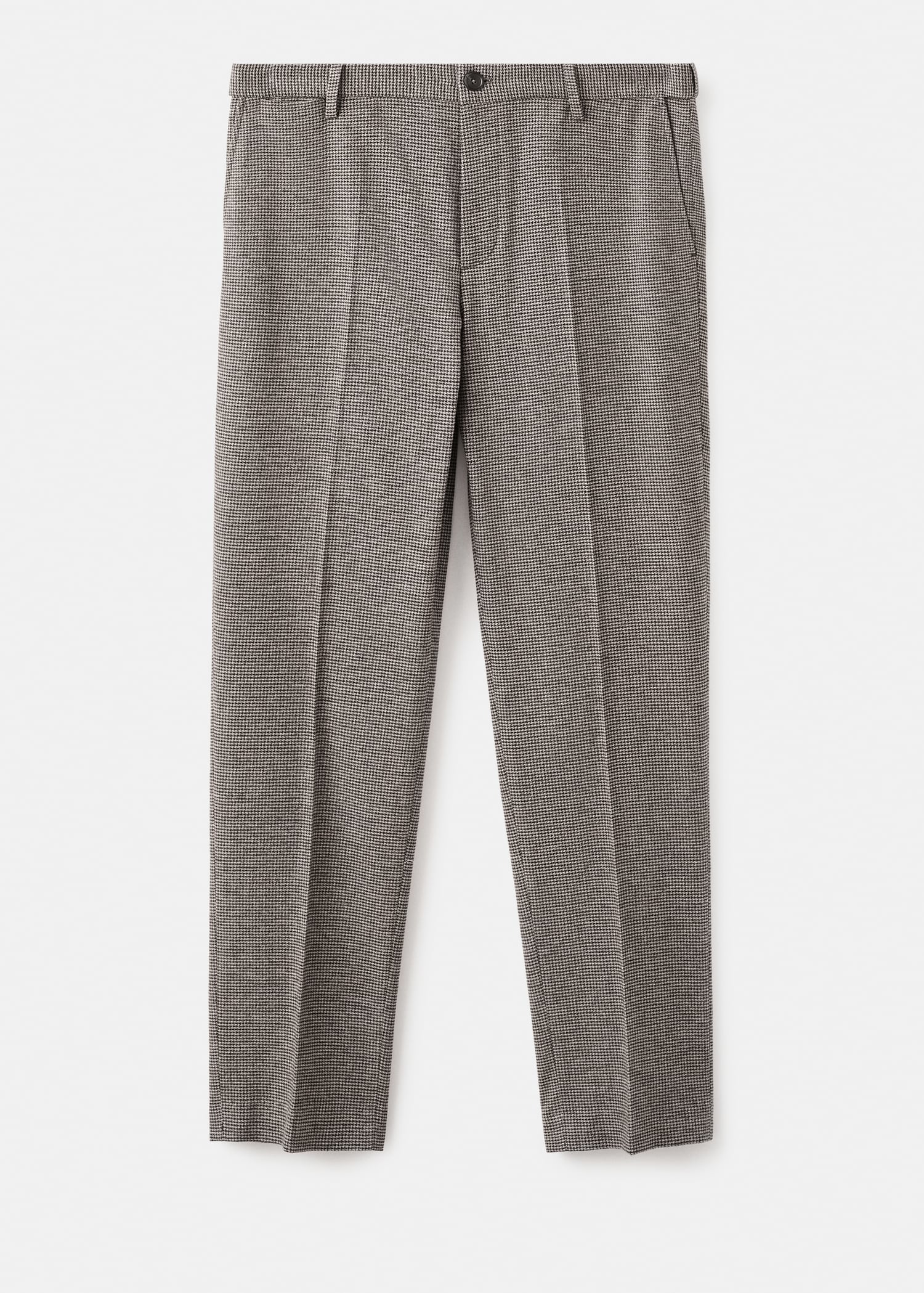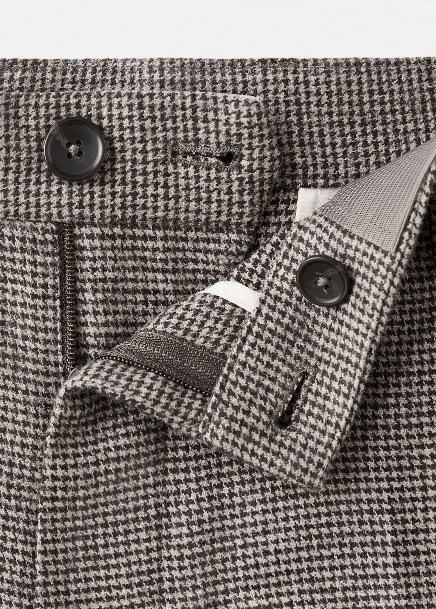Slim fit. Soft cotton flannel. Micro houndstooth print. Ironed stripe detail at front and back. Front closure with double-breasted buttons and zipper. Two welt pockets with button at the back. Belt loops