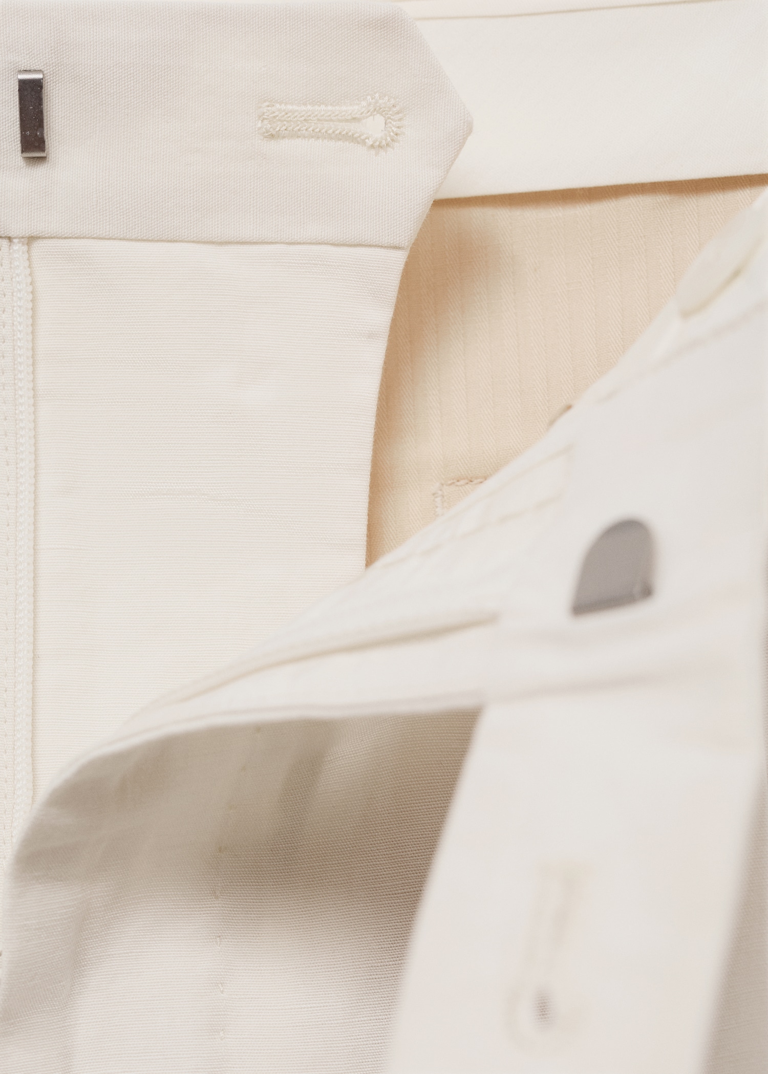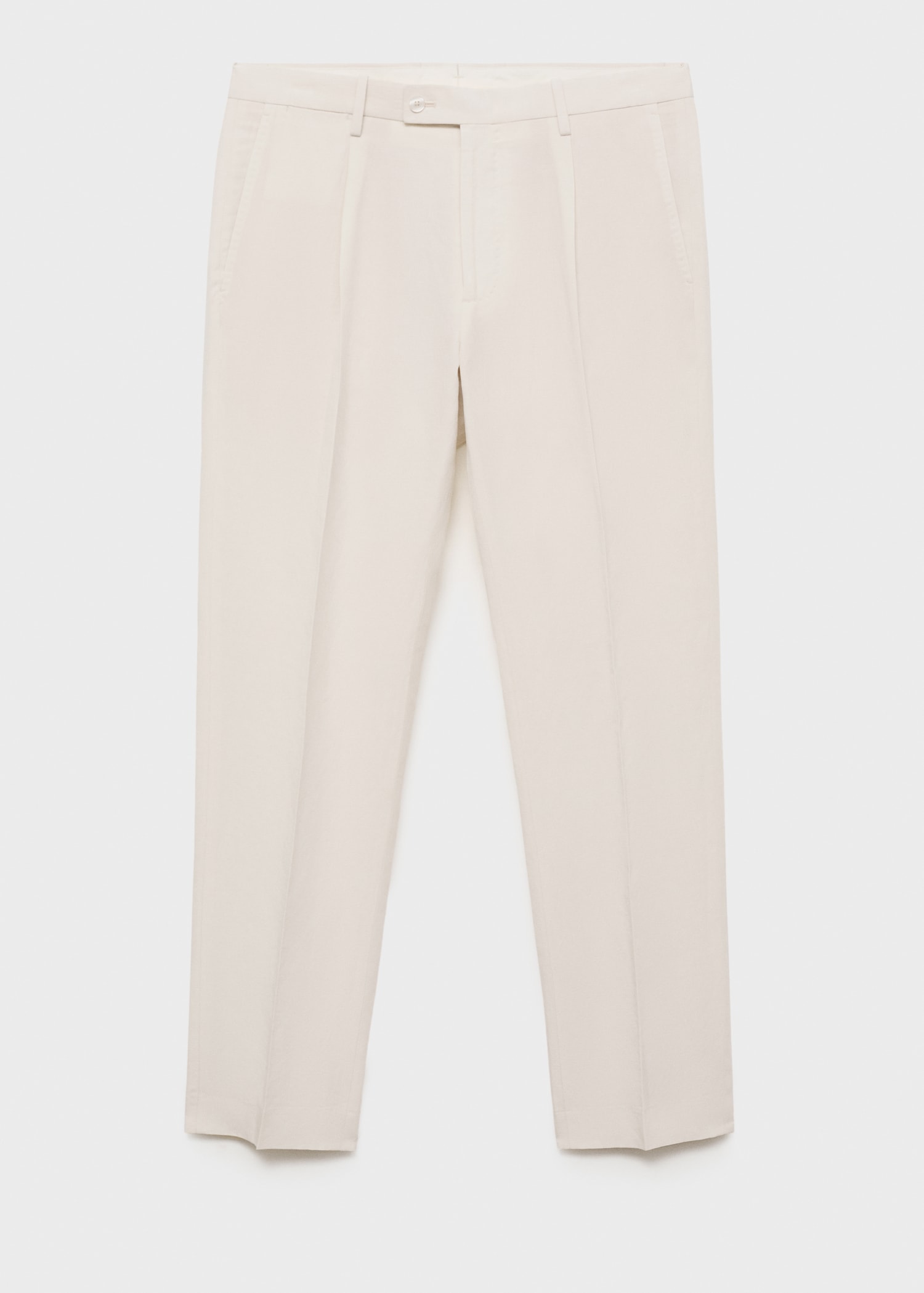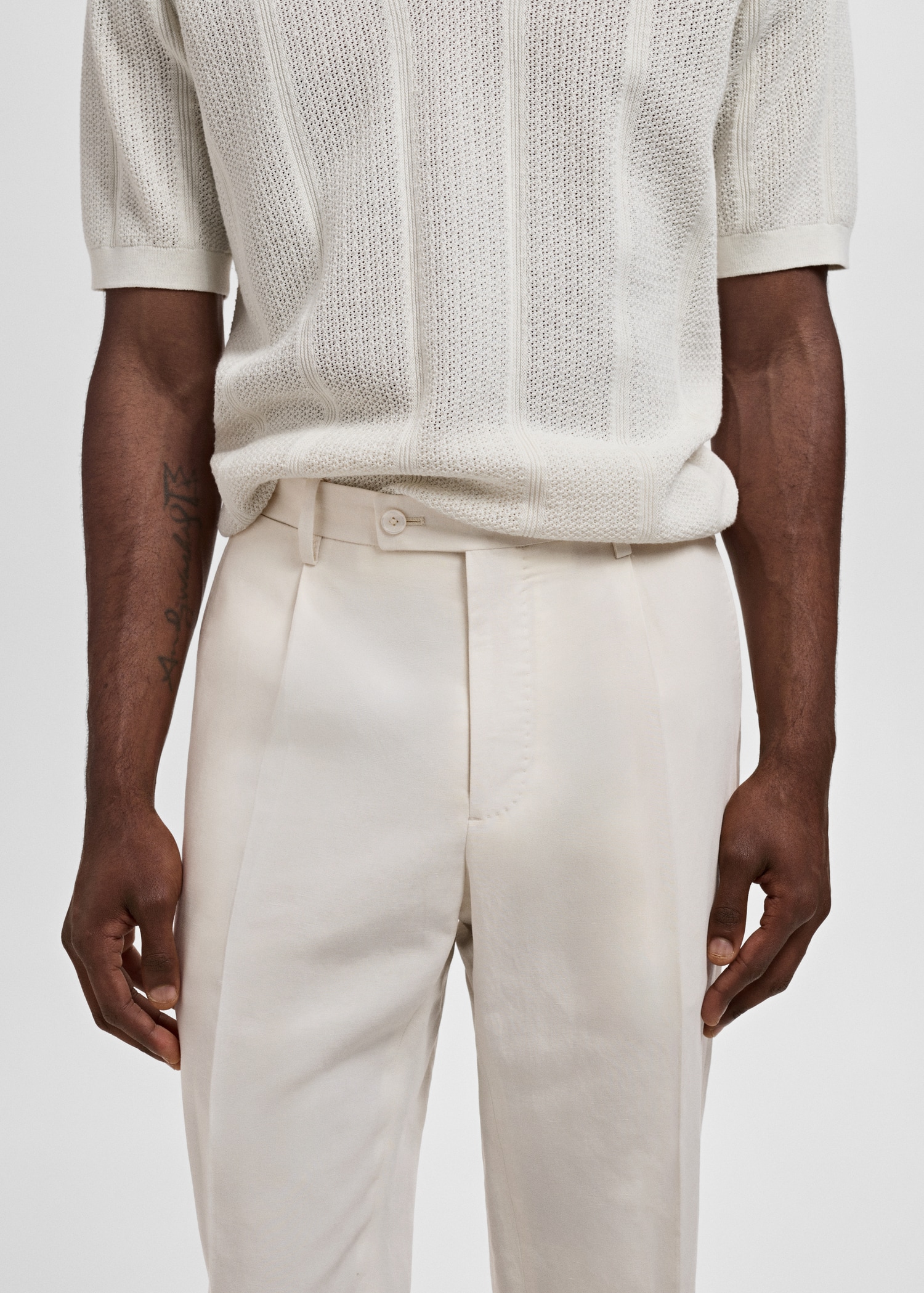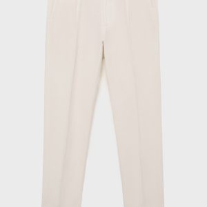 Slim fit. Belt loops. Front closure with double-breasted buttons and zipper. Side pockets. Front pleat detail. Two welt pockets at the back
