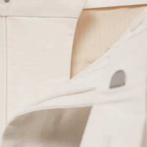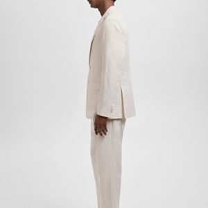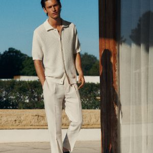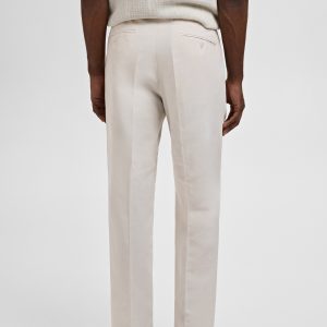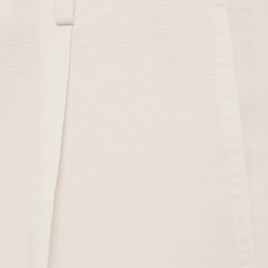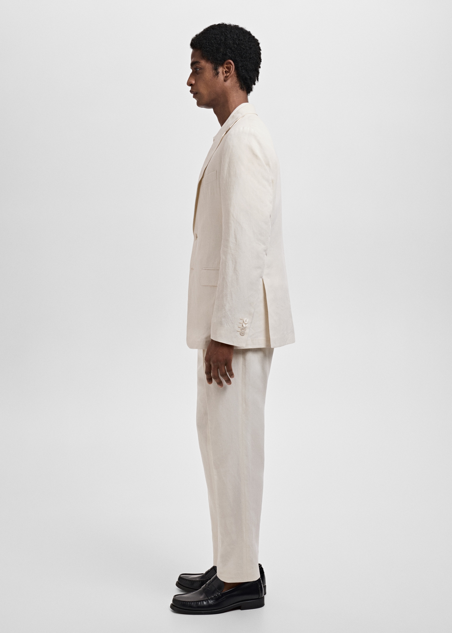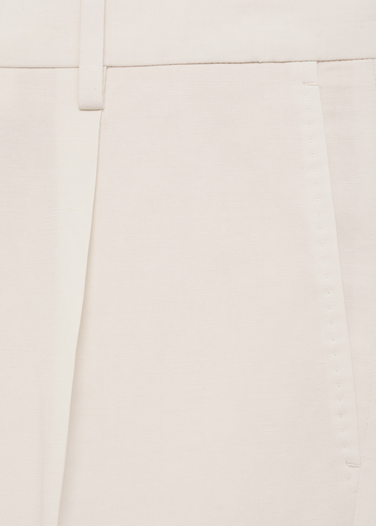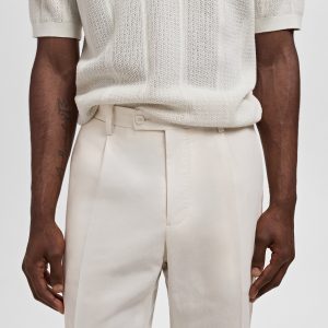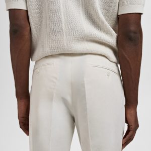 Slim fit. Belt loops. Front closure with double-breasted buttons and zipper. Side pockets. Front pleat detail. Two welt pockets at the back