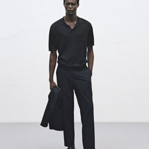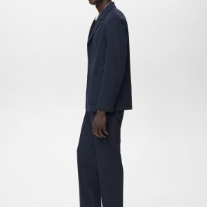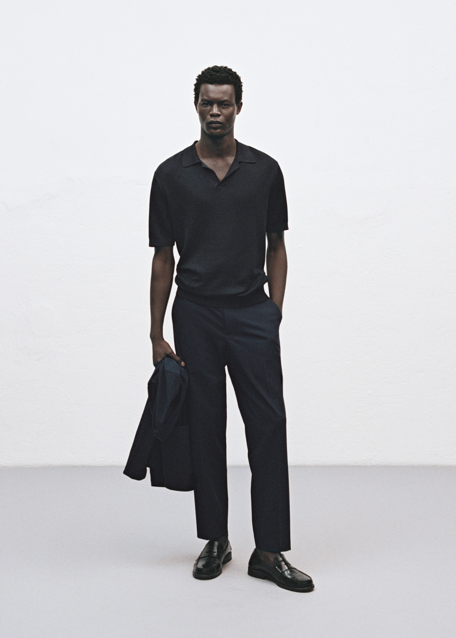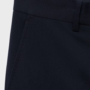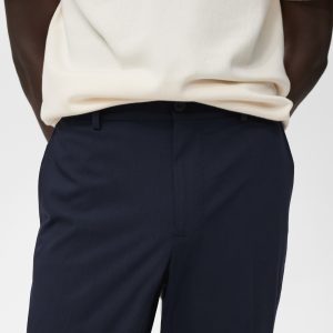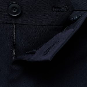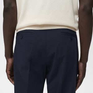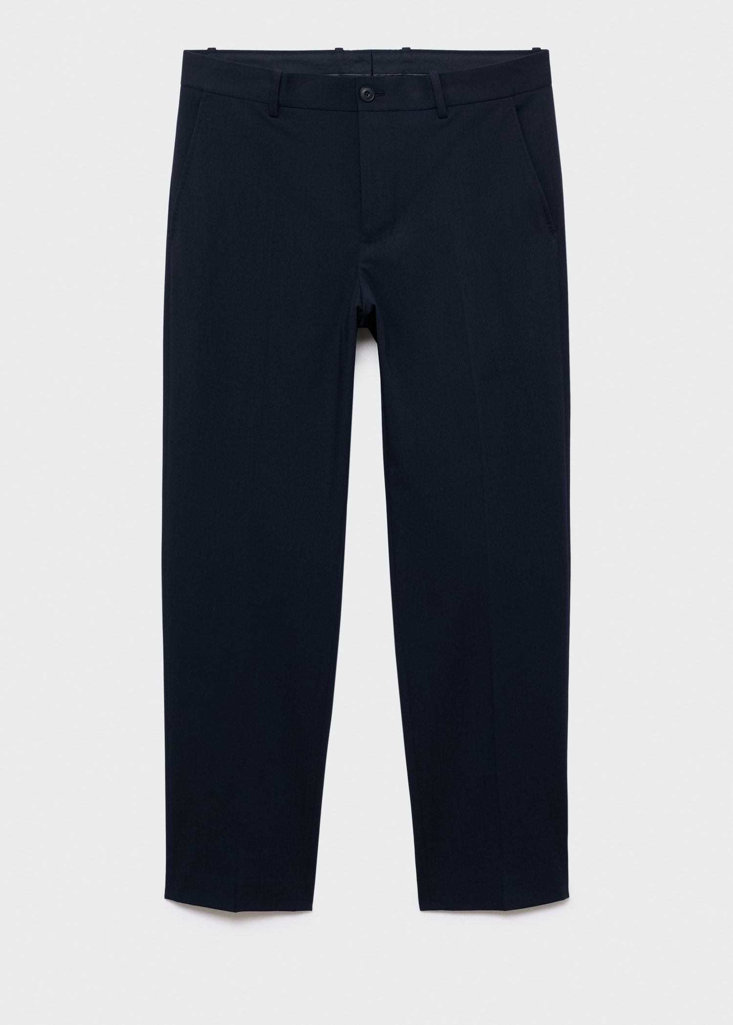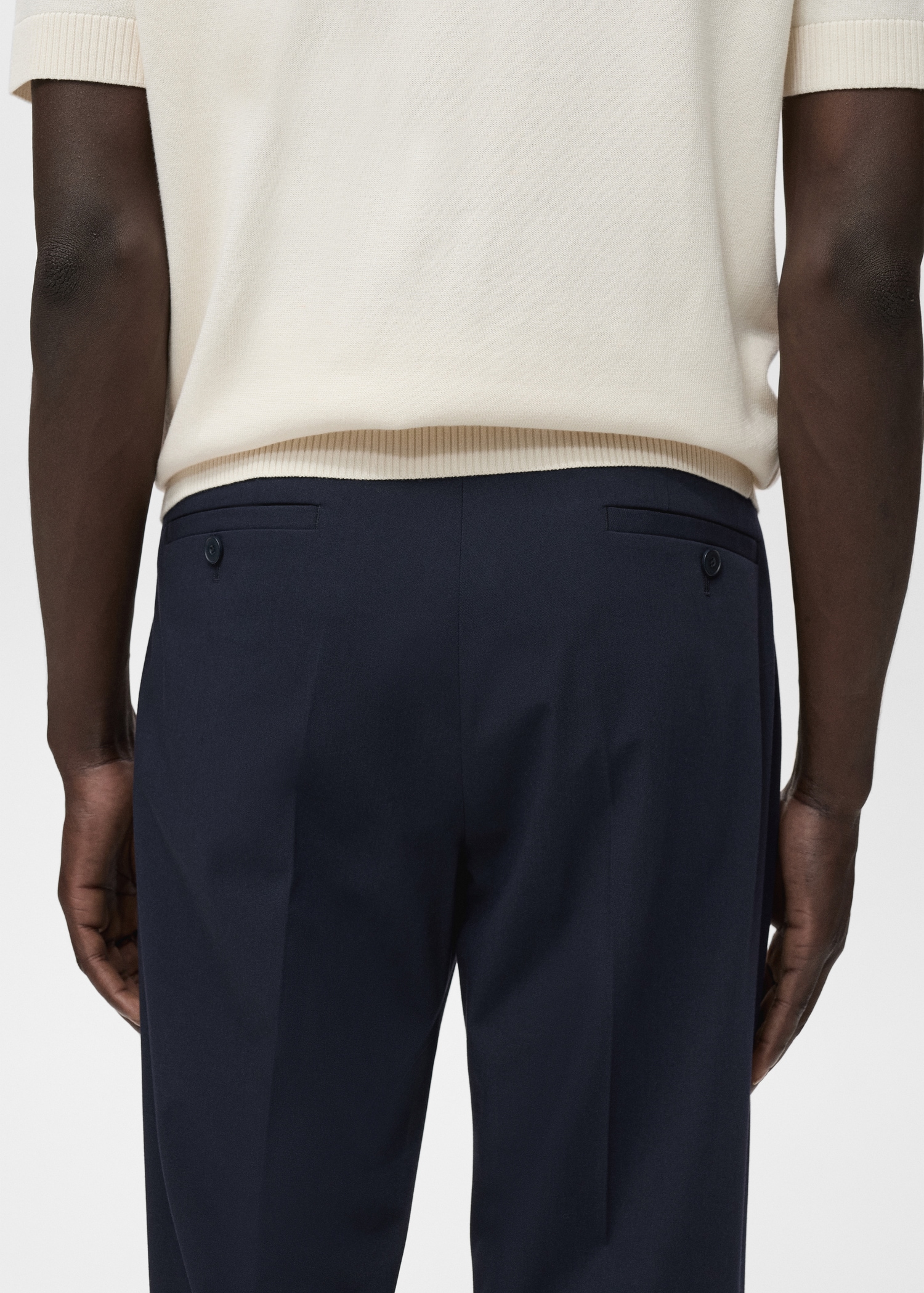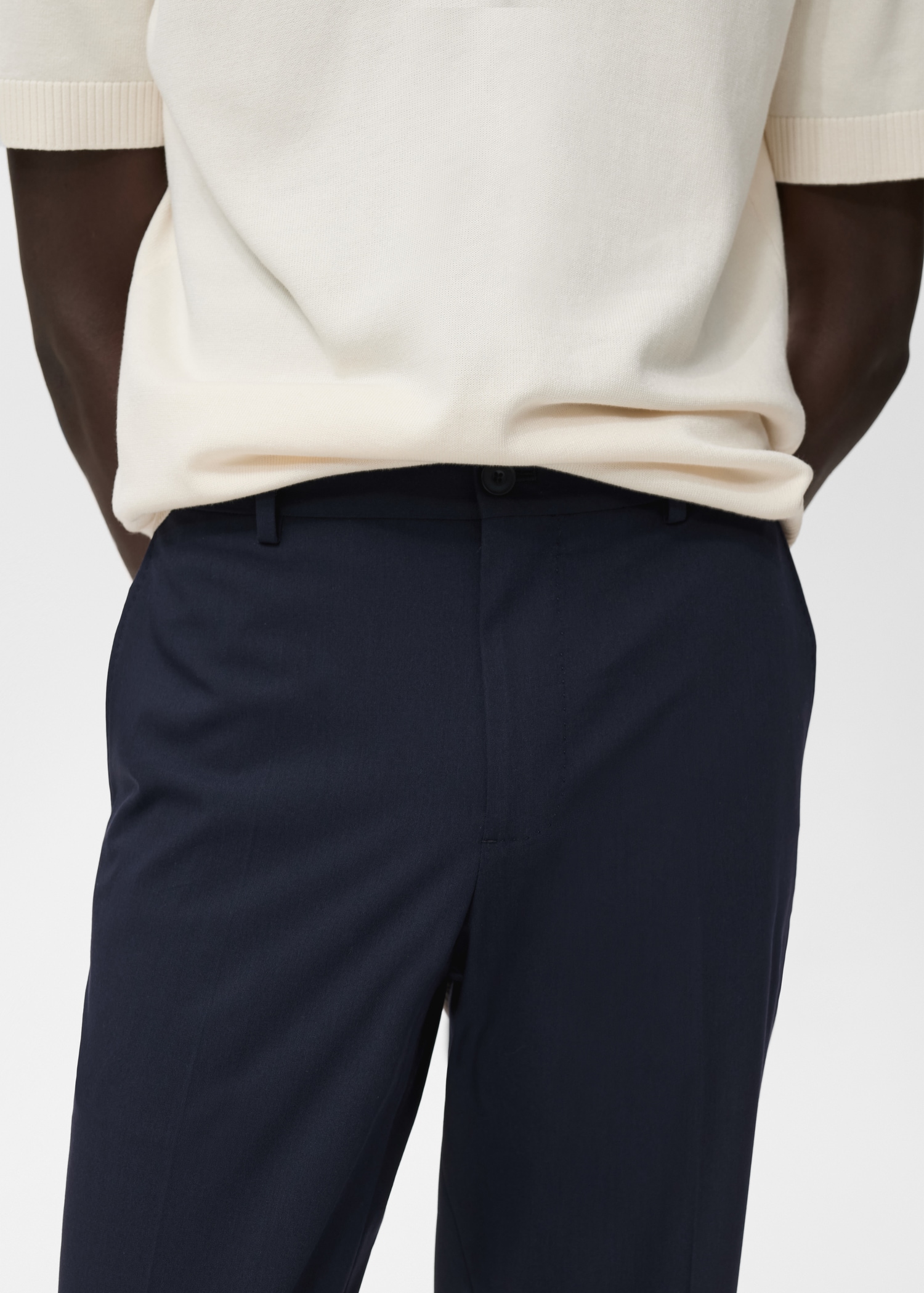 Slim fit. Front closure with double-breasted buttons and zipper. Belt loops. Two side pockets. Two welt pockets with button at the back. Ironed stripe detail at front and back