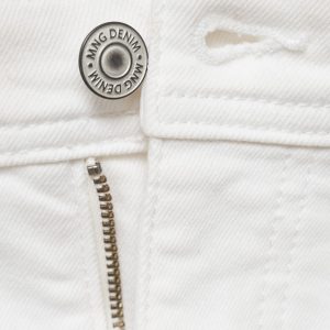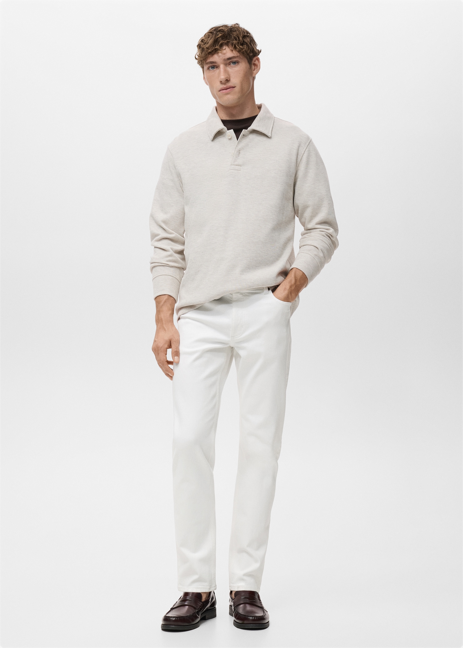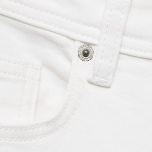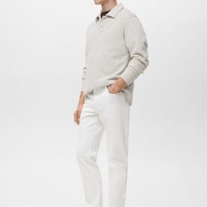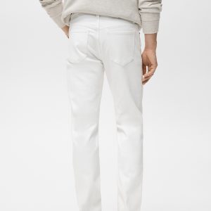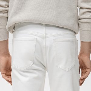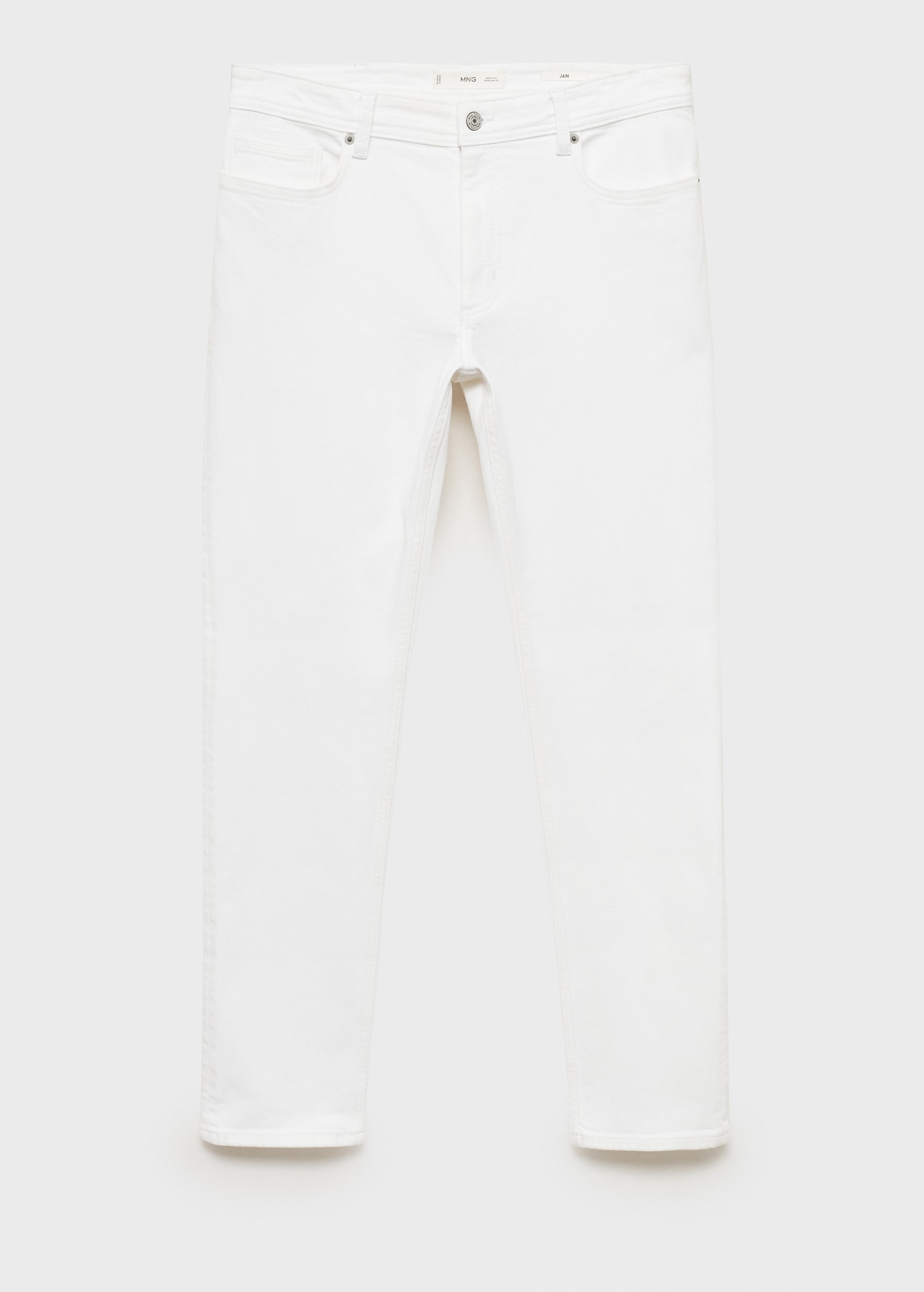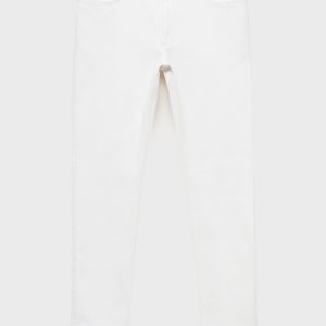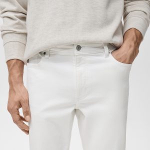 Slim fit. Cotton fabric. Denim jeans style. Button and zipper closure. Side pockets. Coin pocket. Two patch pockets at the back. Stretch cotton fabric. Mid-rise. Belt loops. Five pockets. Zip and button closure. Two front pockets