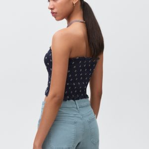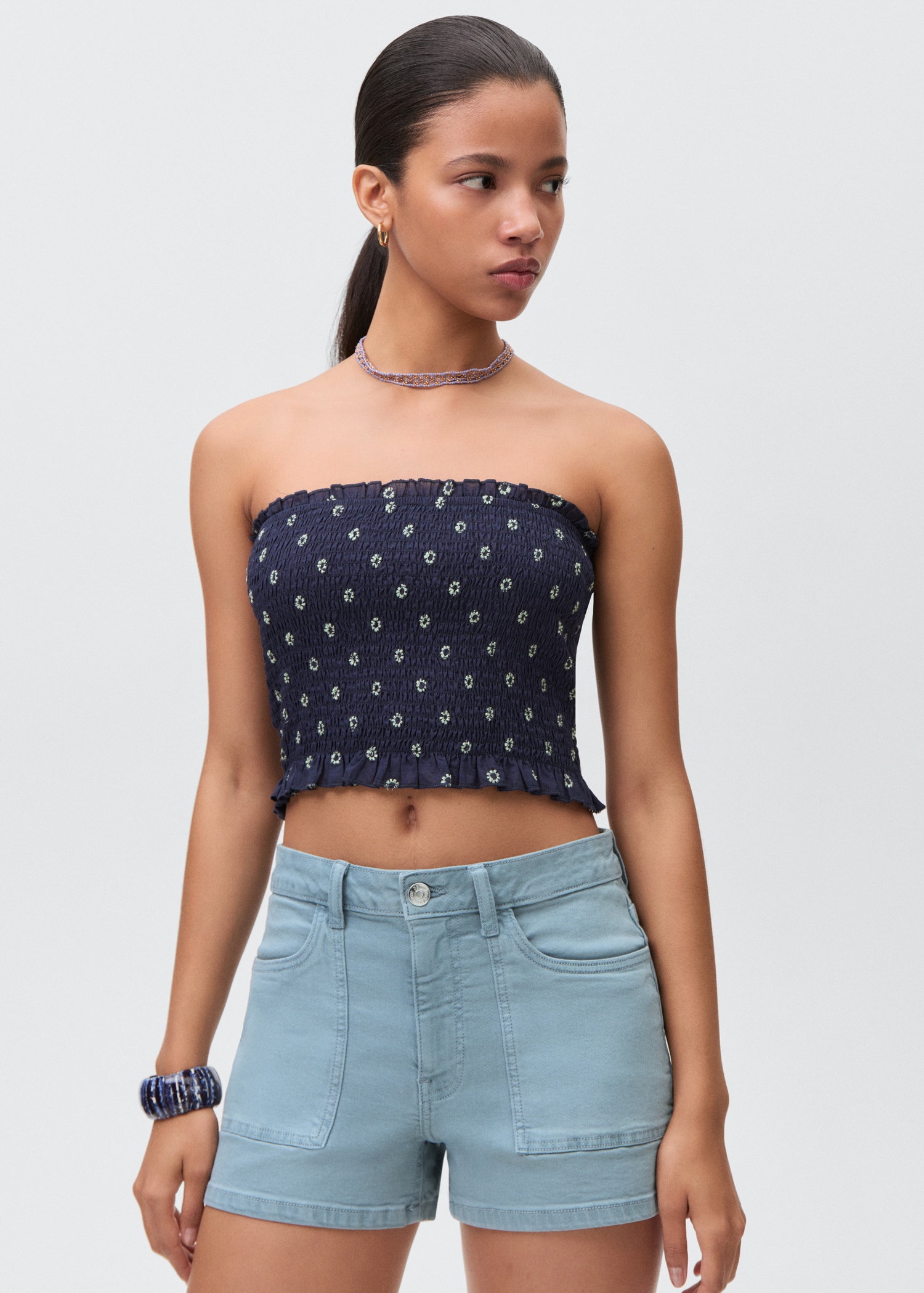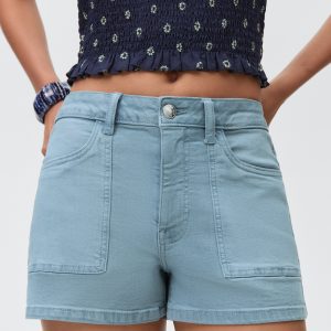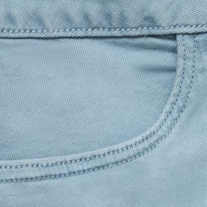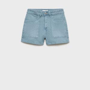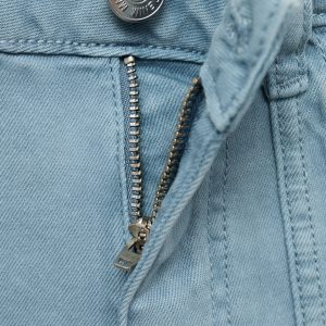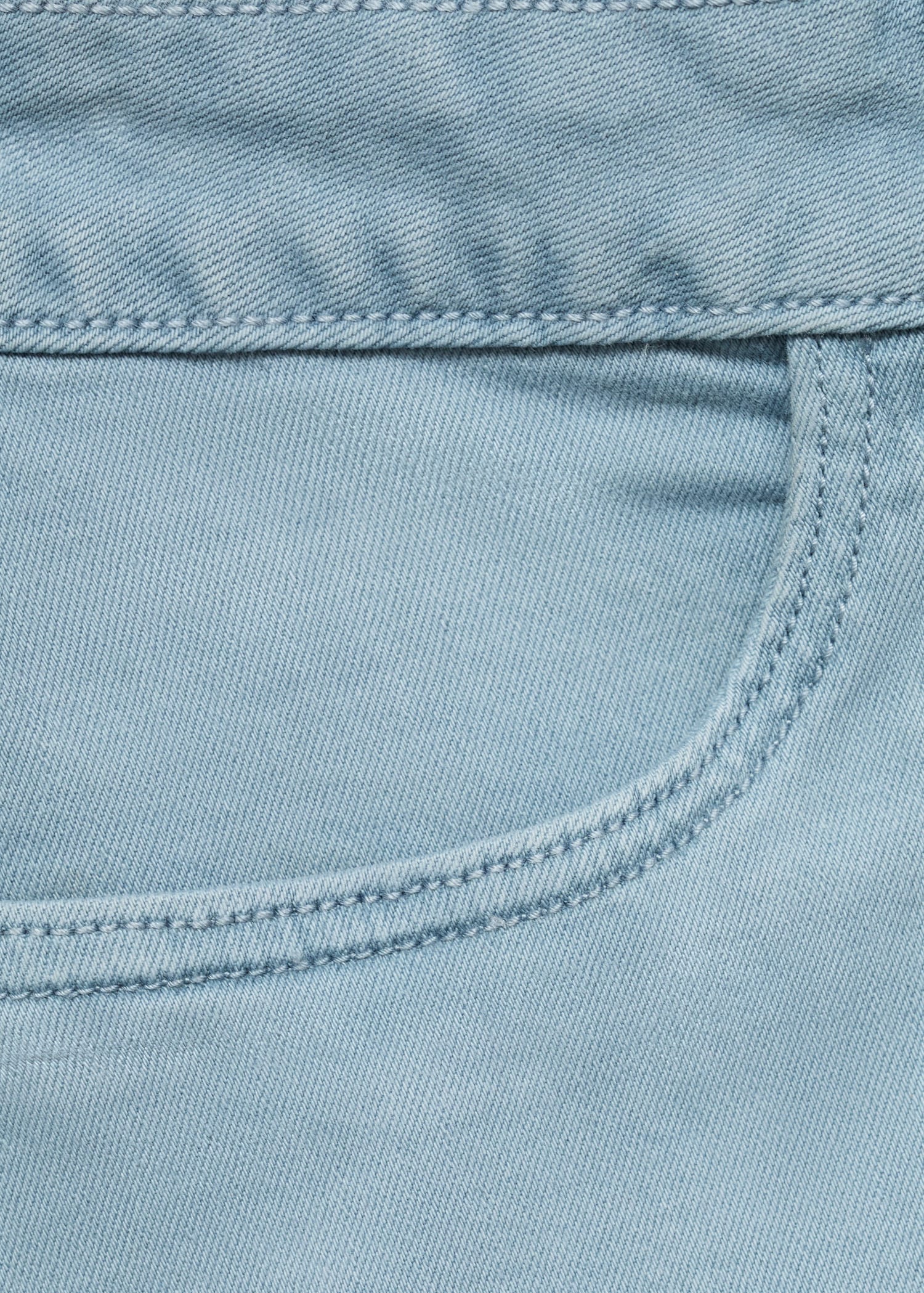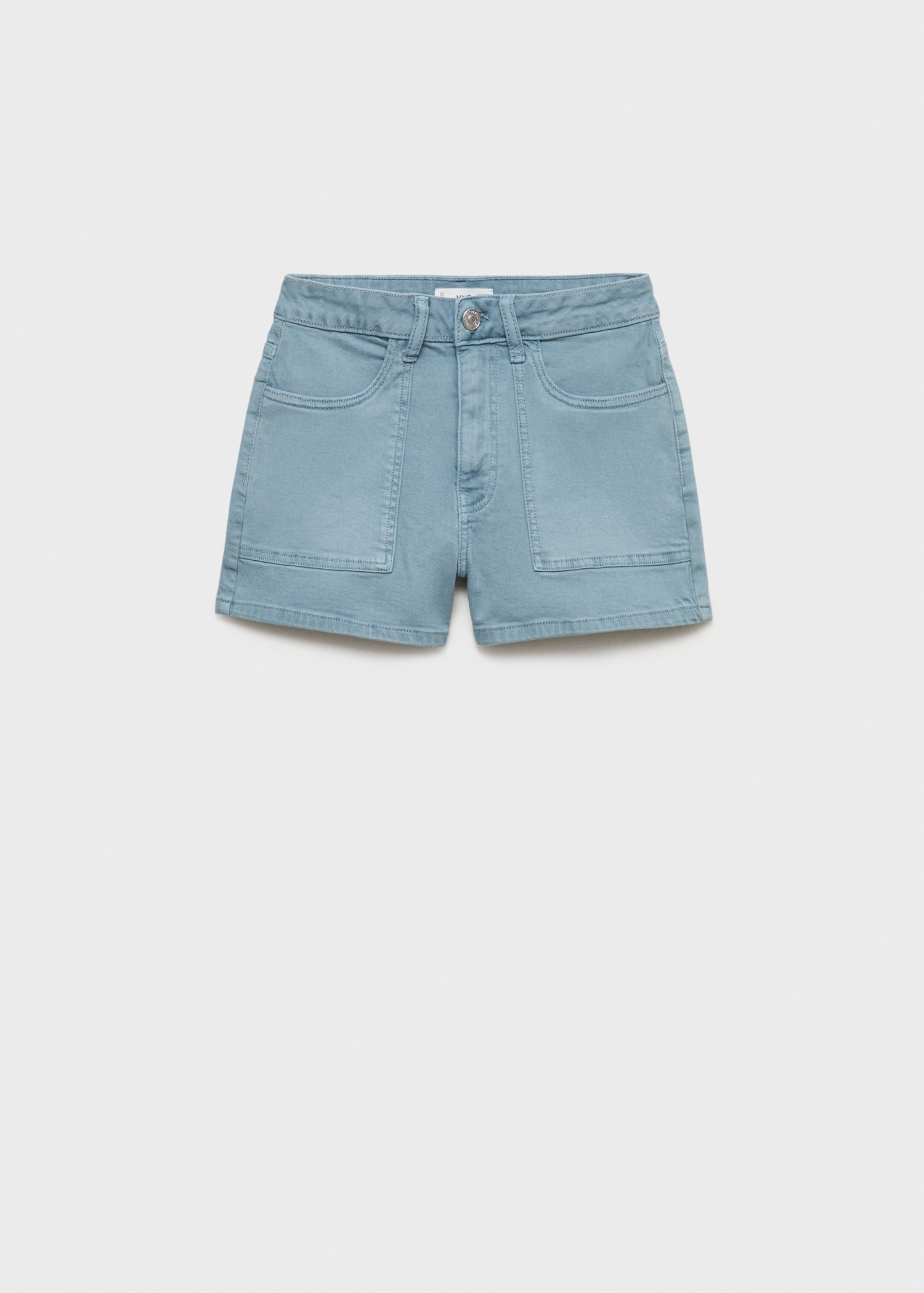 Cotton fabric. Stretch fabric. Denim jeans style. Straight Design. Short design. Belt loops. Zip and button closure. Two side pockets. Two patch pockets at the back