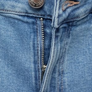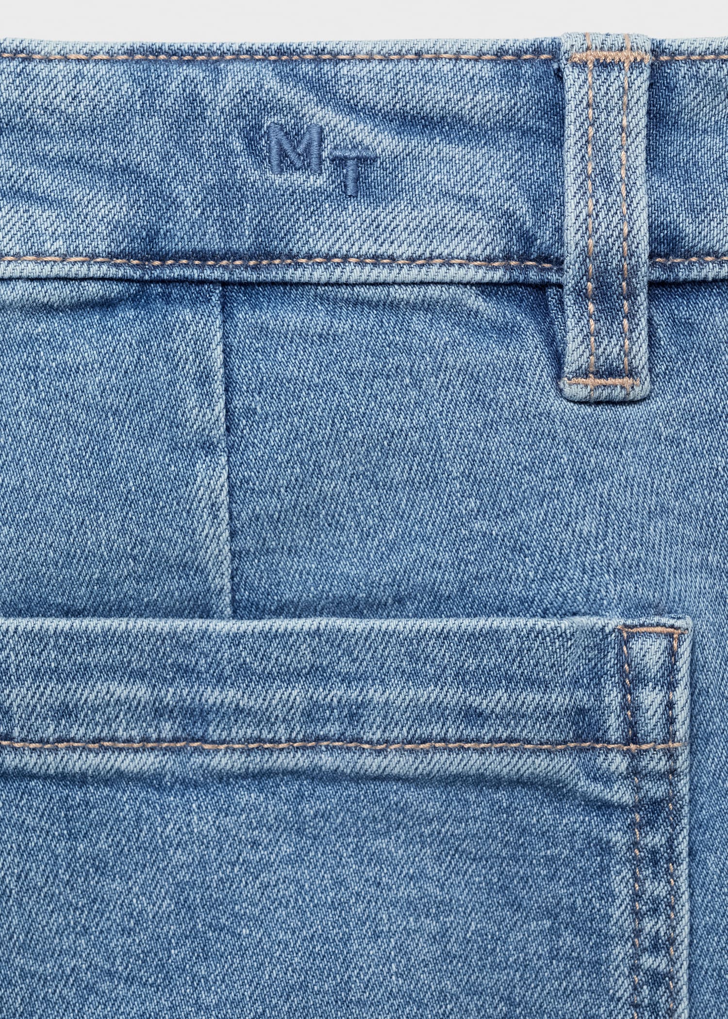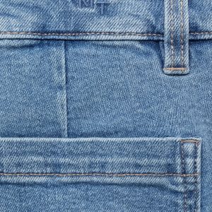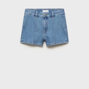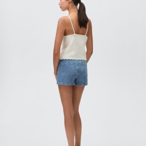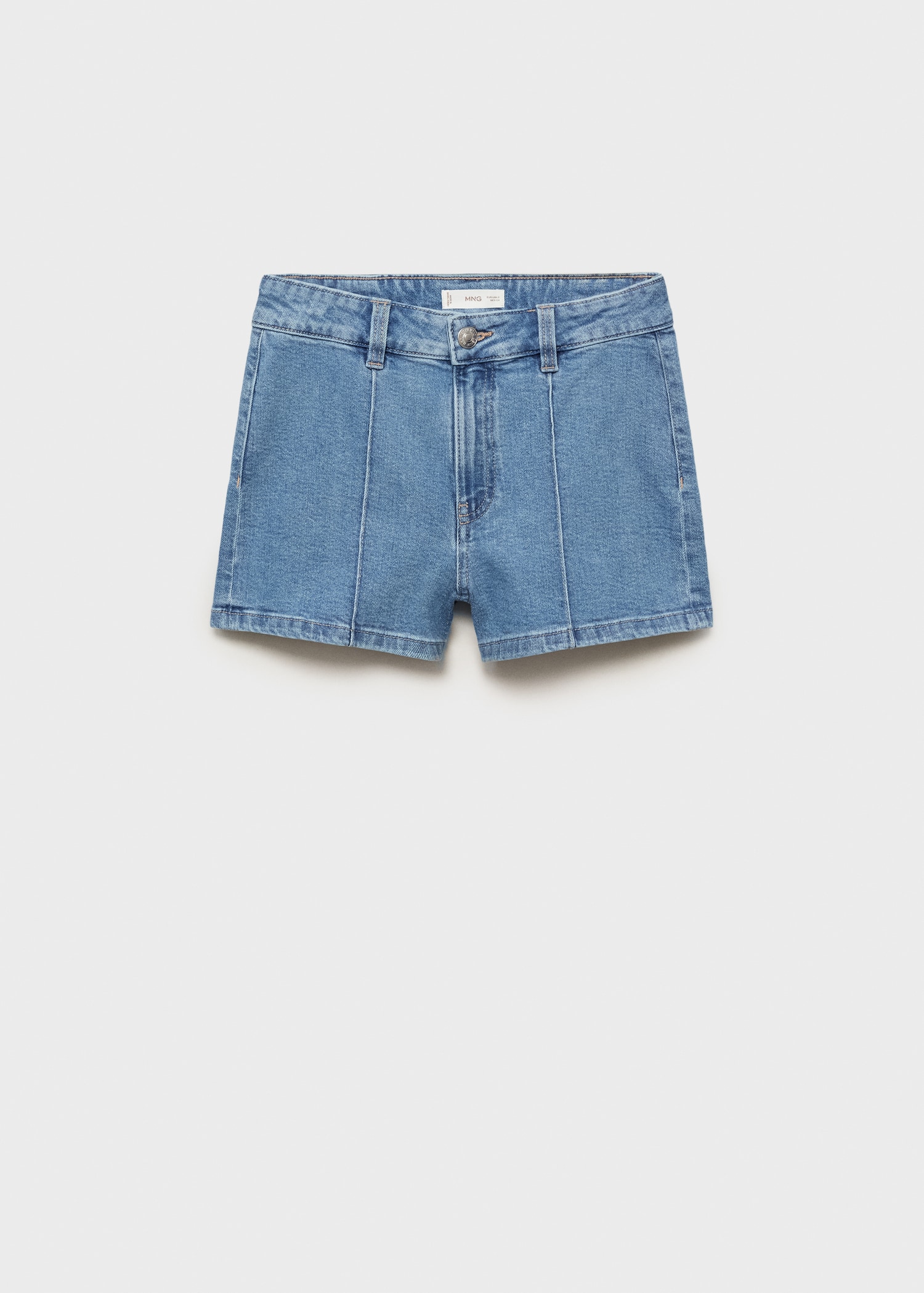 Cotton denim fabric. Straight Design. Short design. Decorative seams. Belt loops. Two patch pockets at the back. Zip and button closure. Promotional product