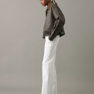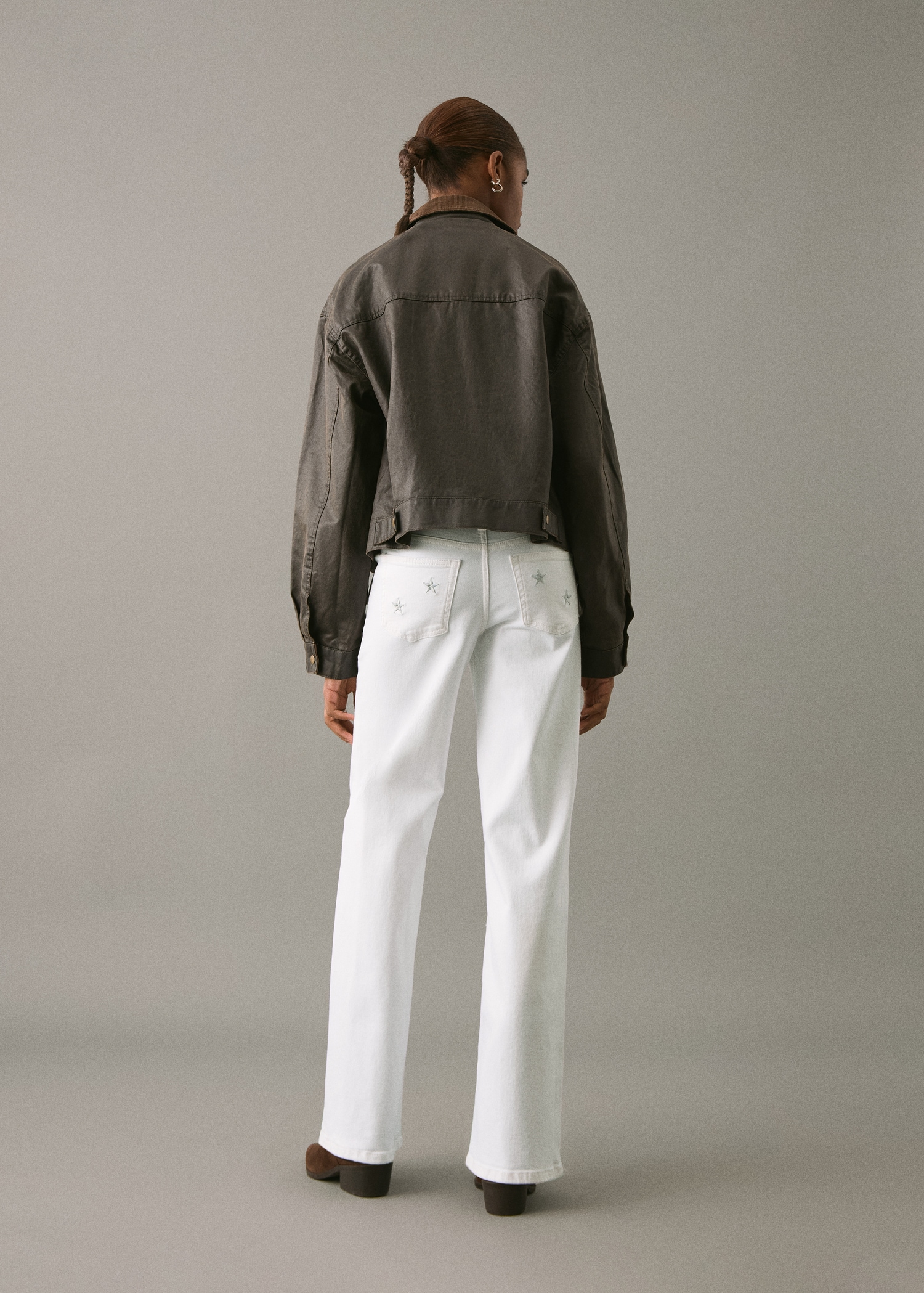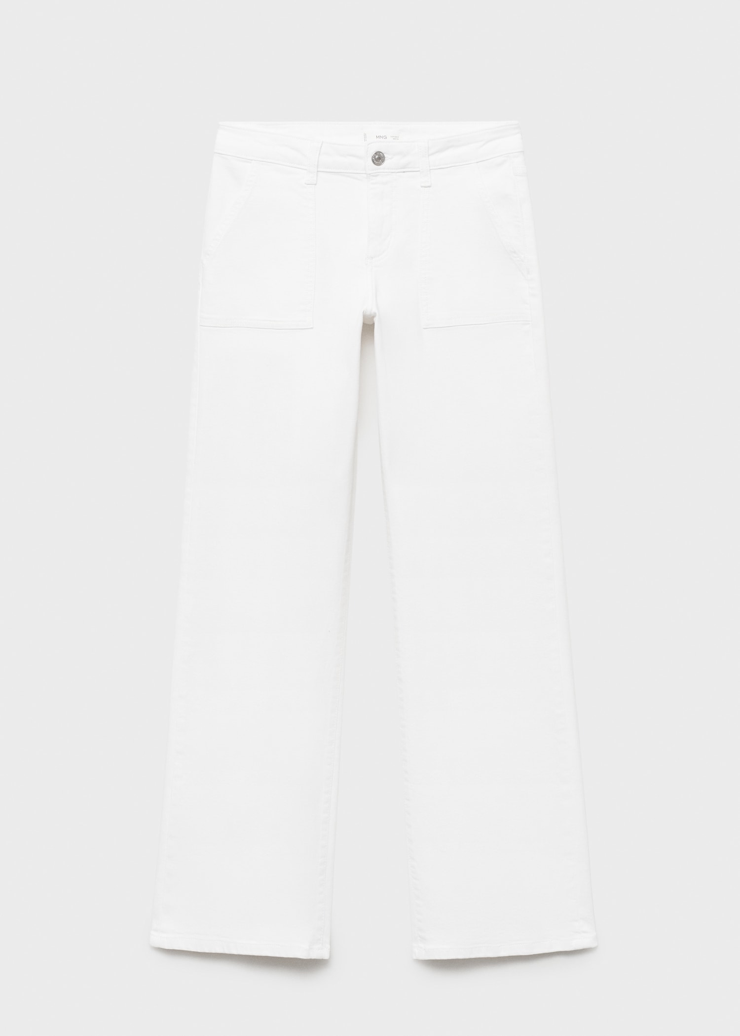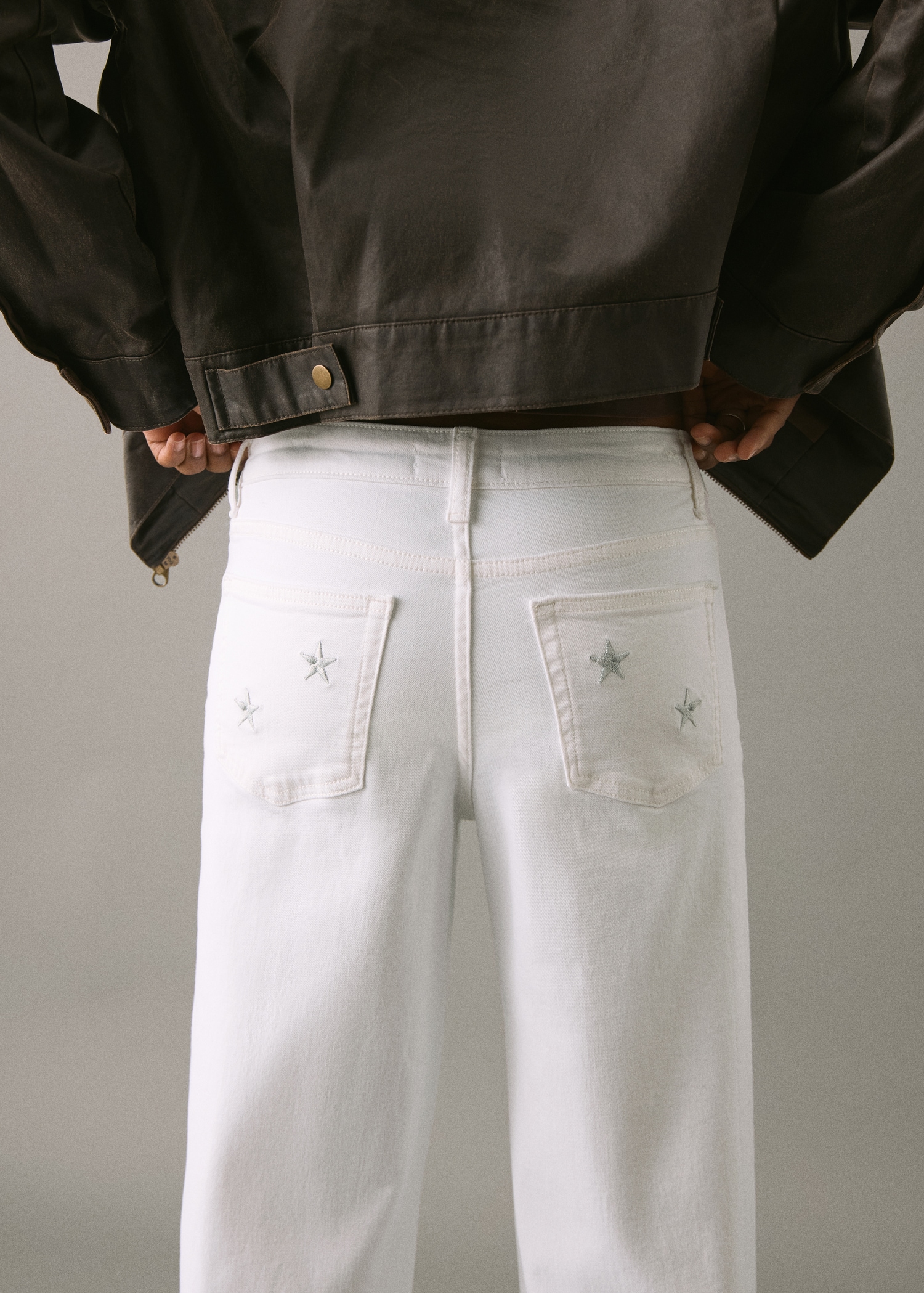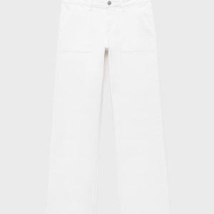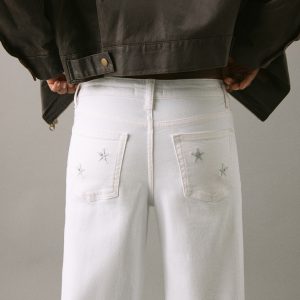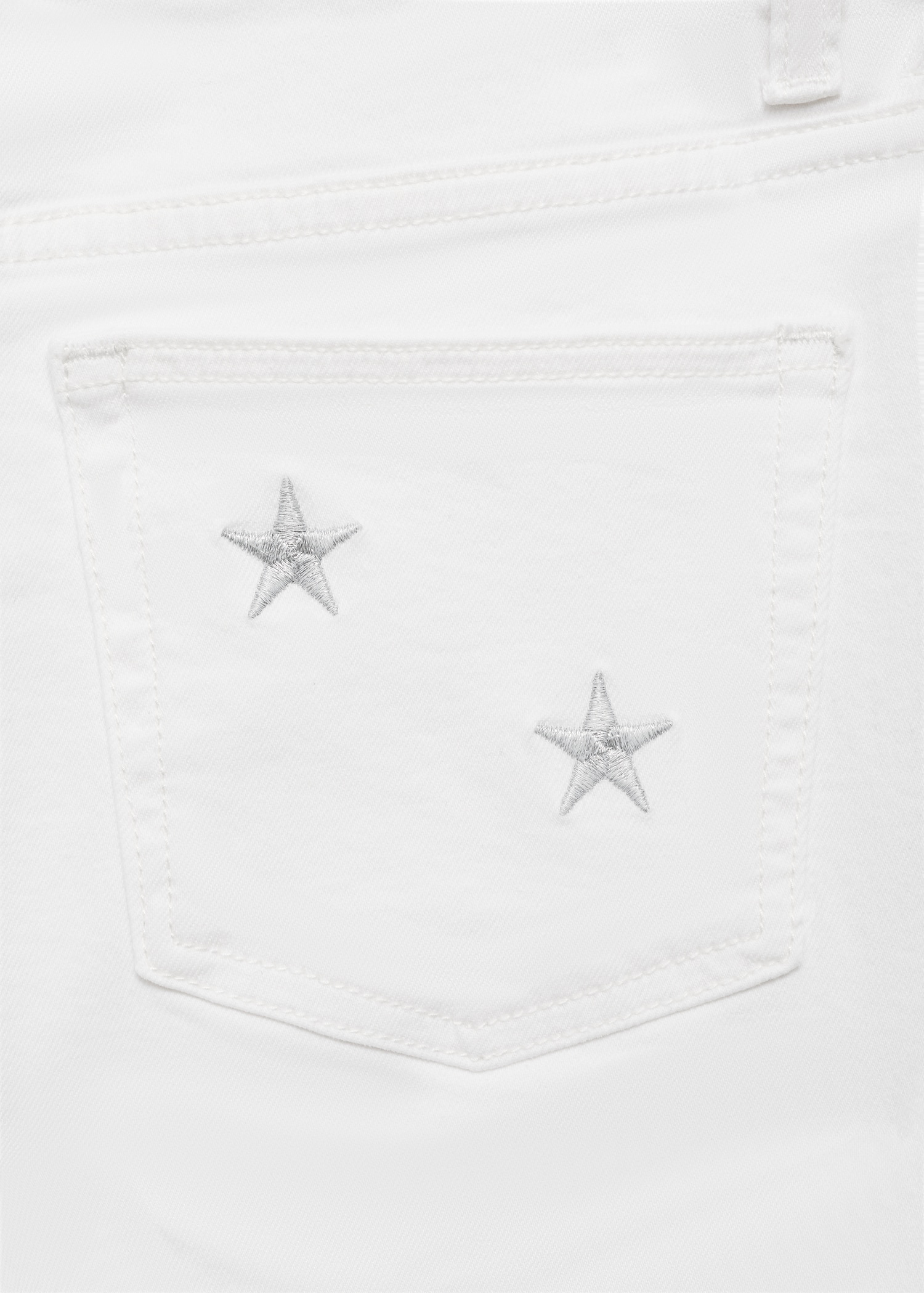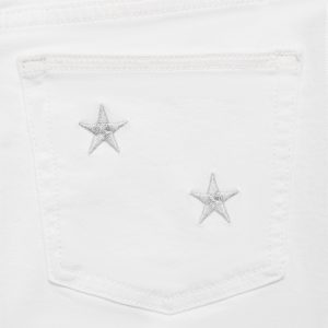 Cotton fabric. Stretch fabric. Long design. Straight Design. Regular Waist Rise. Belt loops. Button and zipper closure. Two front patch pockets. Two patch pockets at the back. Embroidered stars