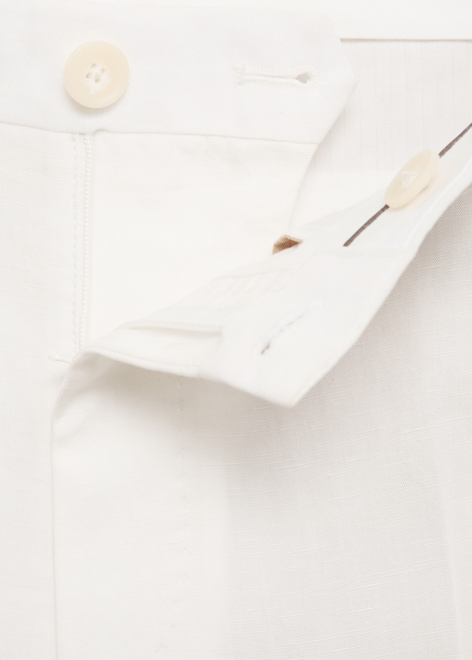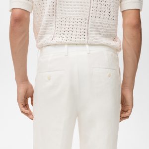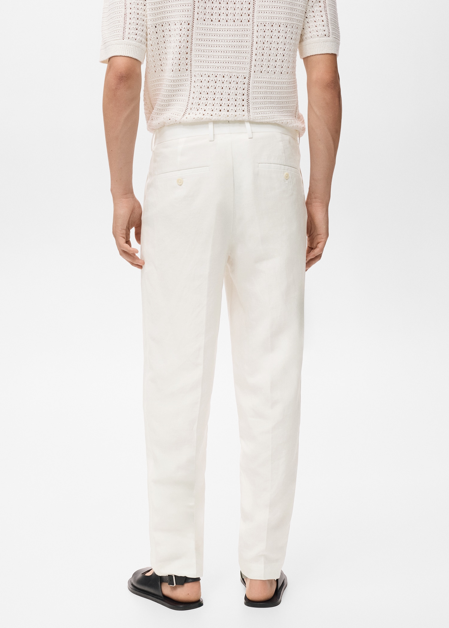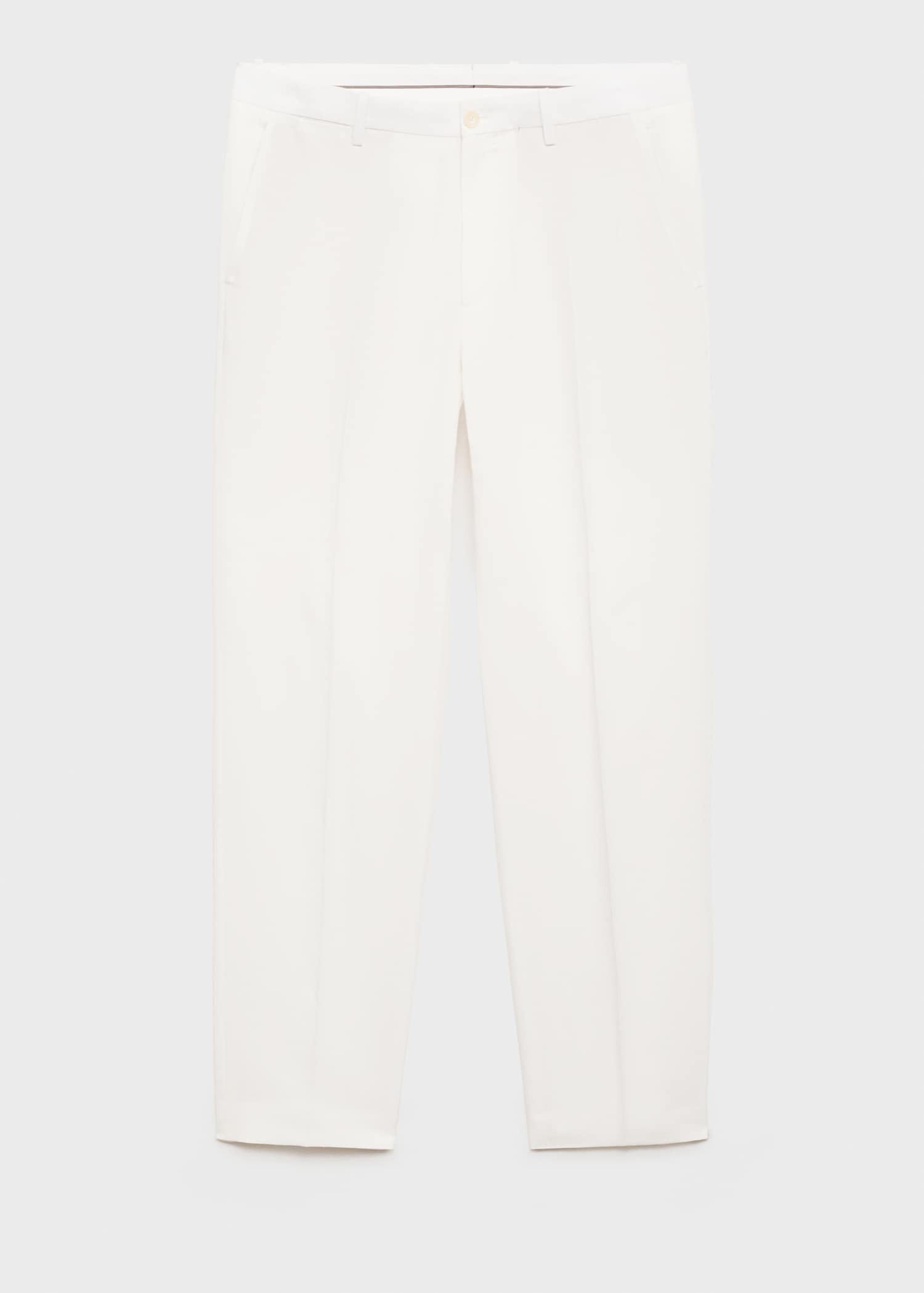 Linen and lyocell blend fabric. Regular fit. Belt loops. Side pockets. Two pockets with button on the back. Ironed stripe detail at front and back. Front closure with double-breasted buttons and zipper
