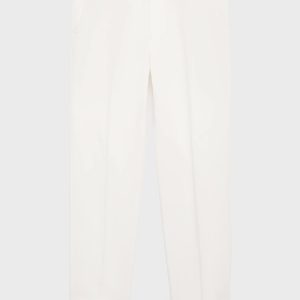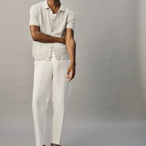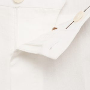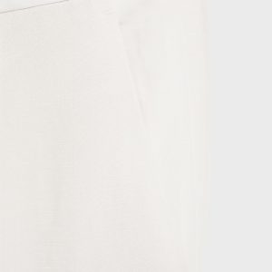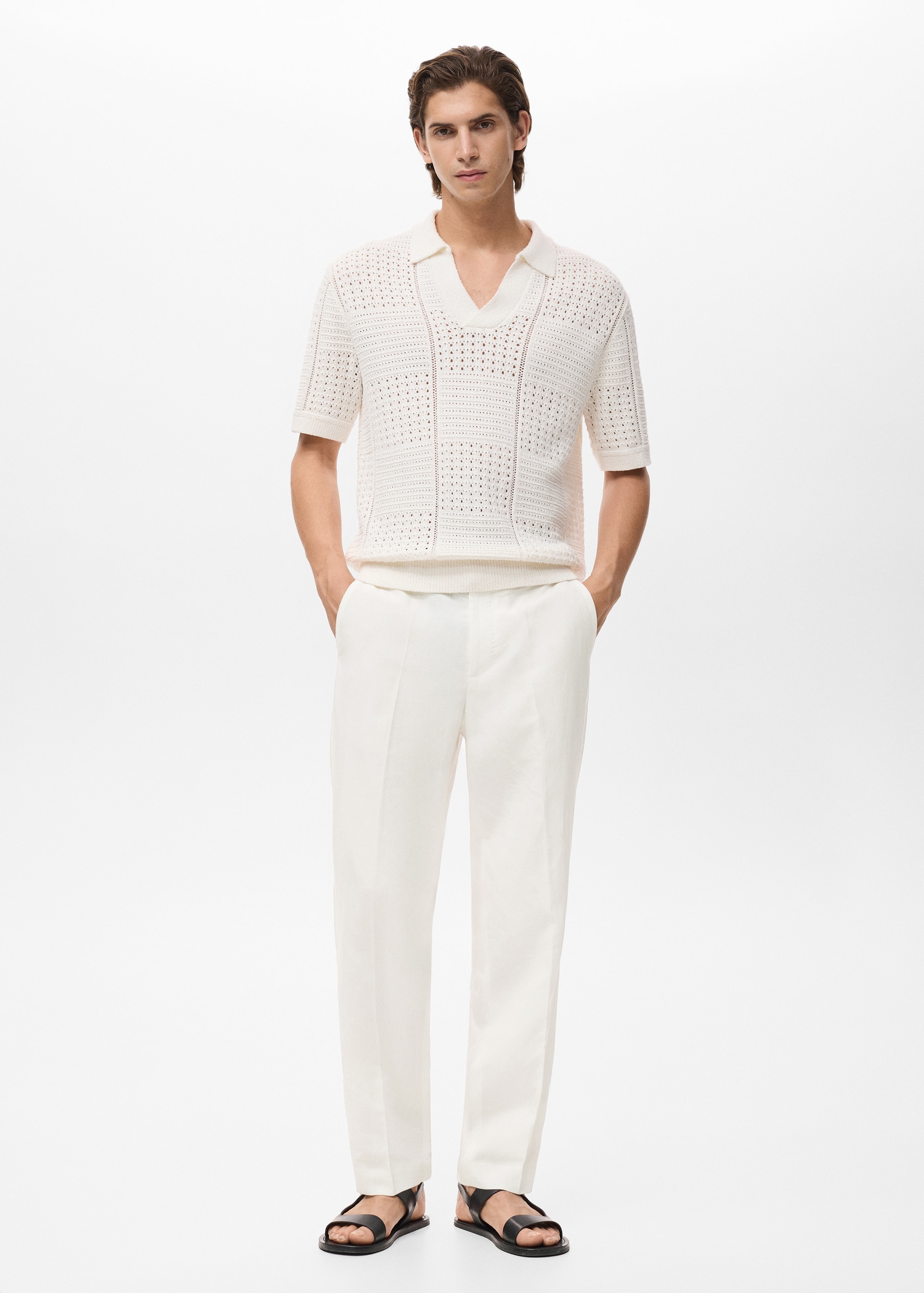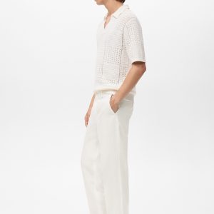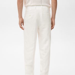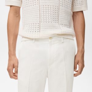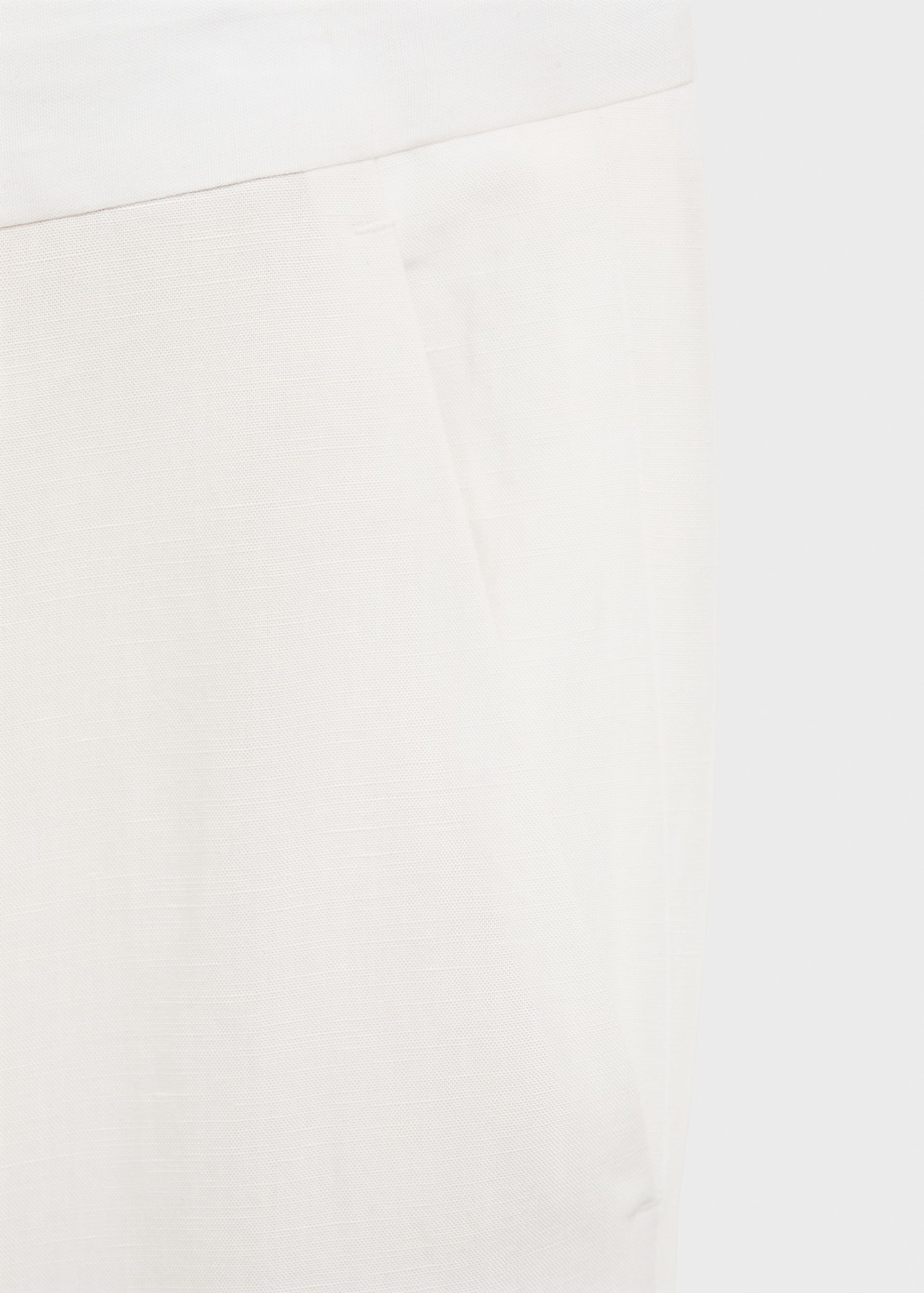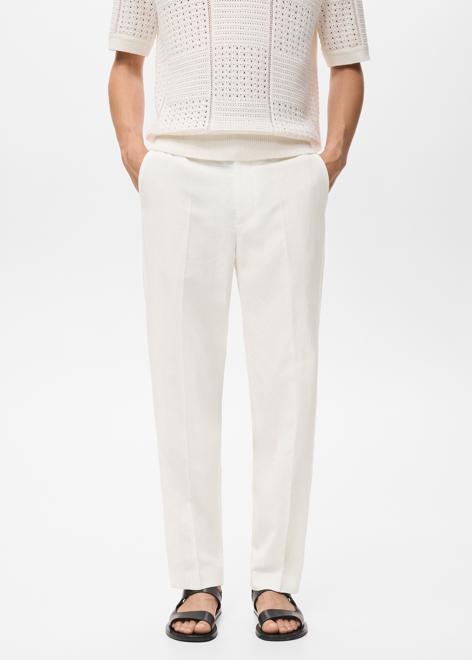 Linen and lyocell blend fabric. Regular fit. Belt loops. Side pockets. Two pockets with button on the back. Ironed stripe detail at front and back. Front closure with double-breasted buttons and zipper