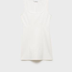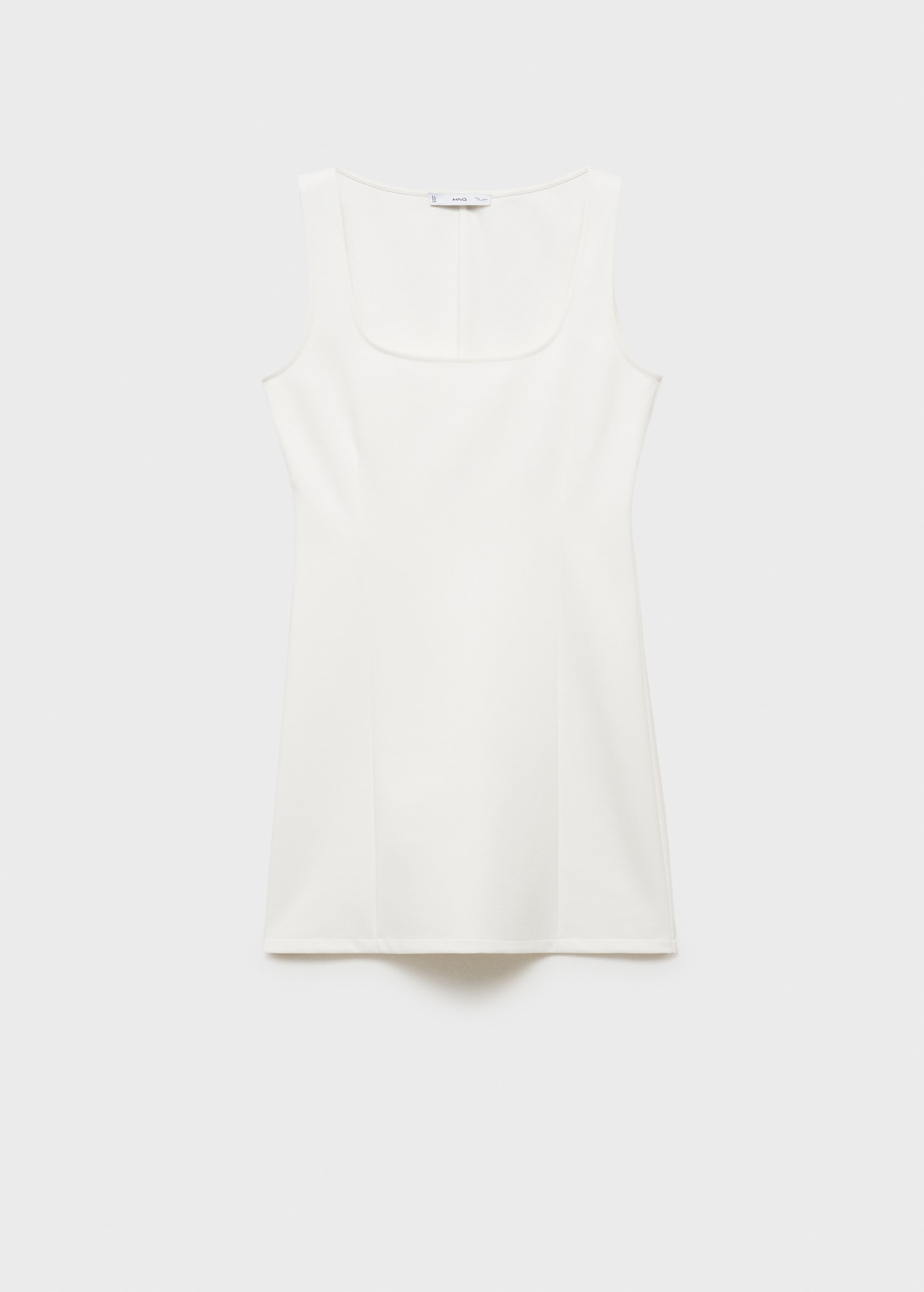 Short design. Fitted design. Low neckline. Sleeveless. Wide straps. Dart detail. No closure