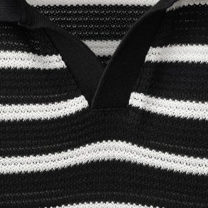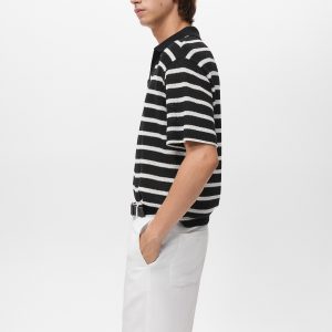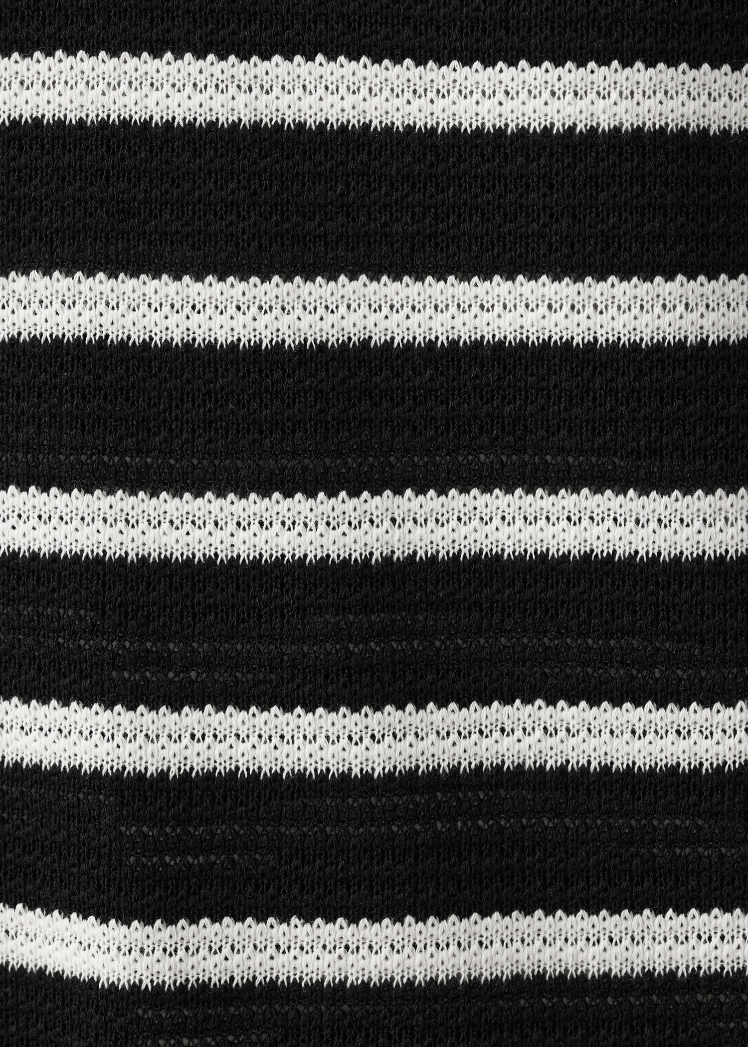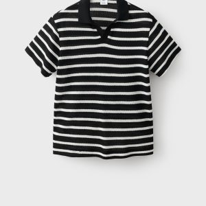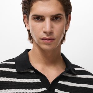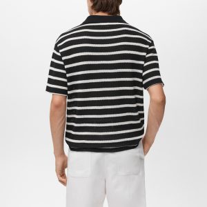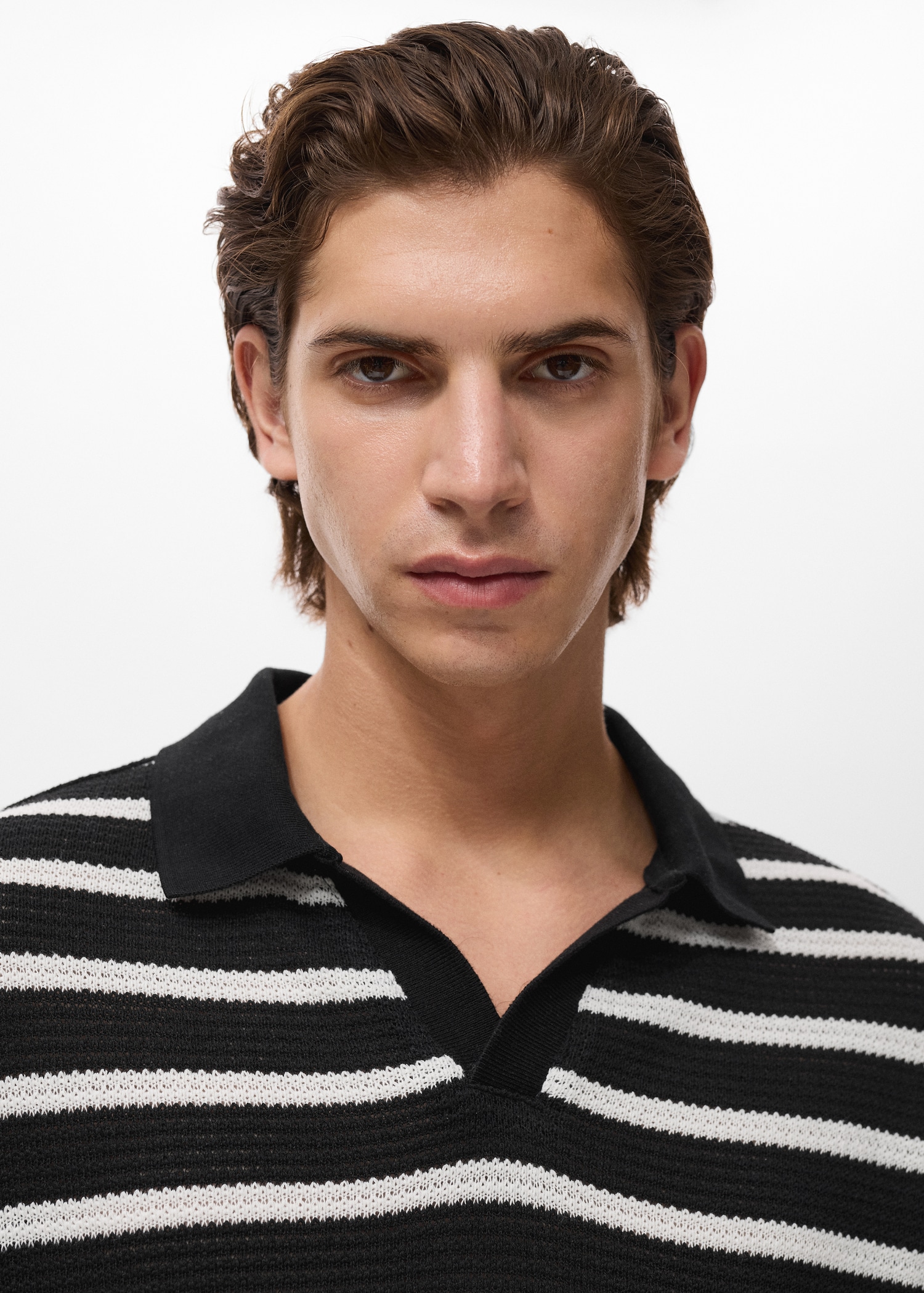 Regular fit. Cotton blend fabric. Crochet design. Braided knit. V-neck polo collar without closure. Short sleeves. Ribbed collar, sleeves and hem