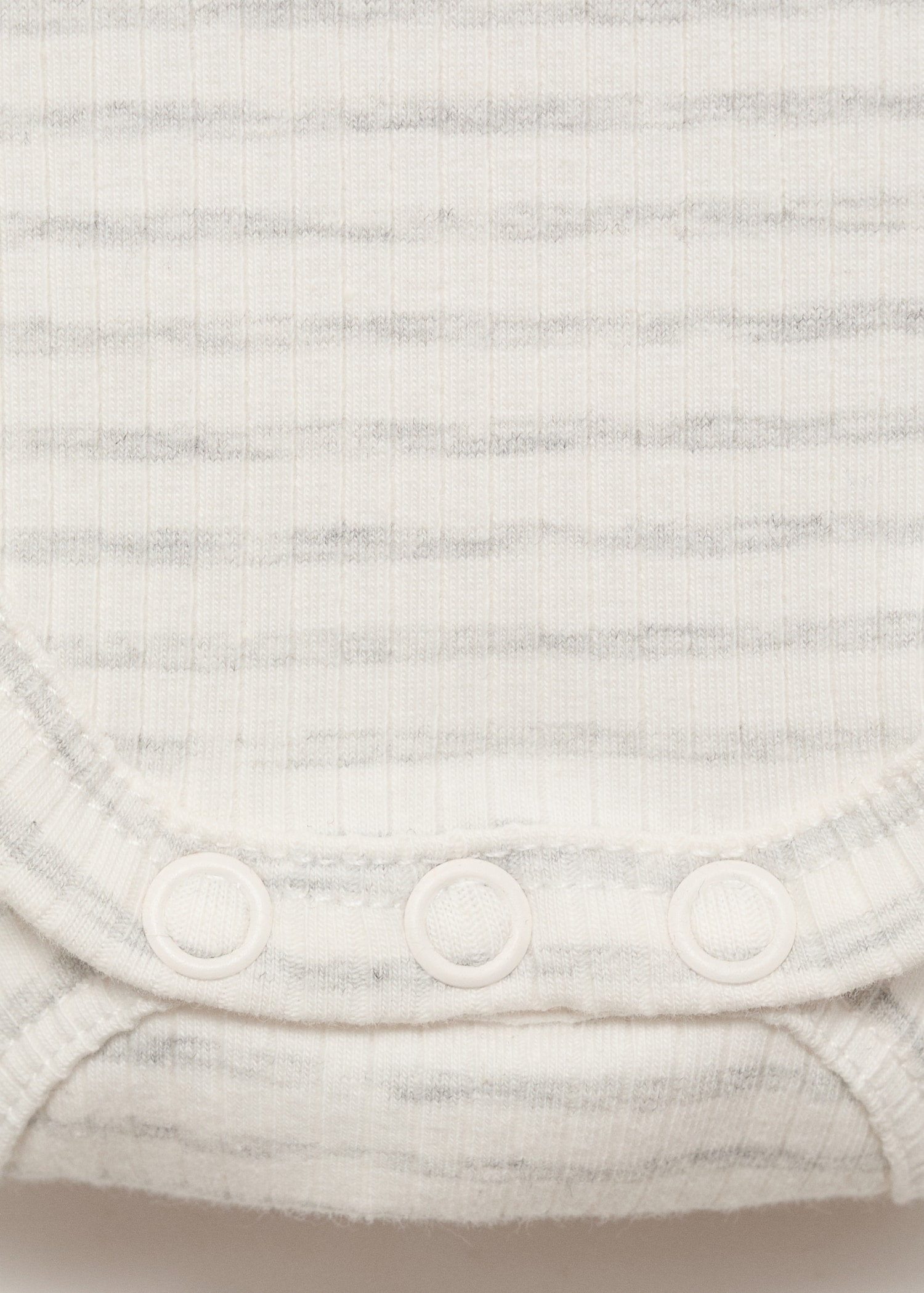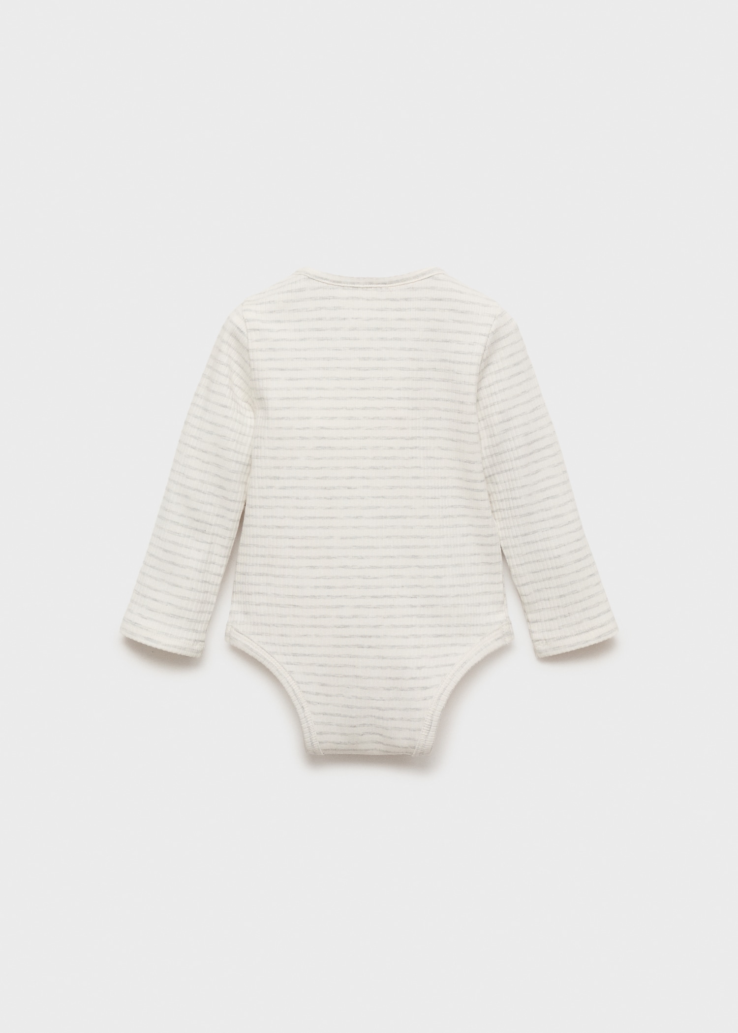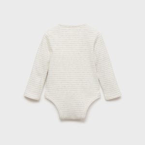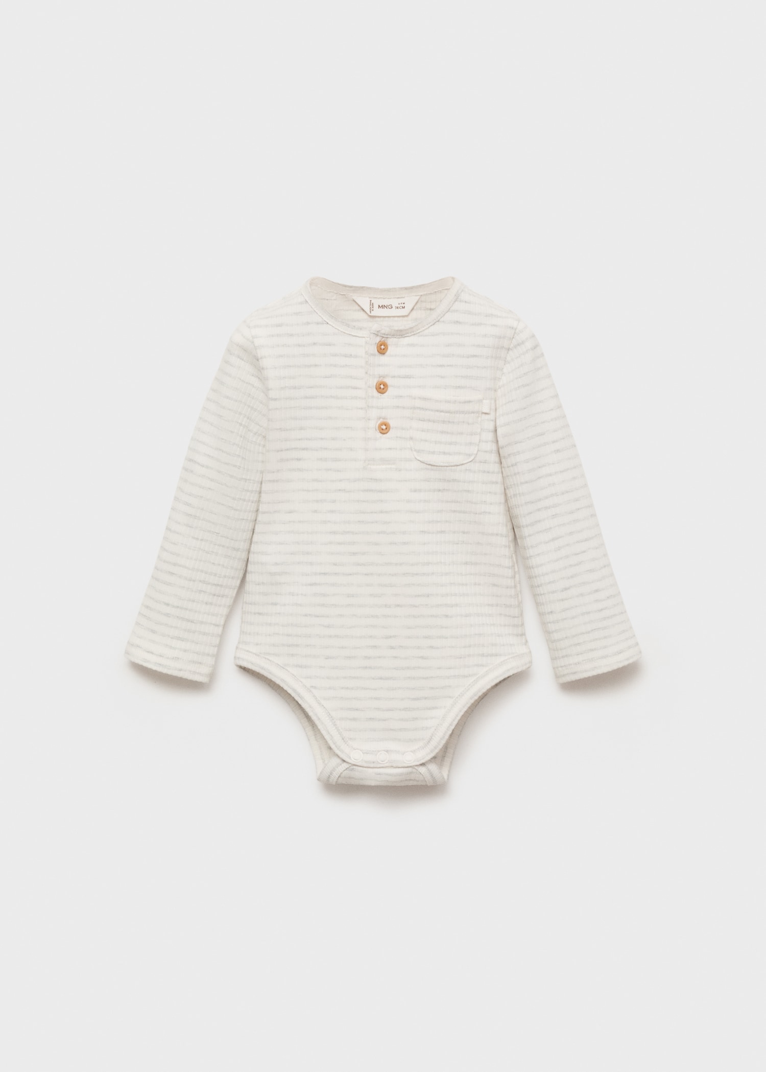 Crafted from striped cotton fabric, this bodysuit design features a round neck with a button closure. It has long sleeves, a front patch pocket, and a button closure opening at the hem