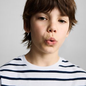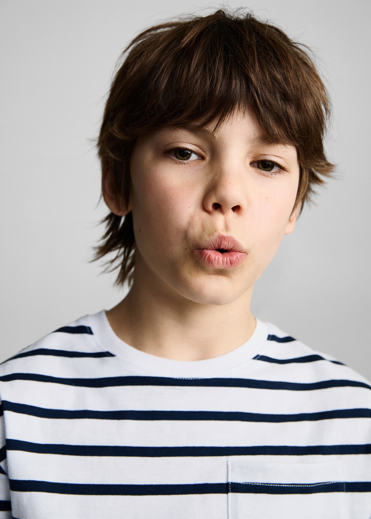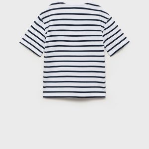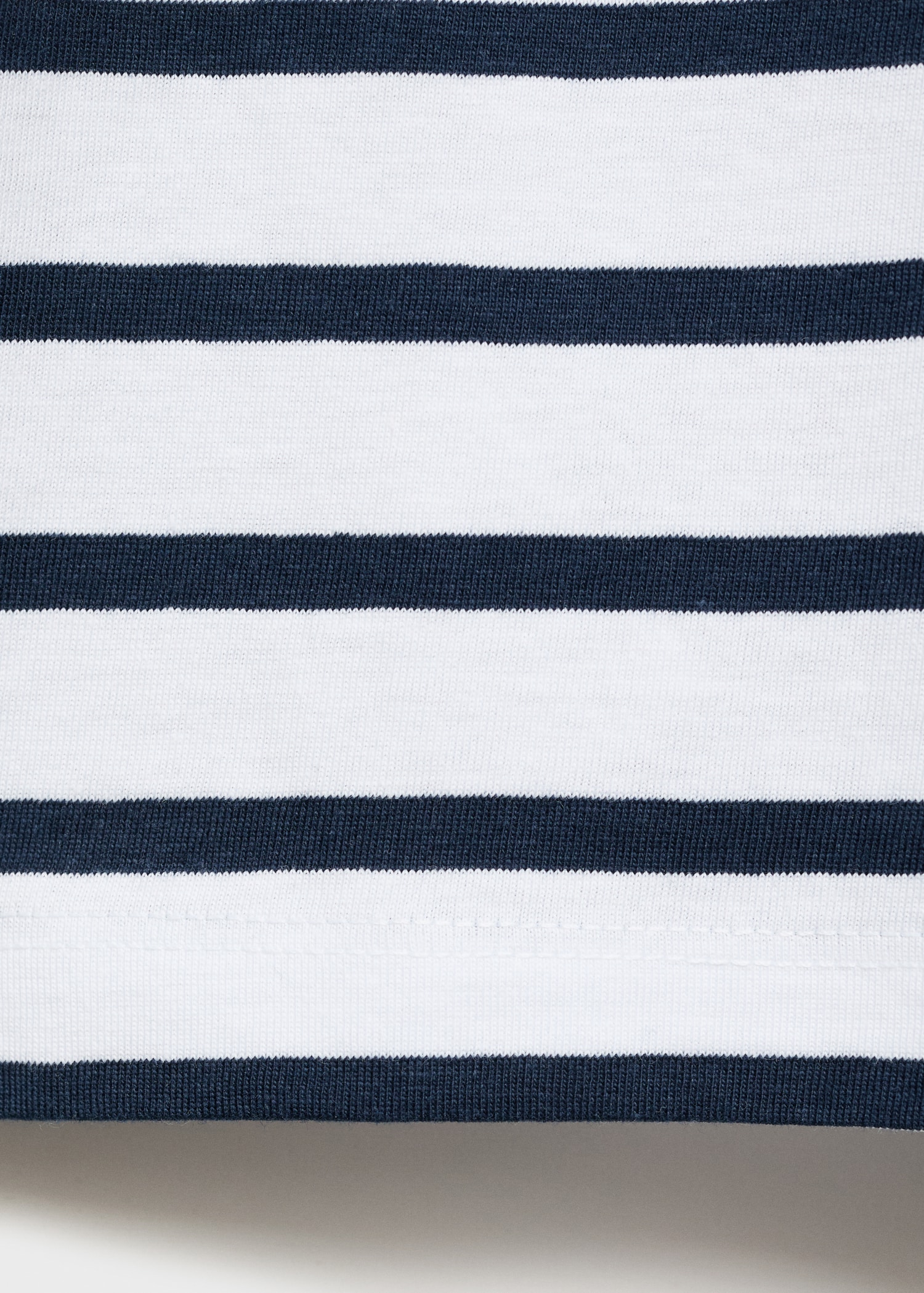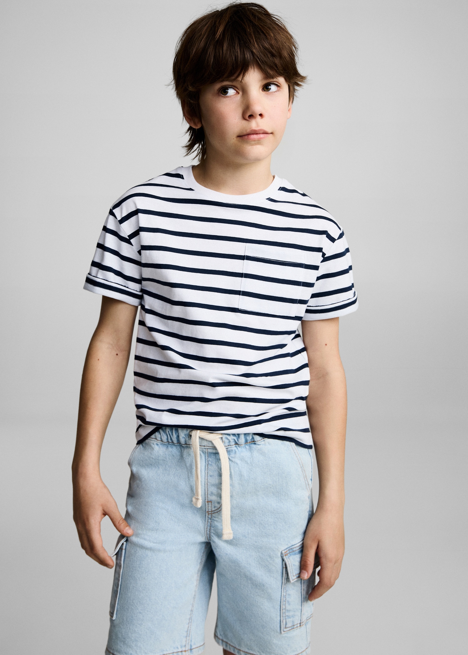 100% Cotton. Striped design. Chest welt pocket. Contrast collar. Round neck with ribbed finish. Short sleeves