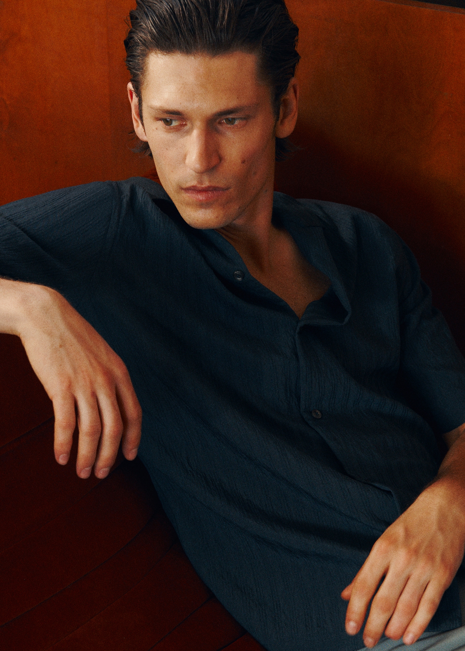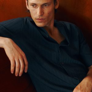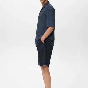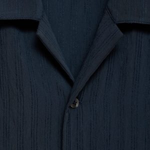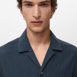 Regular fit. Viscose fabric. Embroidered stripe detail. Bowling collar. Short sleeve. Front button closure. Straight hem