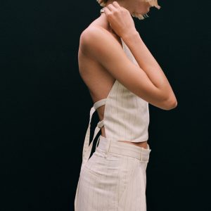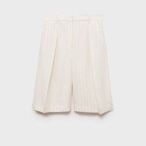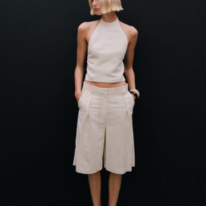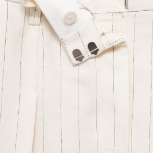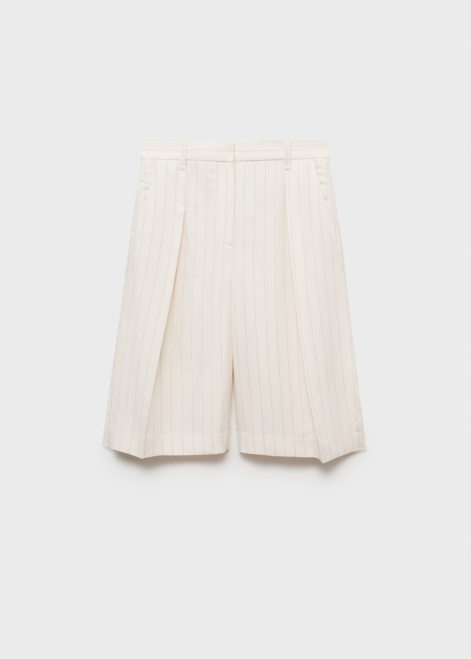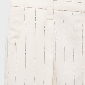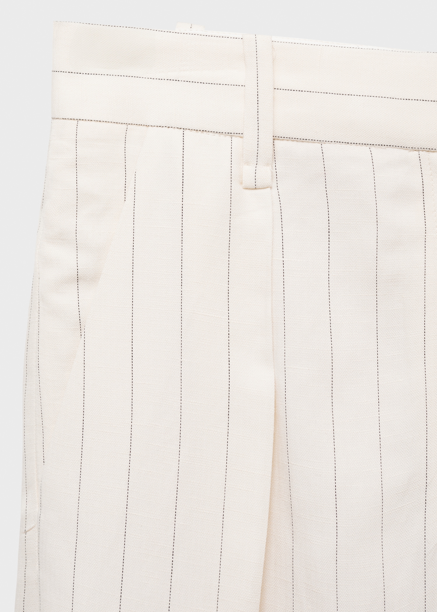 Linen blend fabric. Midi design. Straight Design. Striped print. Mid-rise. Belt loops. Front pleat detail. Two side pockets. Concealed button, hook and zipper front closure with placket. Total look. Promotional product
