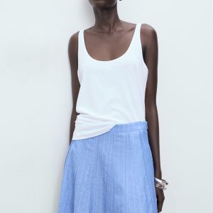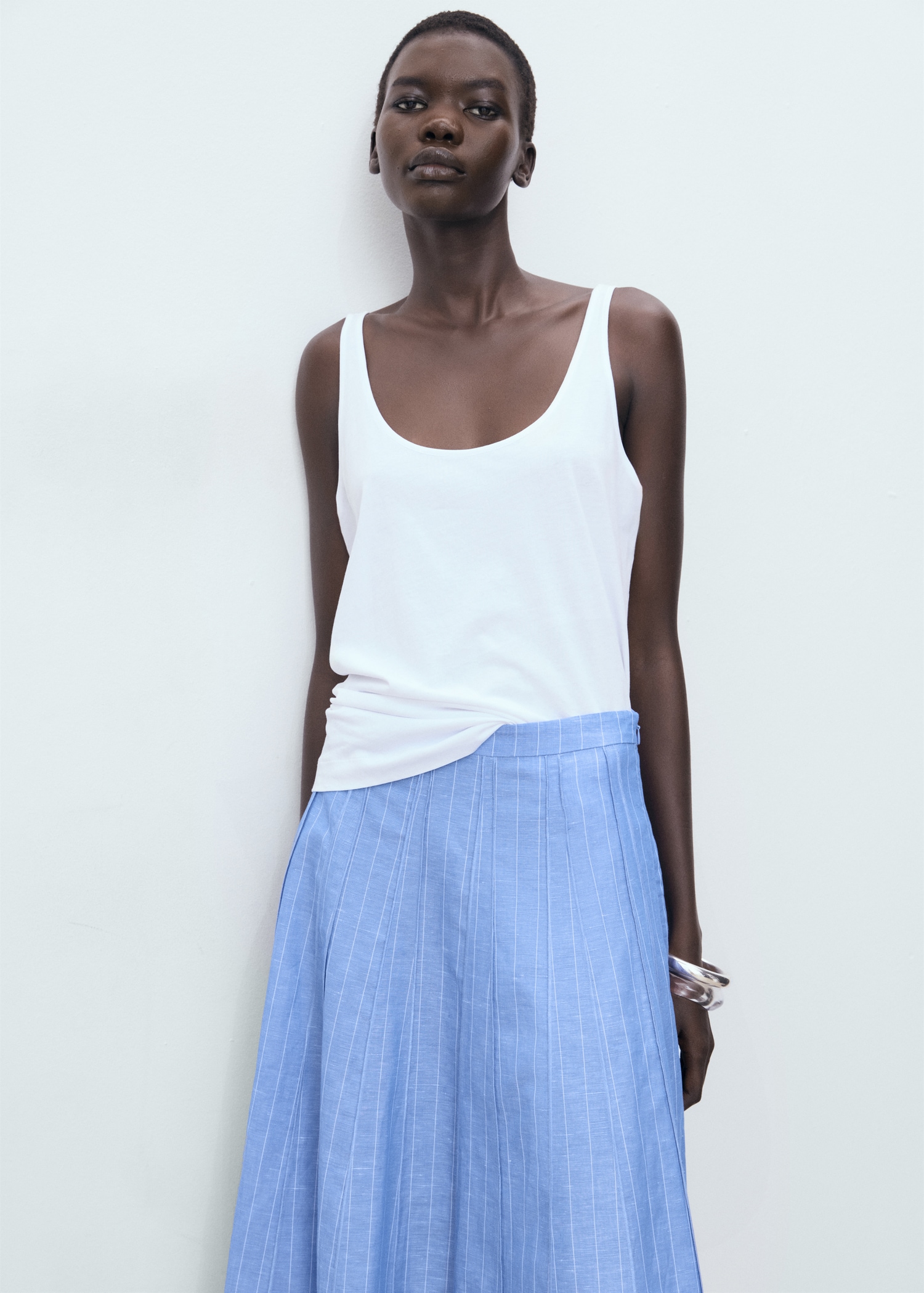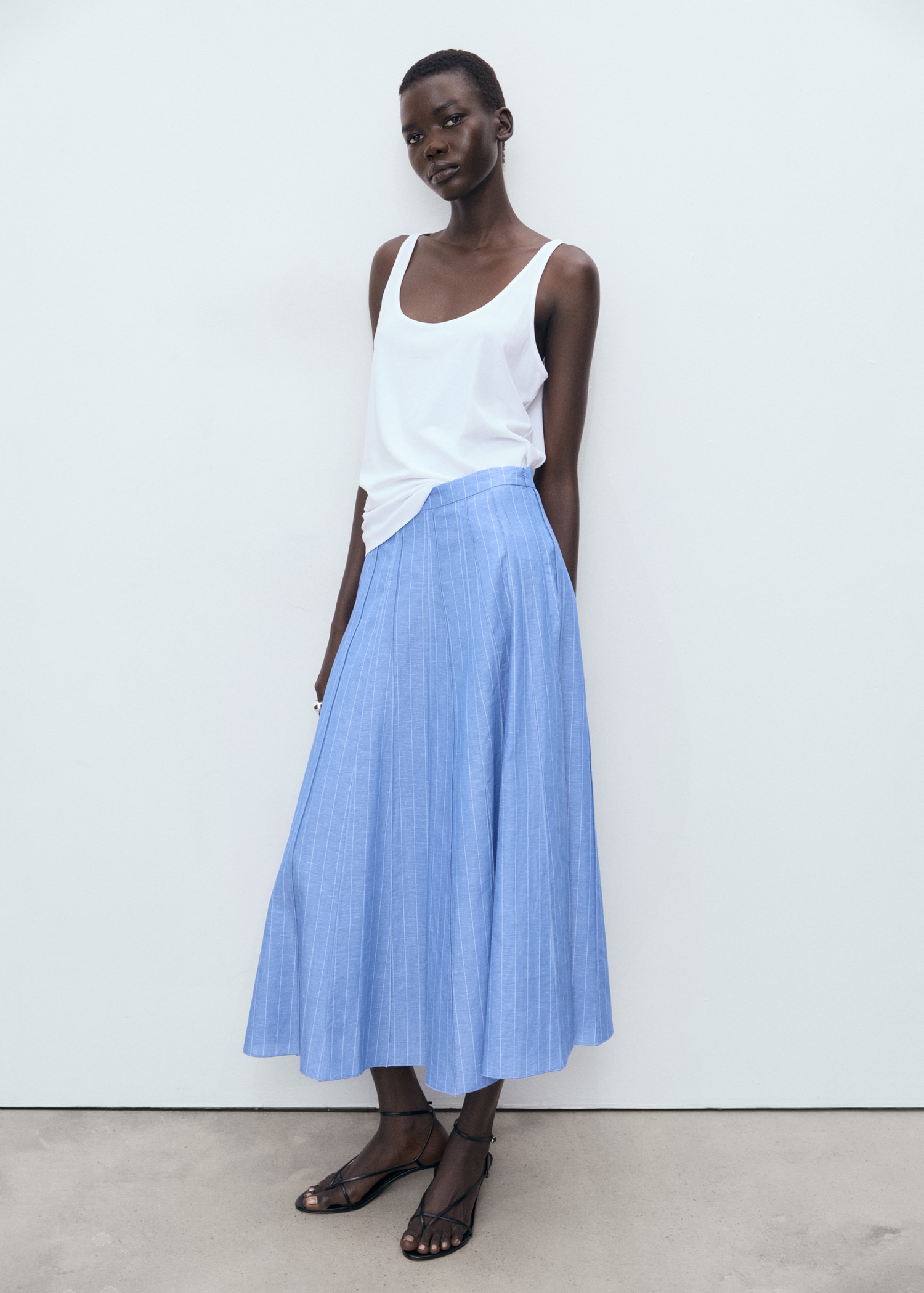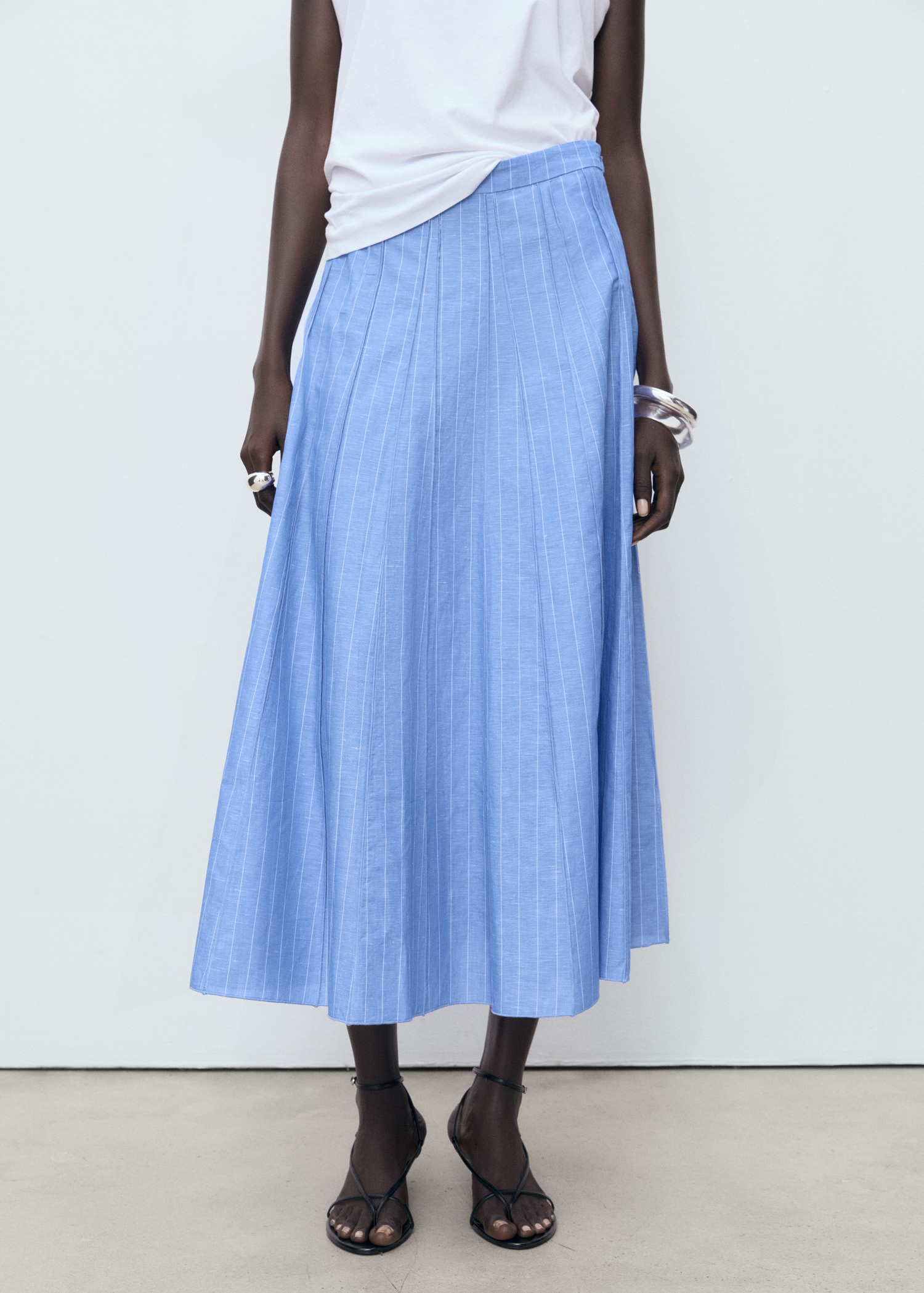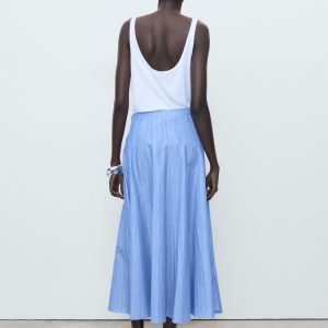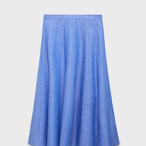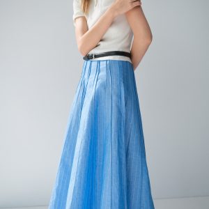 This skirt, crafted from a blend of linen and cotton, offers a fresh and comfortable design. It features a midi-cut and a waist fit that flatters the silhouette. Its flared design allows freedom of movement. It is a versatile garment, suitable for both casual and more formal styles