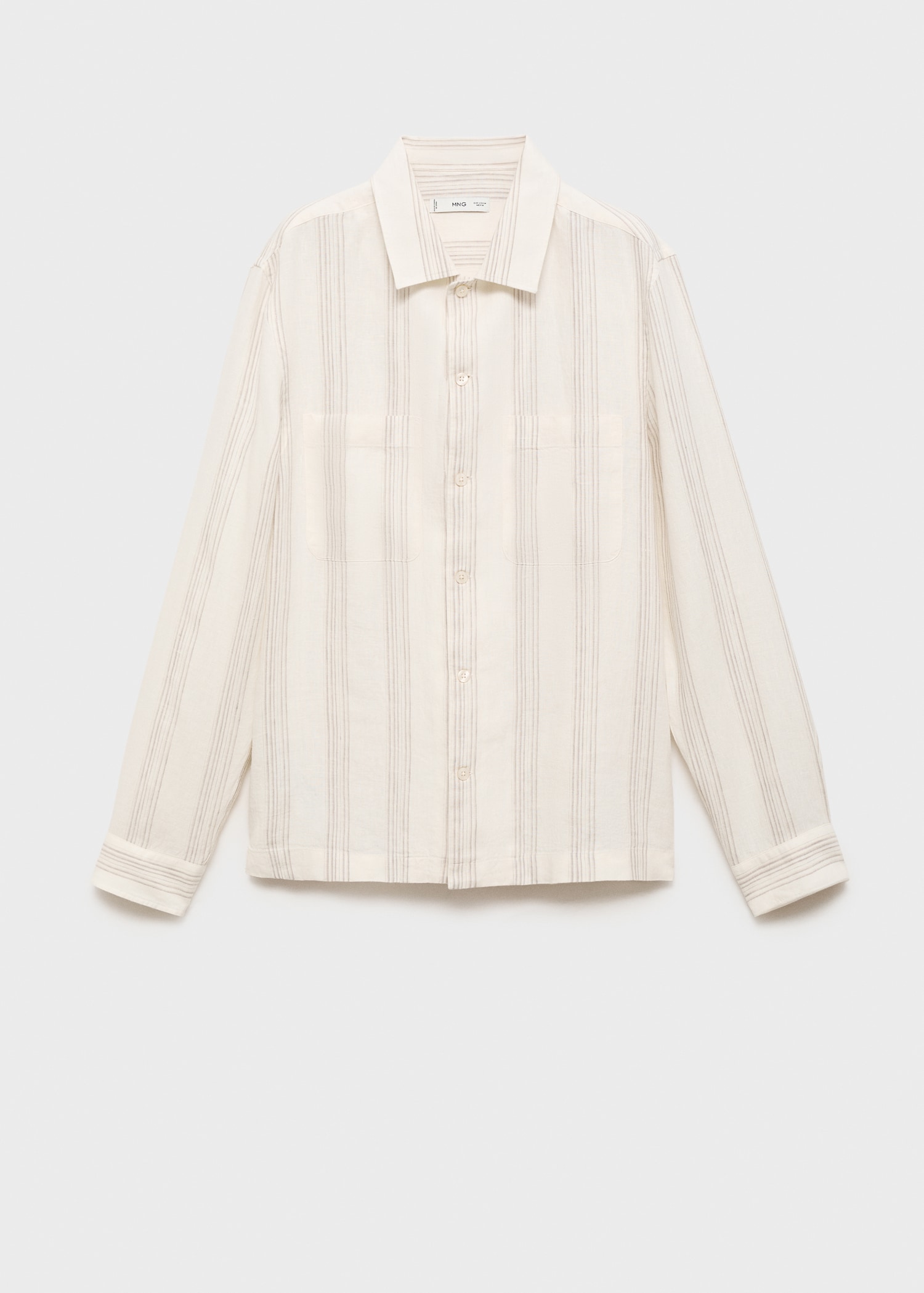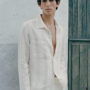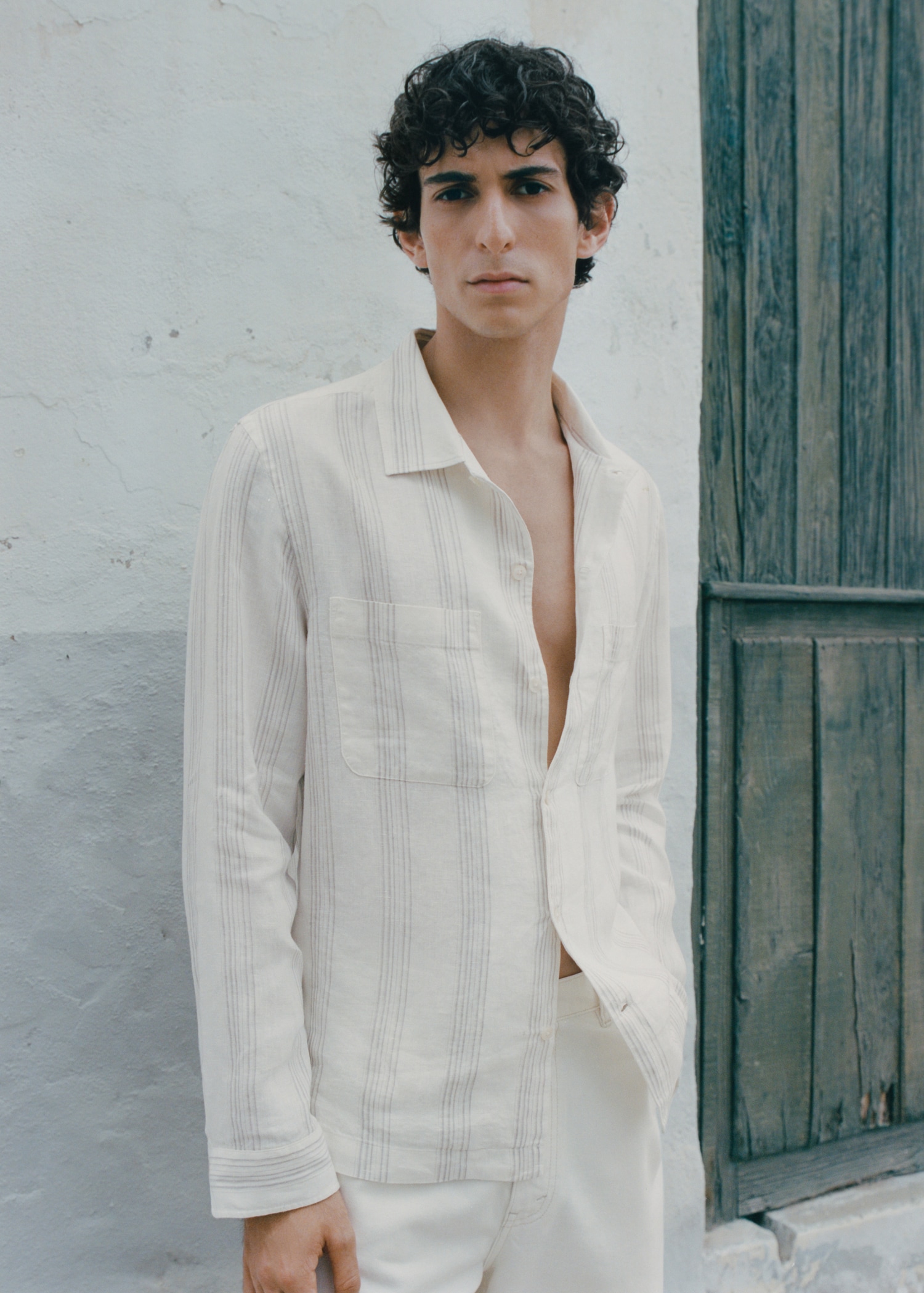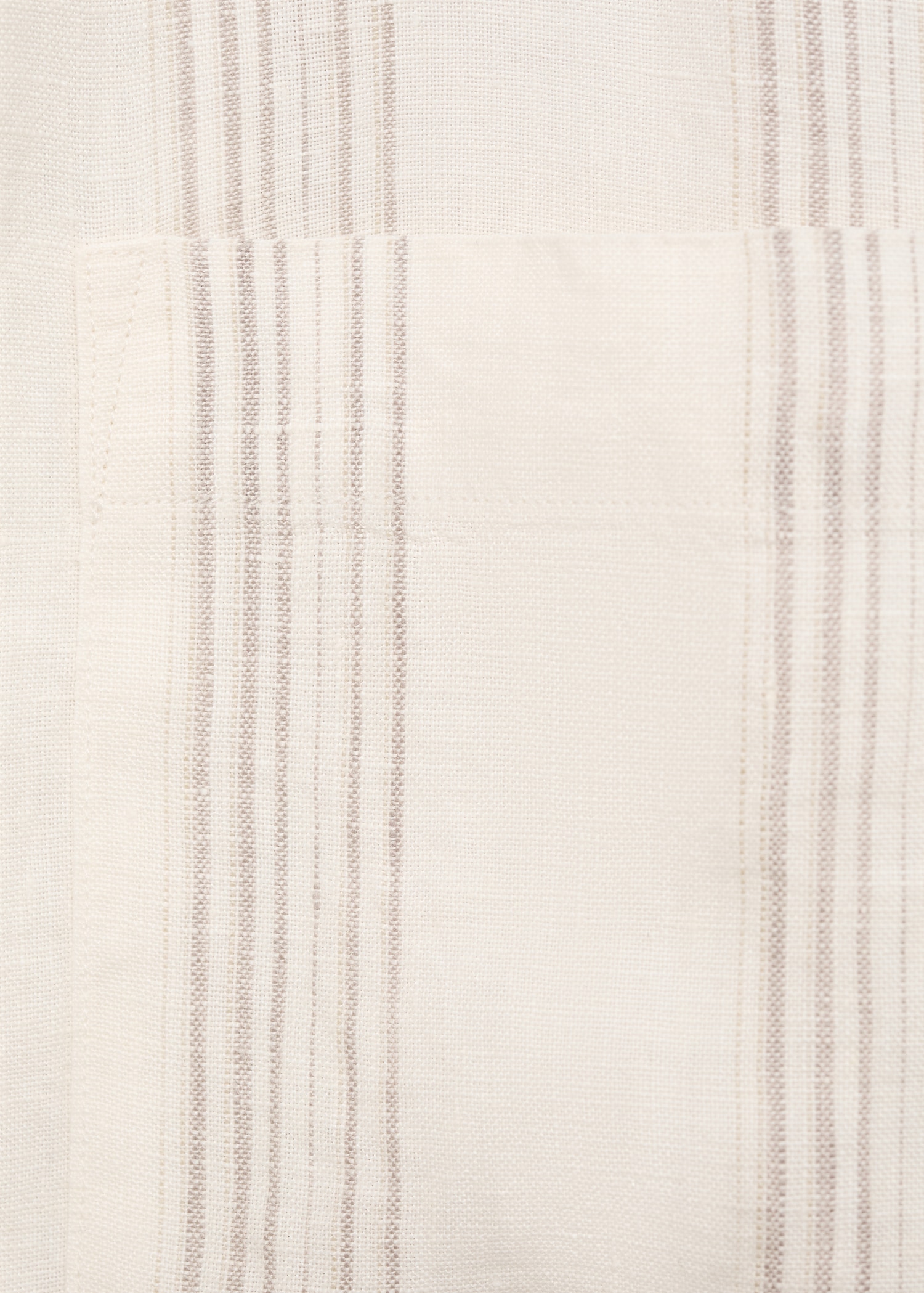 100% Linen. Regular Silhouette. Shirt collar. Front button closure. Two patch pockets at chest. Back dart detail. Buttoned cuffs. Straight hem. Set available as total look. Promotional product