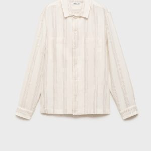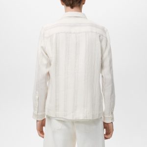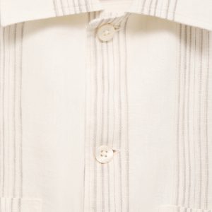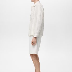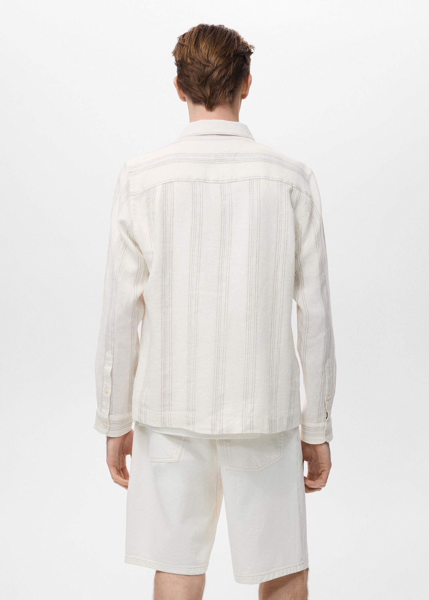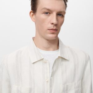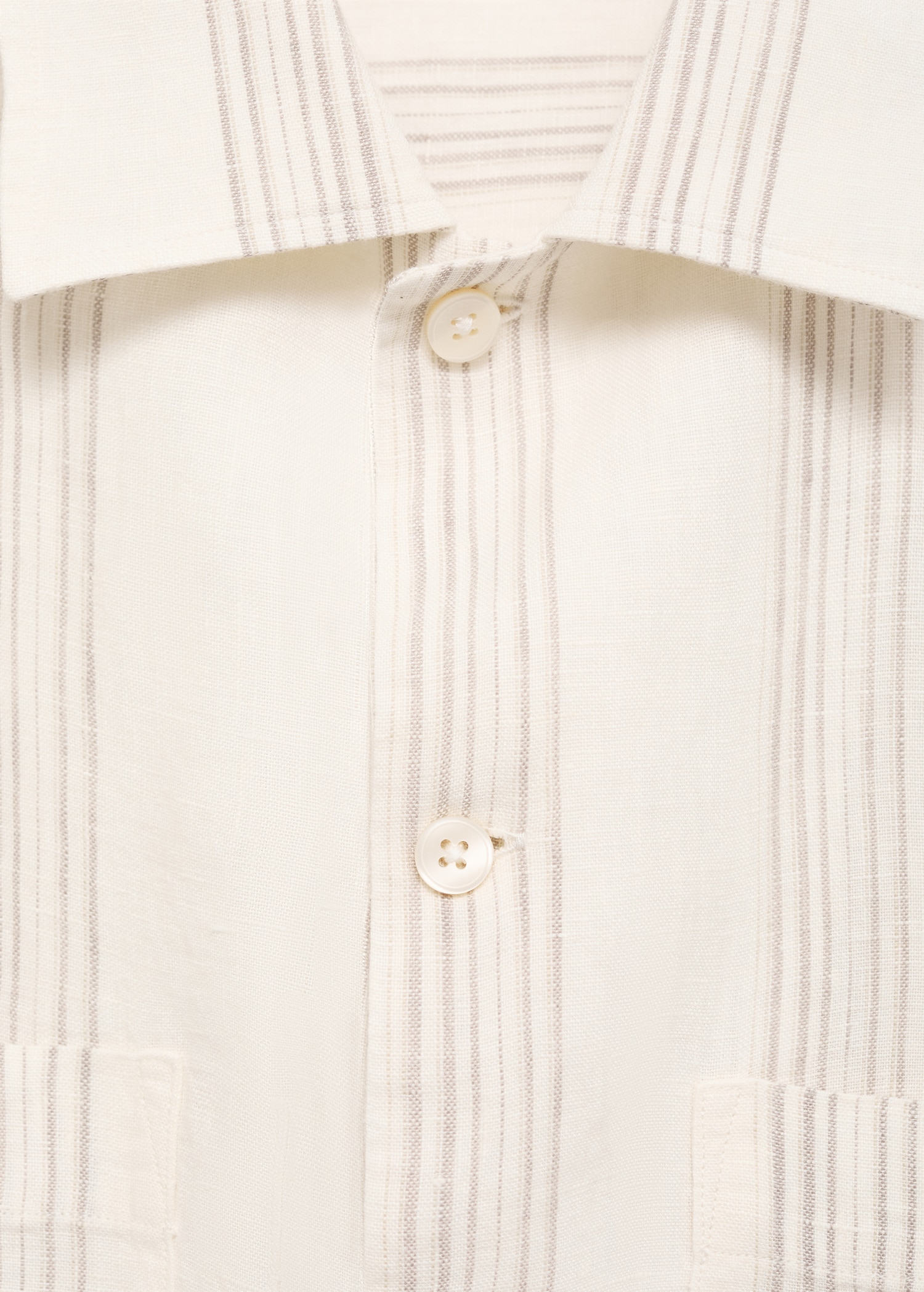 100% Linen. Regular Silhouette. Shirt collar. Front button closure. Two patch pockets at chest. Back dart detail. Buttoned cuffs. Straight hem. Set available as total look. Promotional product