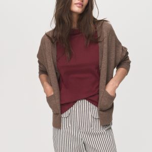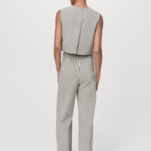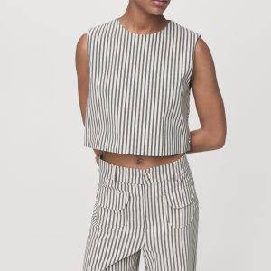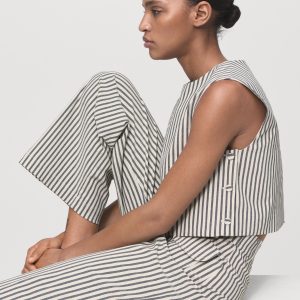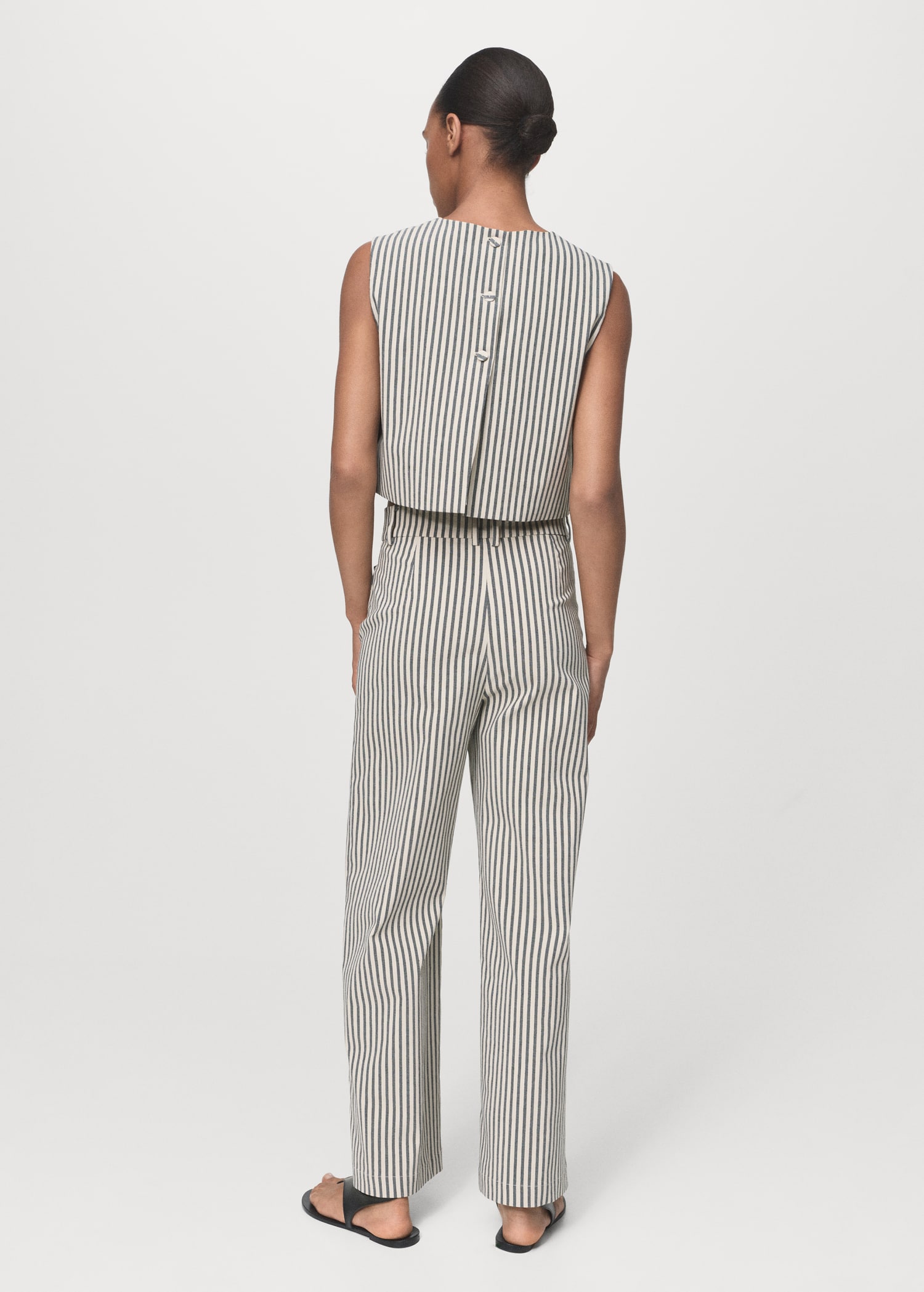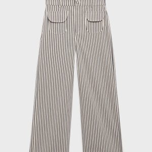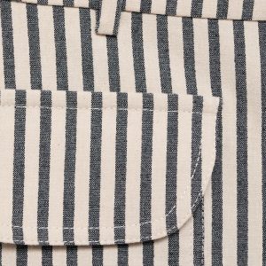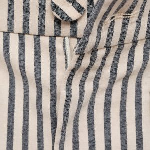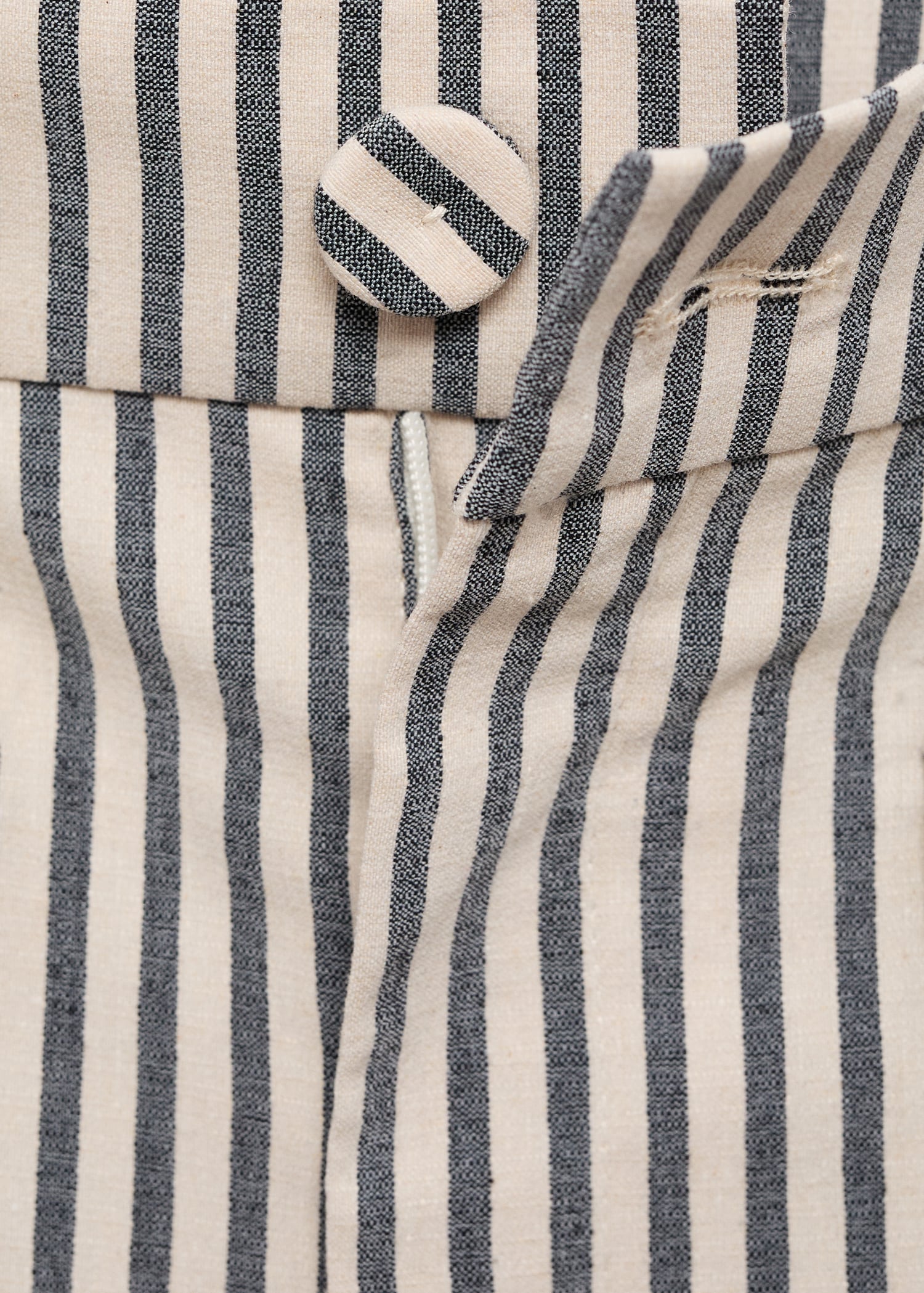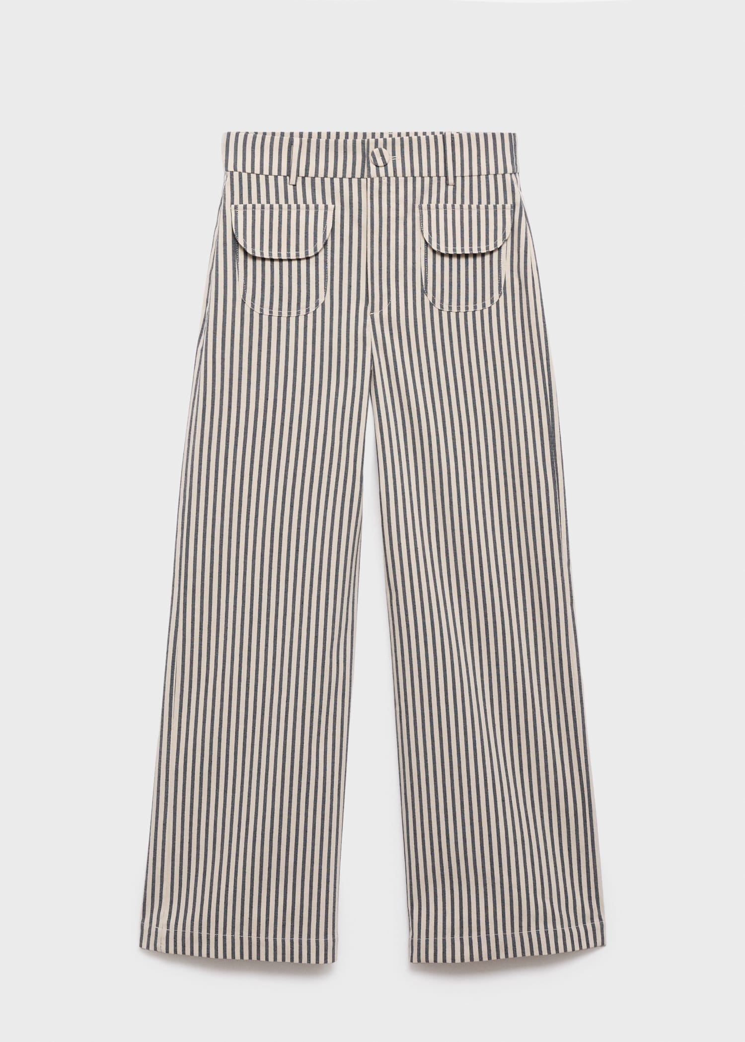 Cotton blend fabric. Long design. Straight Design. Striped design. High-rise. Belt loops. Two patch pockets and front flap pockets. Button and zipper closure. 100% cotton lining. Total look