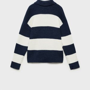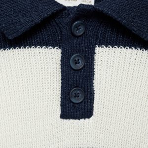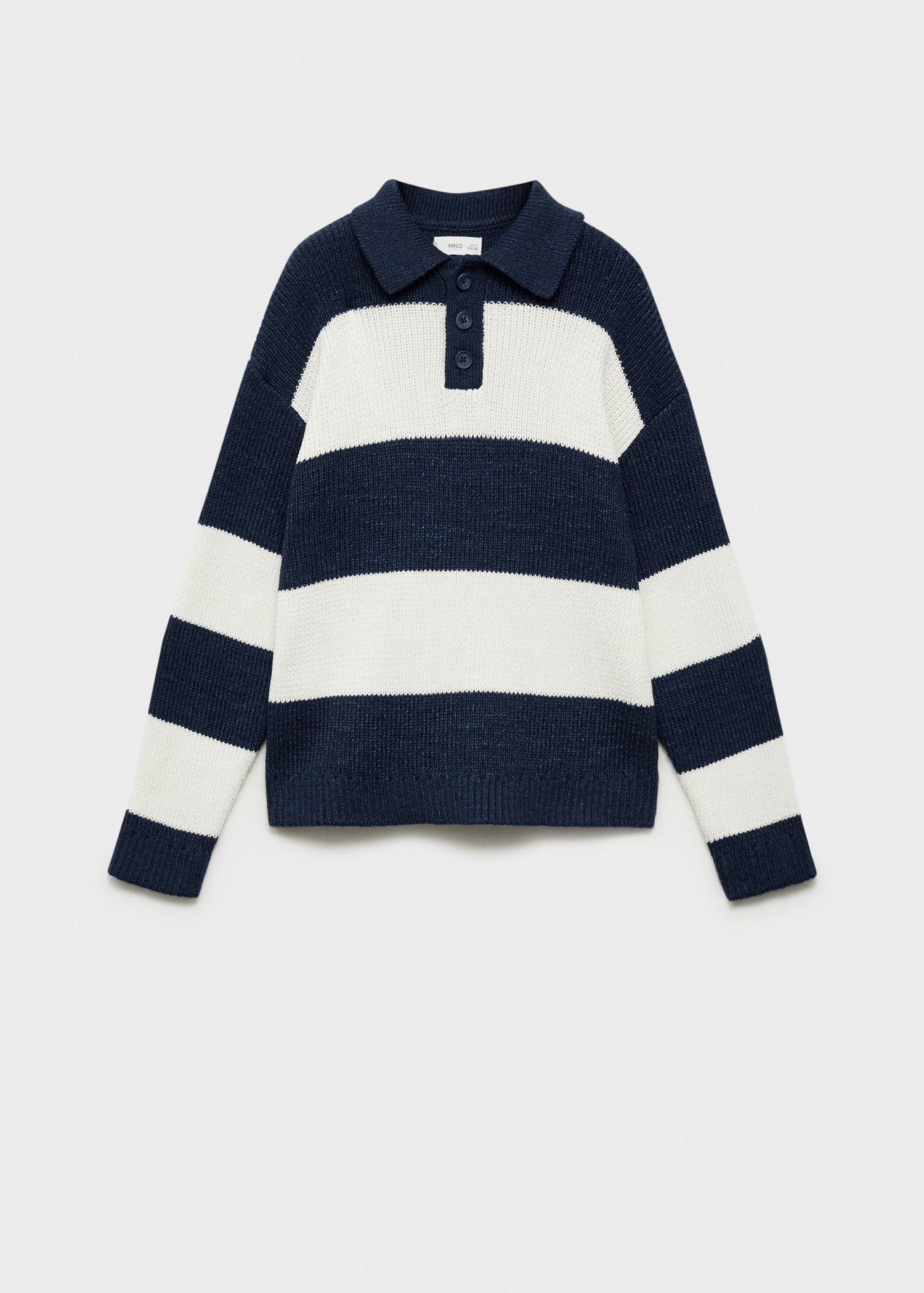 Cotton fabric. Midpoint. Striped design. Straight Design. Polo collar. Long Sleeve. Contrast ribbed cuffs and hem. Front button closure