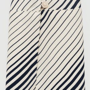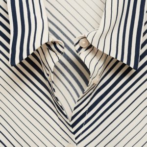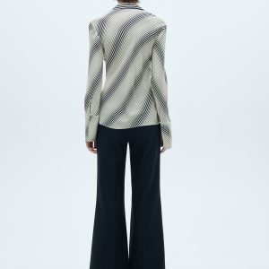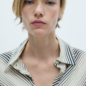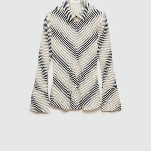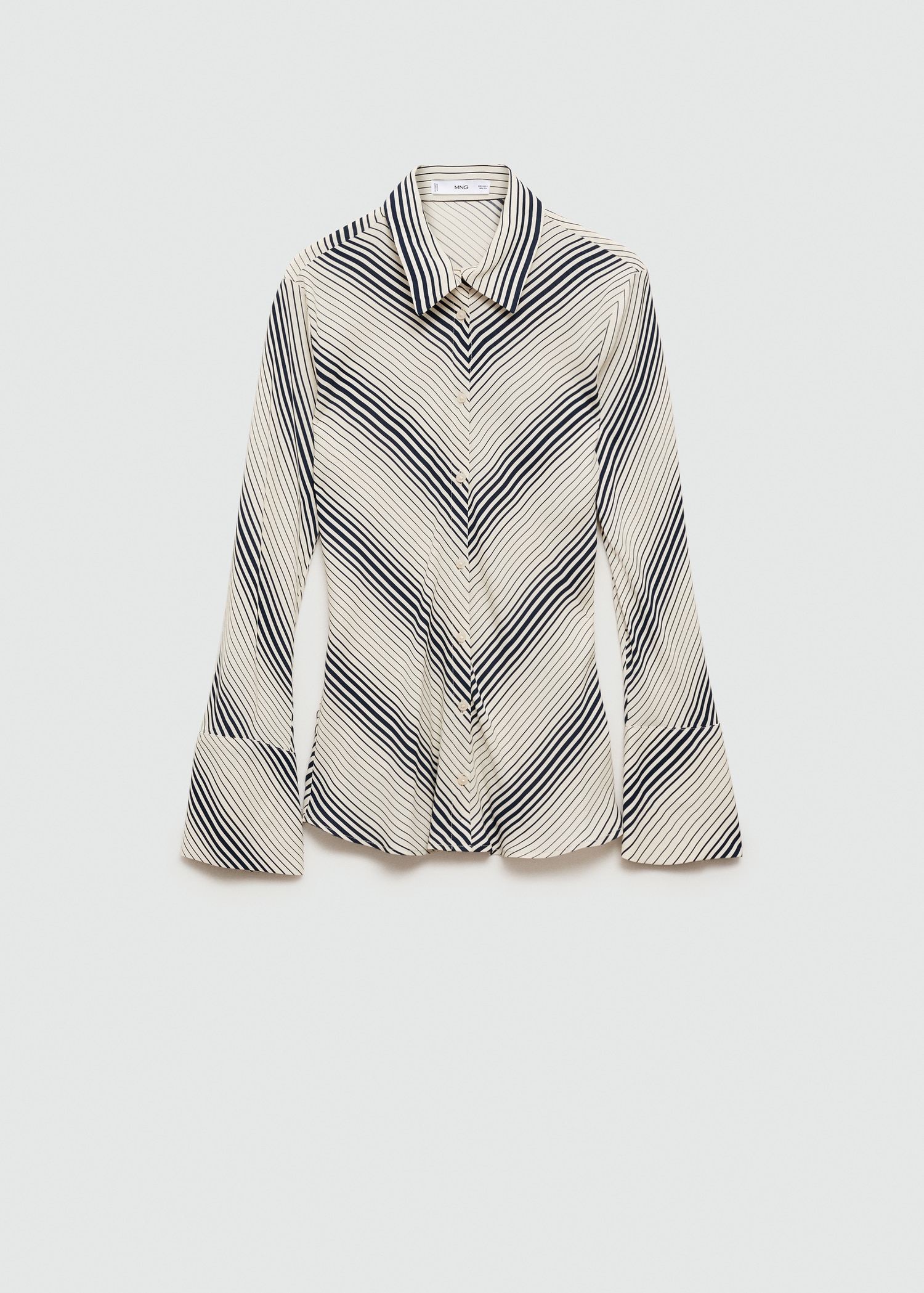 Fluid fabric. Fitted design. Striped print. Shirt collar. Long flared sleeve. Button closure at the front. Long buttoned sleeves