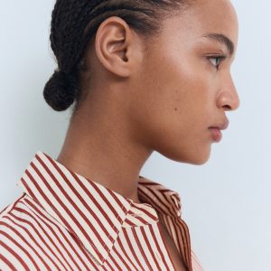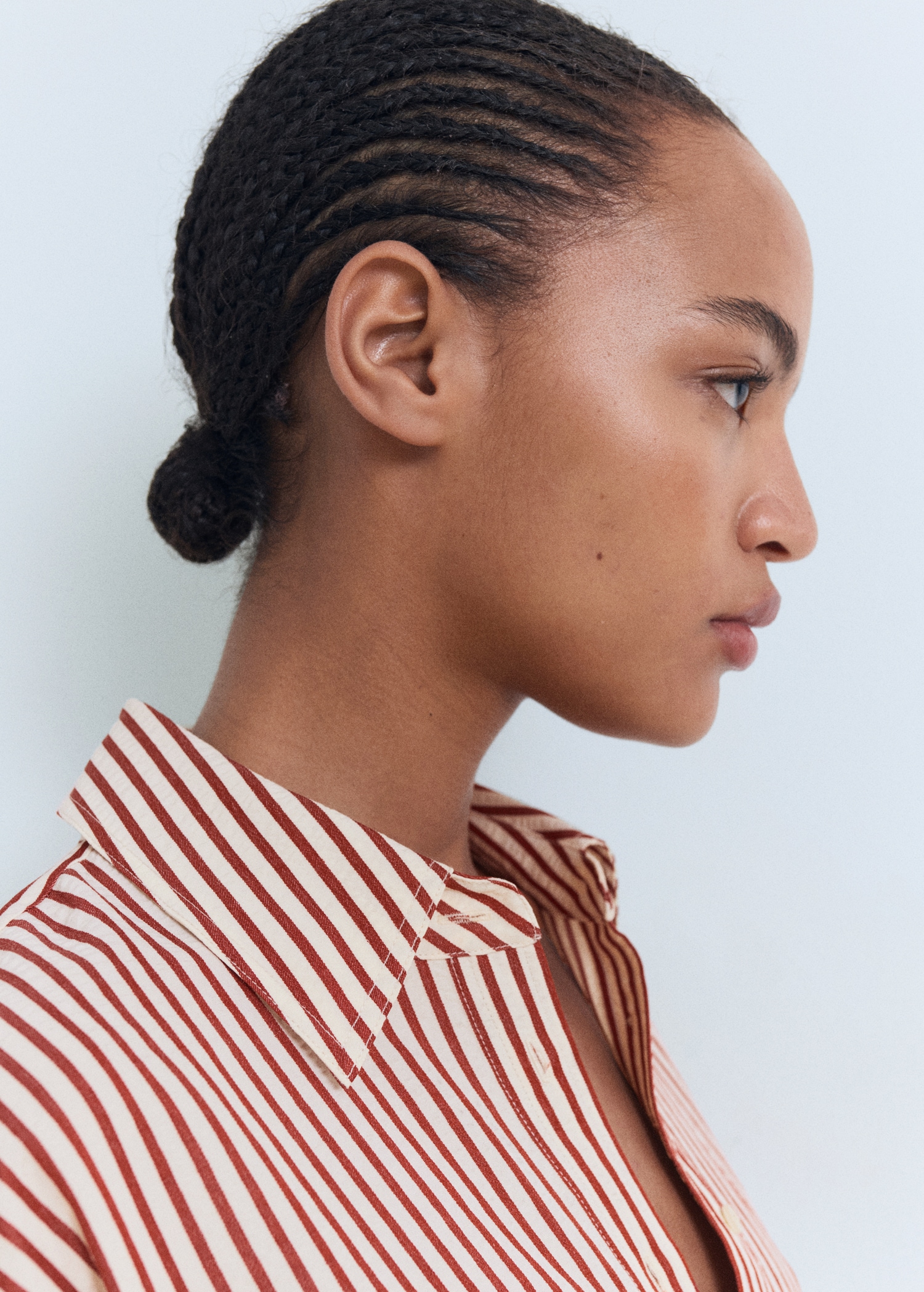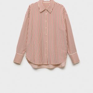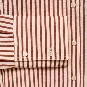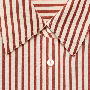With a straight design and stripes, this garment features a shirt collar and long sleeves. It comes with matching pants for a total look