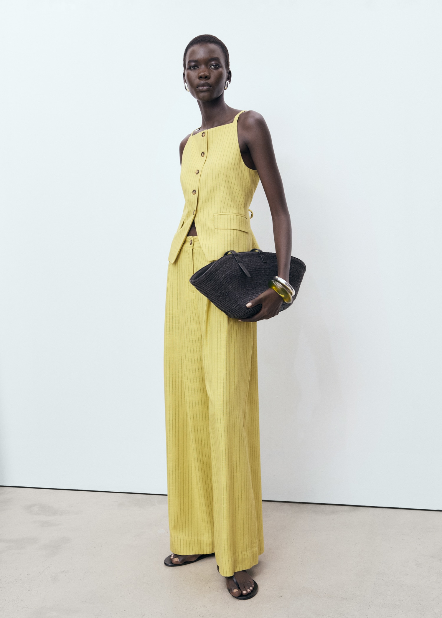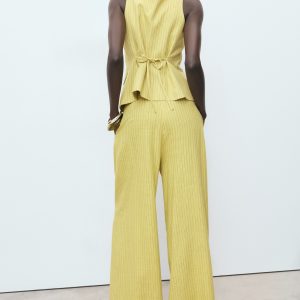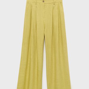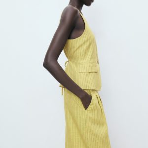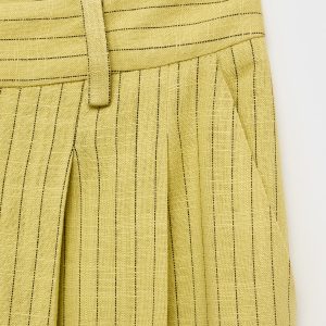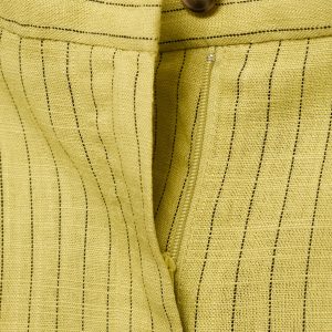 Linen and lyocell blend fabric. Long design. Straight Design. Striped design. High-rise. Dart detail. Two side pockets. Button and zipper closure. Total look