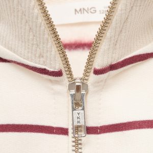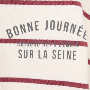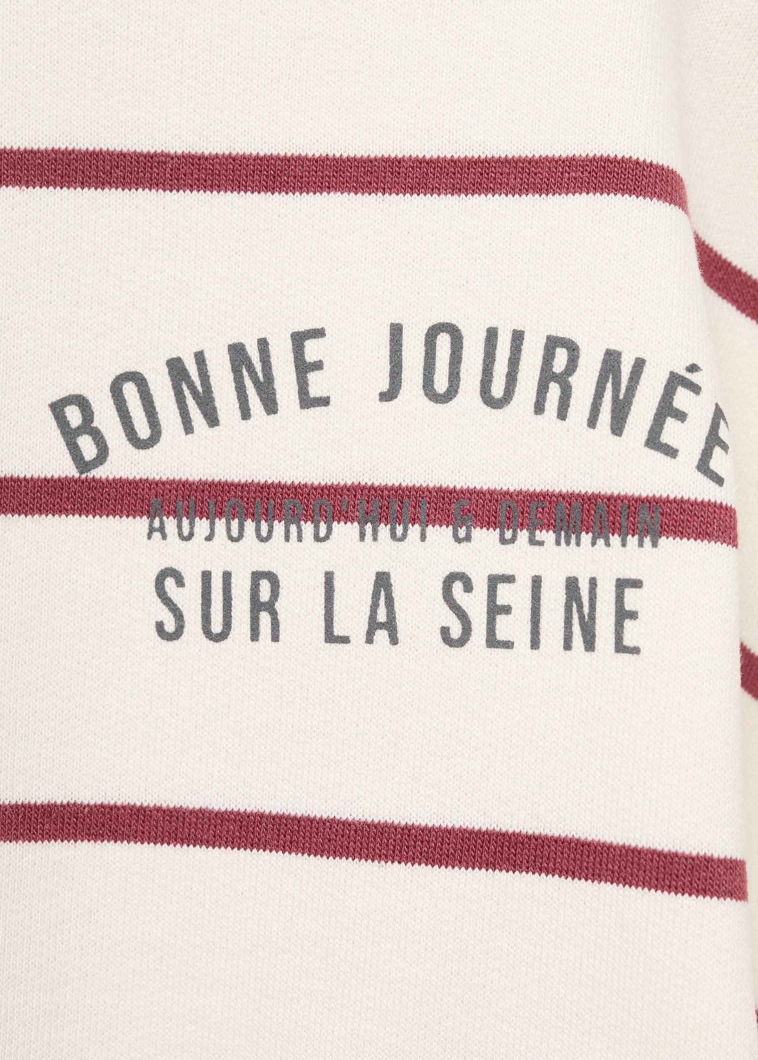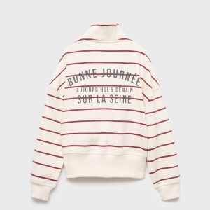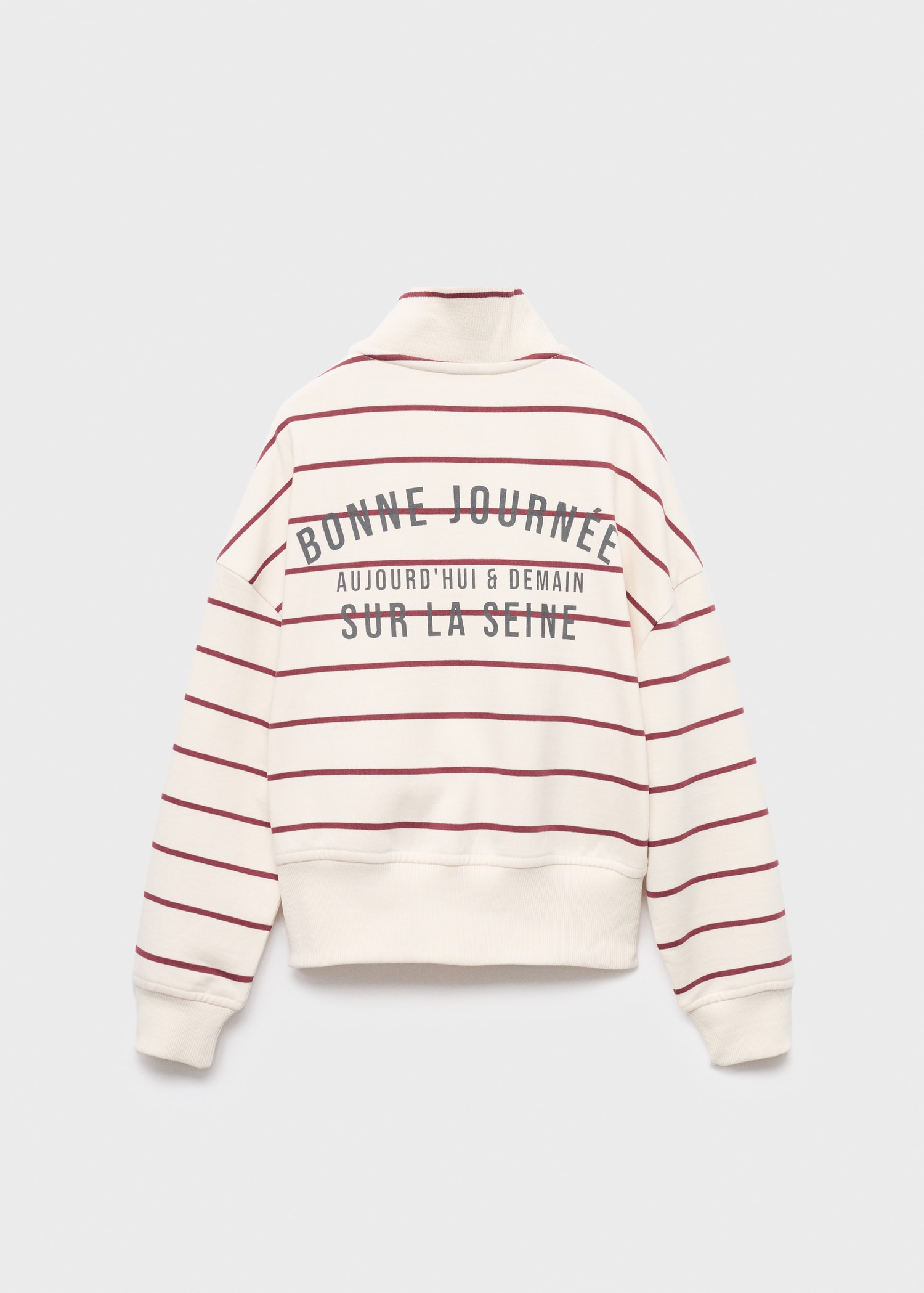 Cotton fabric. Striped design. Printed design. Text stamped on the front and back. Perkins neck with zipper. Long Sleeve