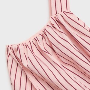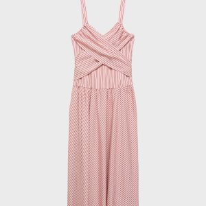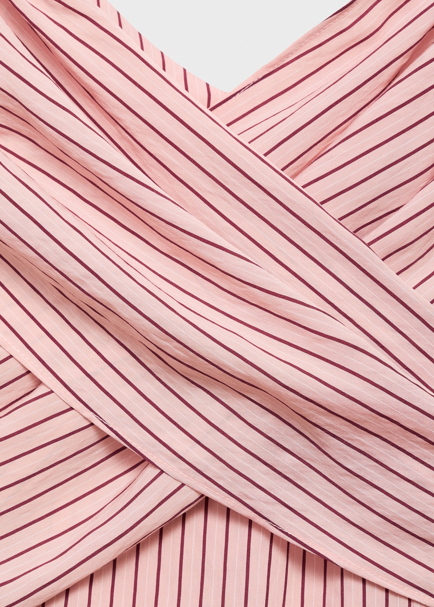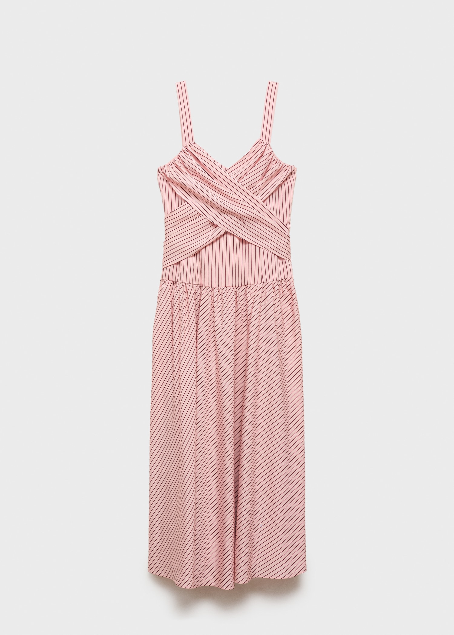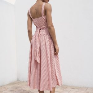 Midi design. A-line design. Striped design. Low neckline. Crossover neckline with a knot at the back. Sleeveless. Wide straps. Side zip closure. 100% cotton lining. This garment is part of our casual collection, designed to stylishly accompany you in your day-to-day life