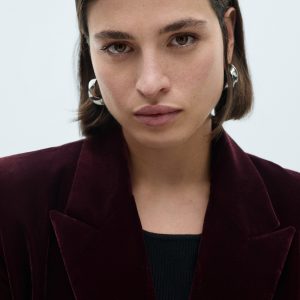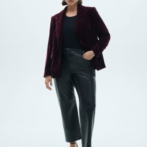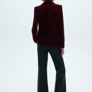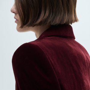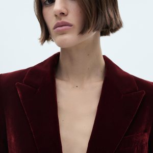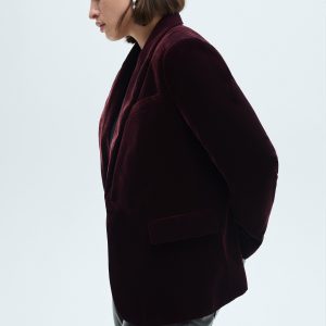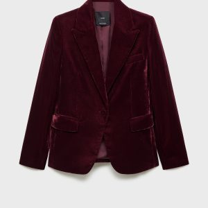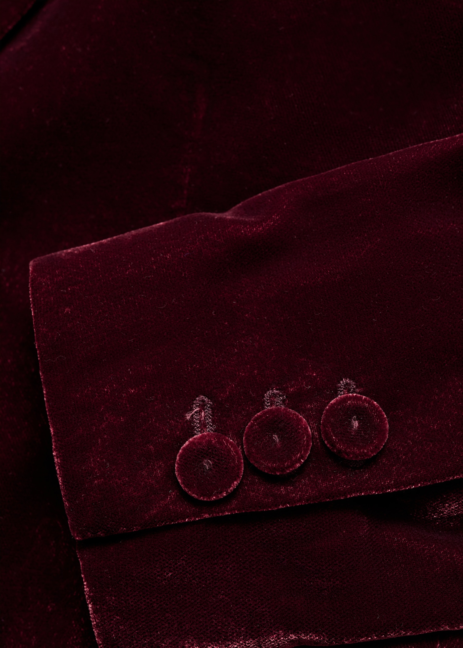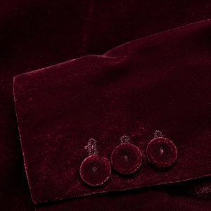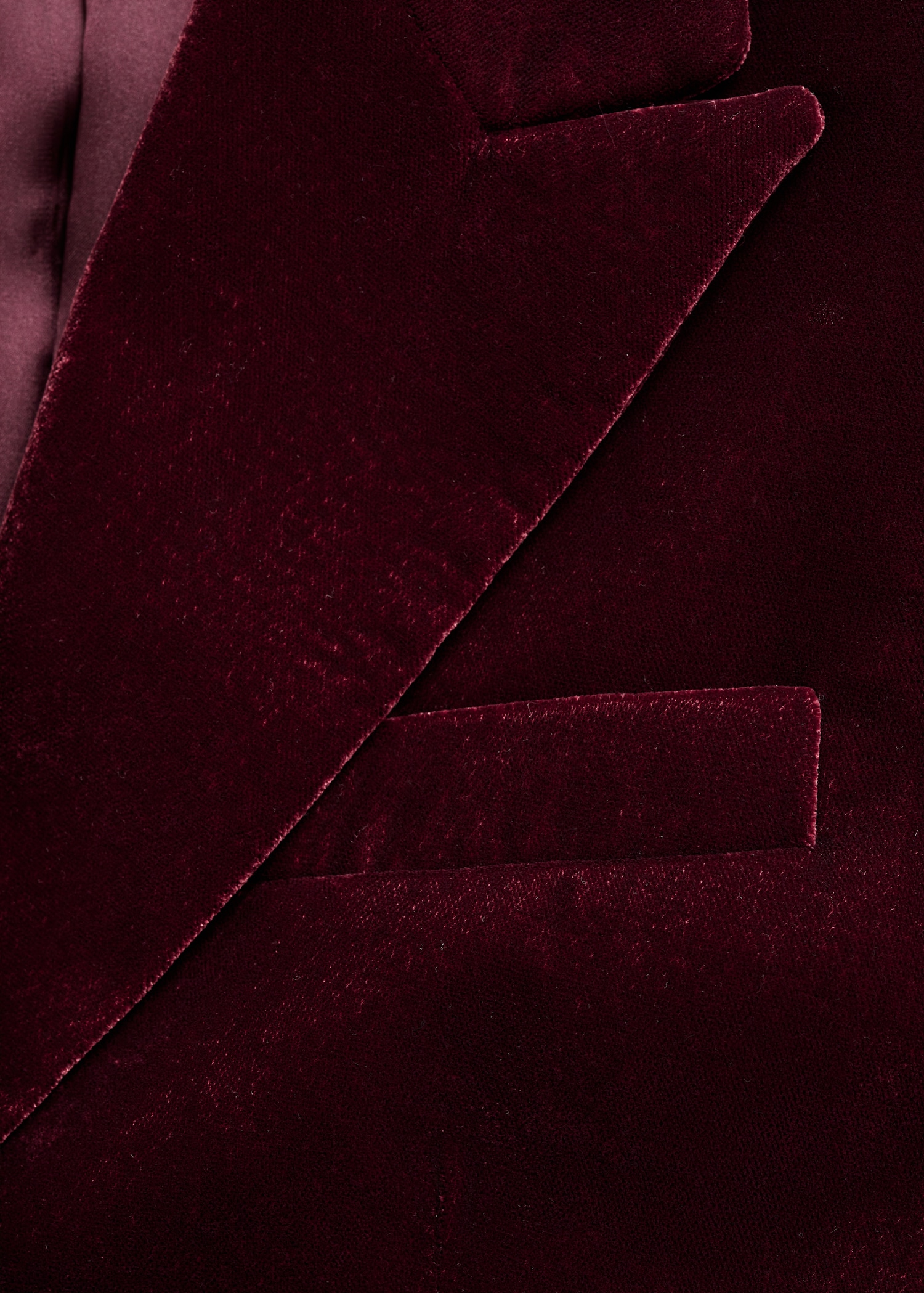 Velvet fabric. Straight Design. Long design. Lapel-collar V-neck collar. Notch lapels. Long Sleeve. Two front welt and flap pockets. Chest welt pocket. Front button closure. Inner lining. The fuchsia color is an online exclusive. Available Plus. Party and ceremony collection