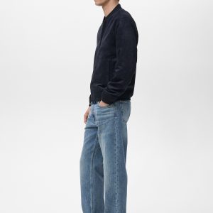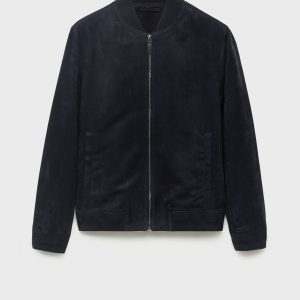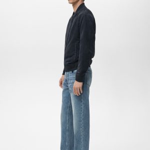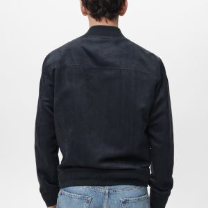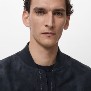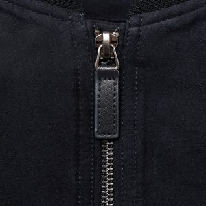 Straight silhouette. Bomber style. Zipper closure. Two side pockets. Ribbed finish on neck, cuffs, and hem