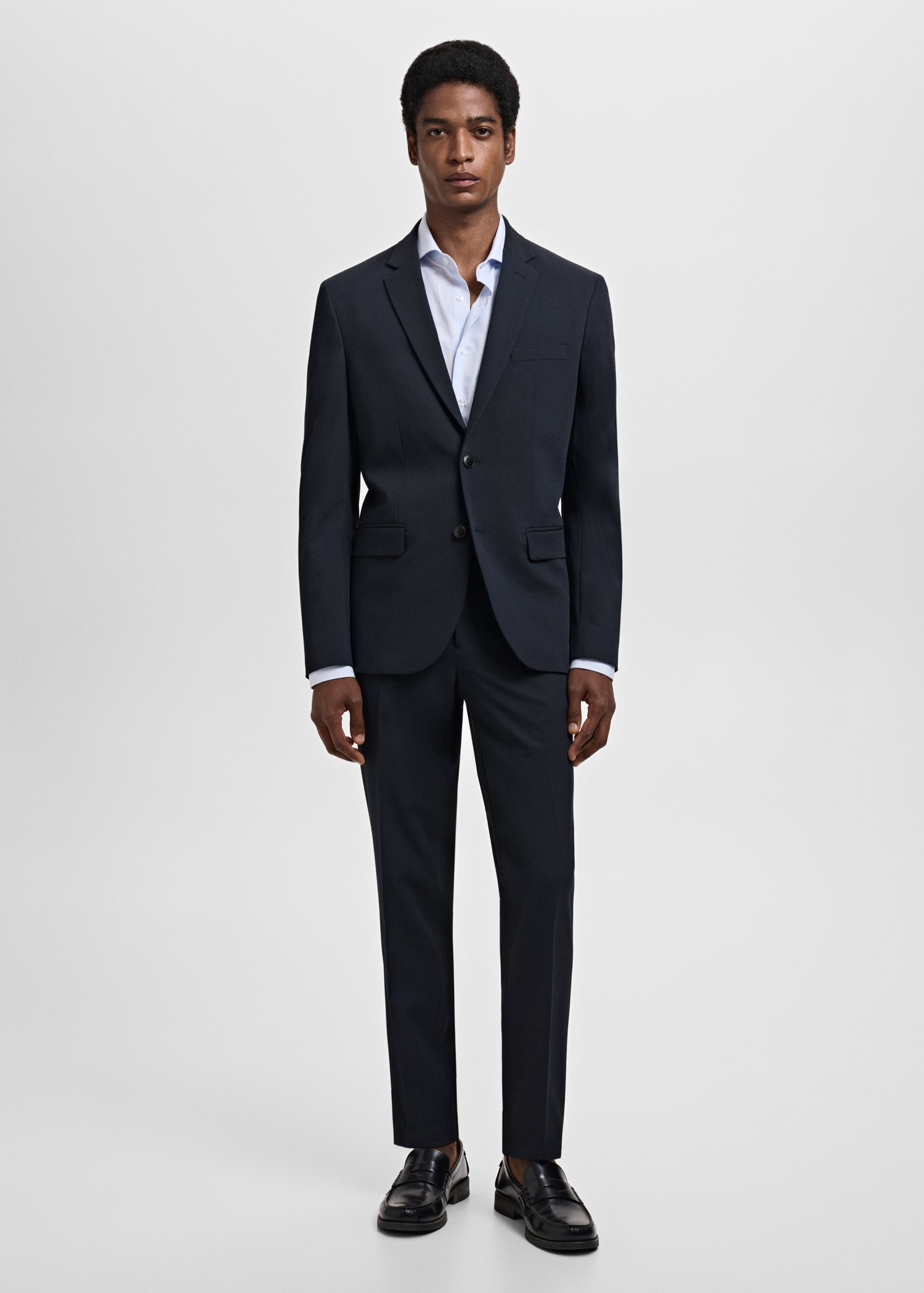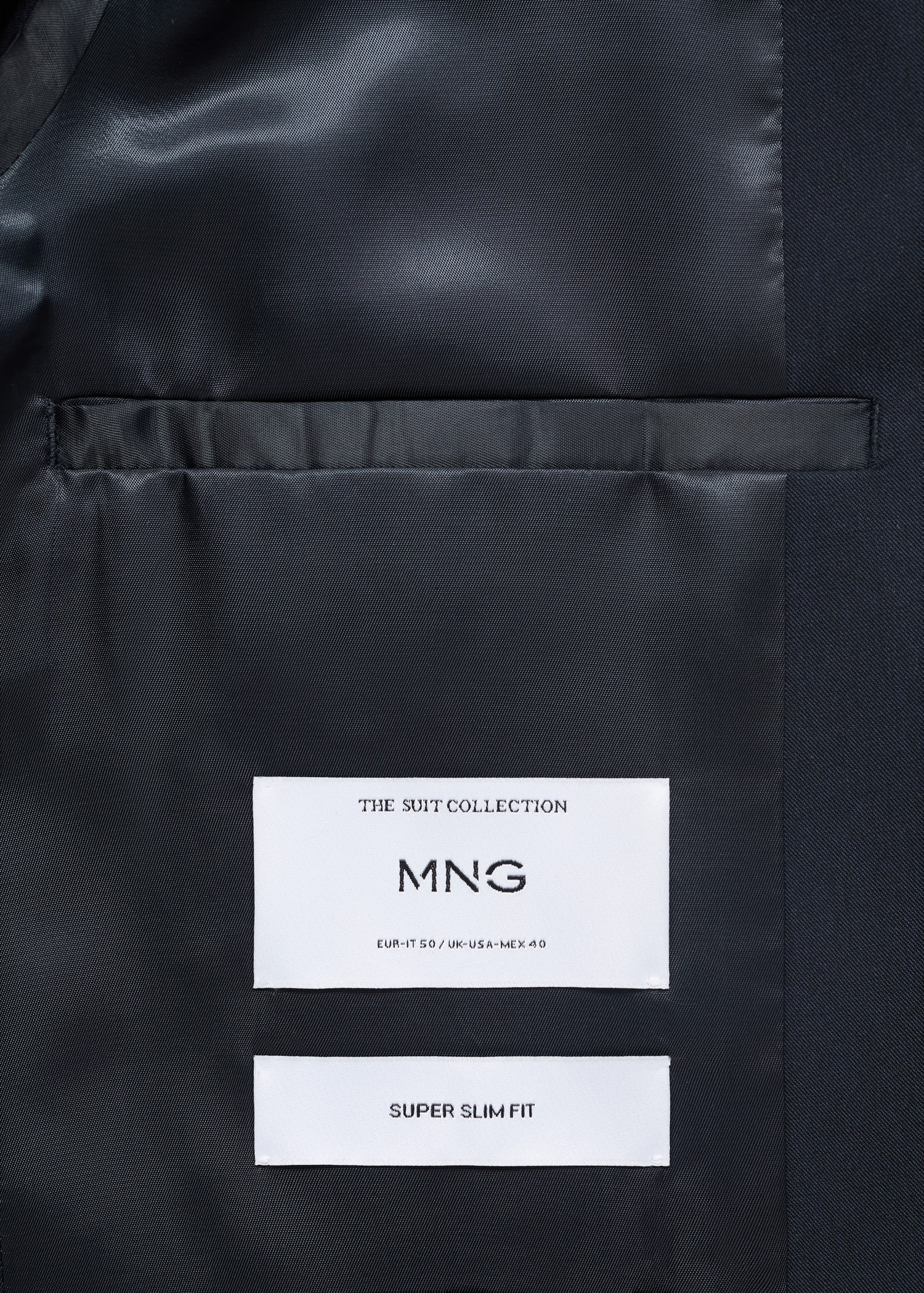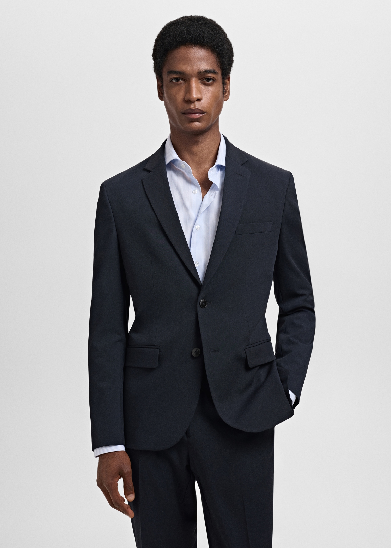 Notch lapels and buttonhole. Front button closure. One welt pocket on the chest. Two flap pockets on the front. Buttoned cuff straps. Hem with two side slits. Interior pocket. Inner lining. Super slim fit. Comfort Stretch: Stretch fabric that provides extra comfort. Standard Length. Stretch fabric providing maximum comfort and freedom of movement. Long Sleeve. Two-button closure at the front. Notched lapel collar. Light Flat Structure. Chest welt pocket. Front Closure Location. Long sleeves with buttoned cuffs. Neck lapel Regular. Two welt pockets with flaps on the front. Long buttoned sleeve. Double back slit. Padding Lining Only Lining. Inner lining. Double back vent at the hem. Silhouette Super Slim Fit. Interior pockets. Tailoring collection. Comfort: Horizontal and vertical stretch fabric for added comfort