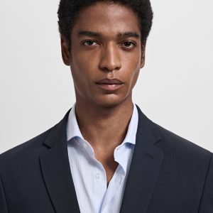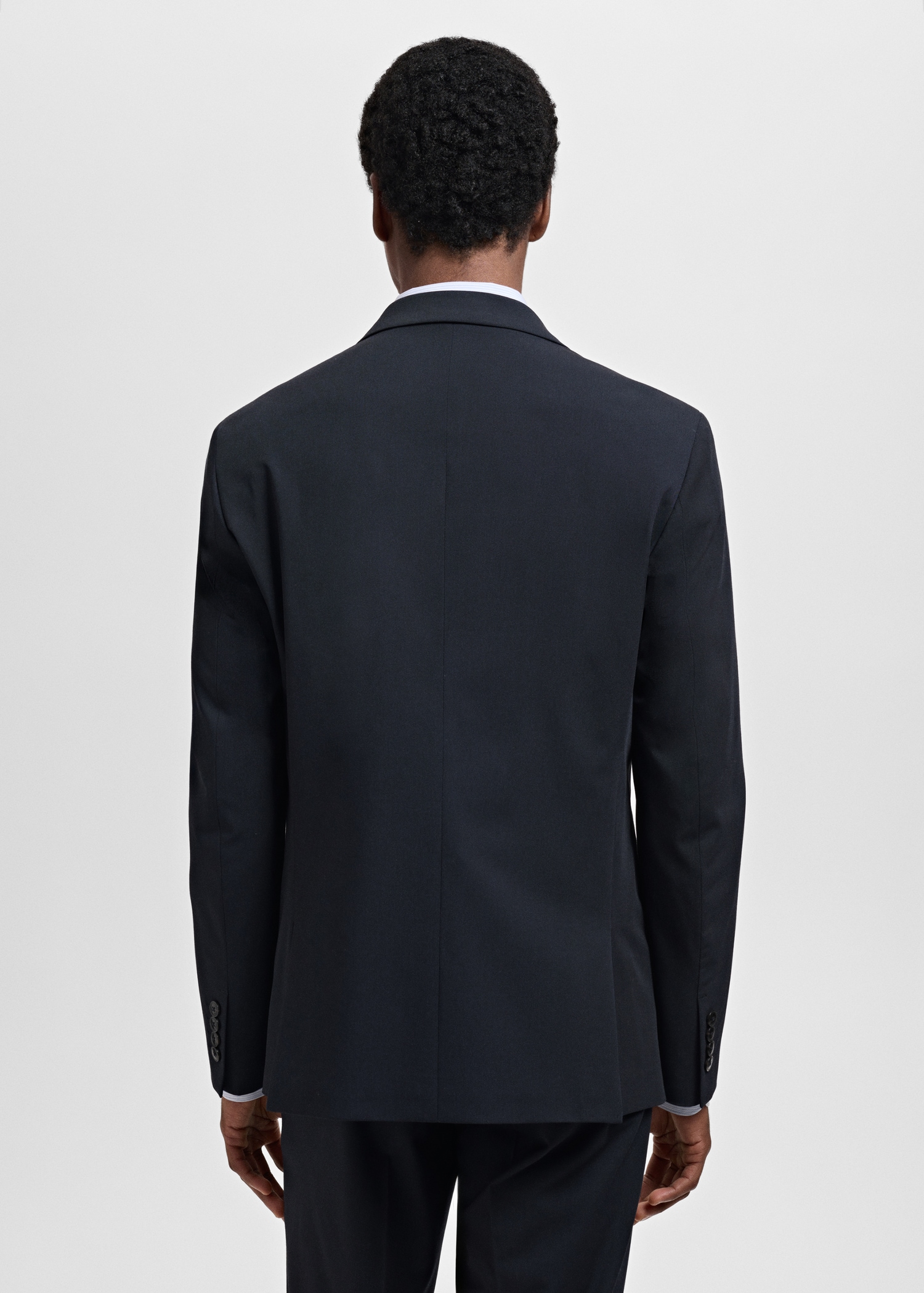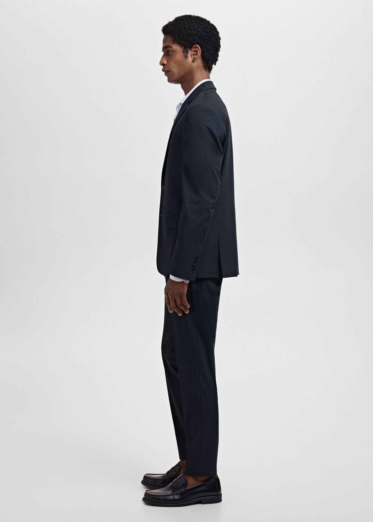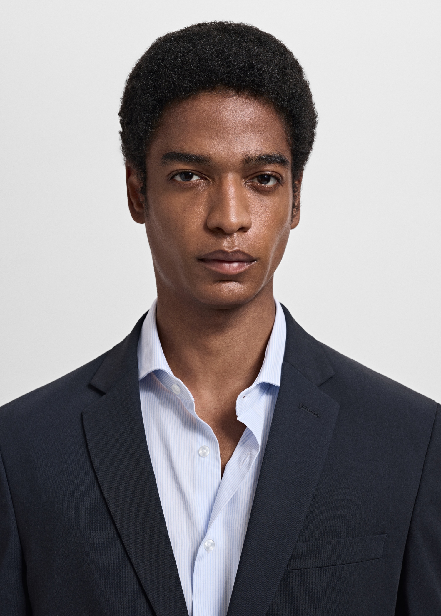 Notch lapels and buttonhole. Front button closure. One welt pocket on the chest. Two flap pockets on the front. Buttoned cuff straps. Hem with two side slits. Interior pocket. Inner lining. Super slim fit. Comfort Stretch: Stretch fabric that provides extra comfort. Standard Length. Stretch fabric providing maximum comfort and freedom of movement. Long Sleeve. Two-button closure at the front. Notched lapel collar. Light Flat Structure. Chest welt pocket. Front Closure Location. Long sleeves with buttoned cuffs. Neck lapel Regular. Two welt pockets with flaps on the front. Long buttoned sleeve. Double back slit. Padding Lining Only Lining. Inner lining. Double back vent at the hem. Silhouette Super Slim Fit. Interior pockets. Tailoring collection. Comfort: Horizontal and vertical stretch fabric for added comfort